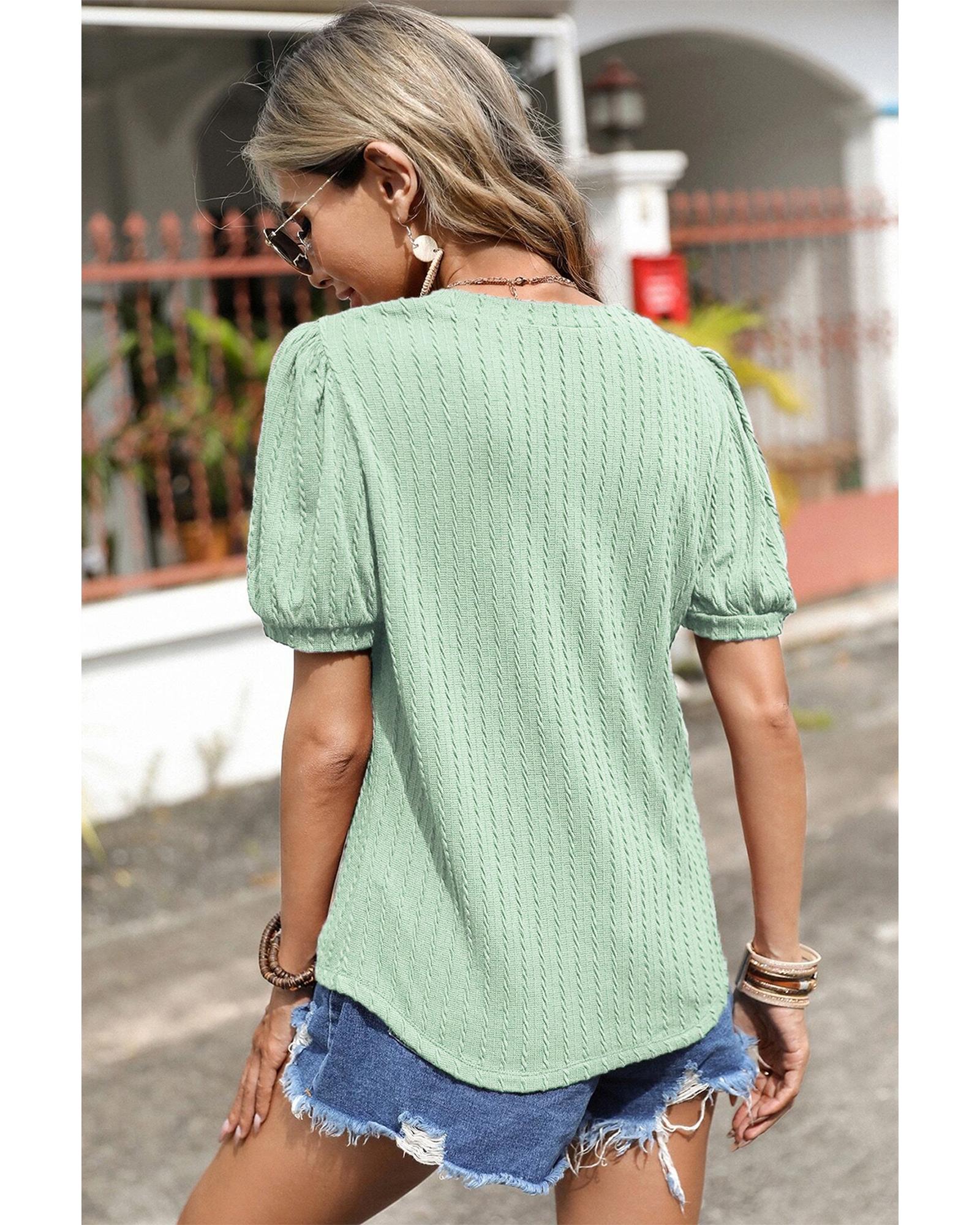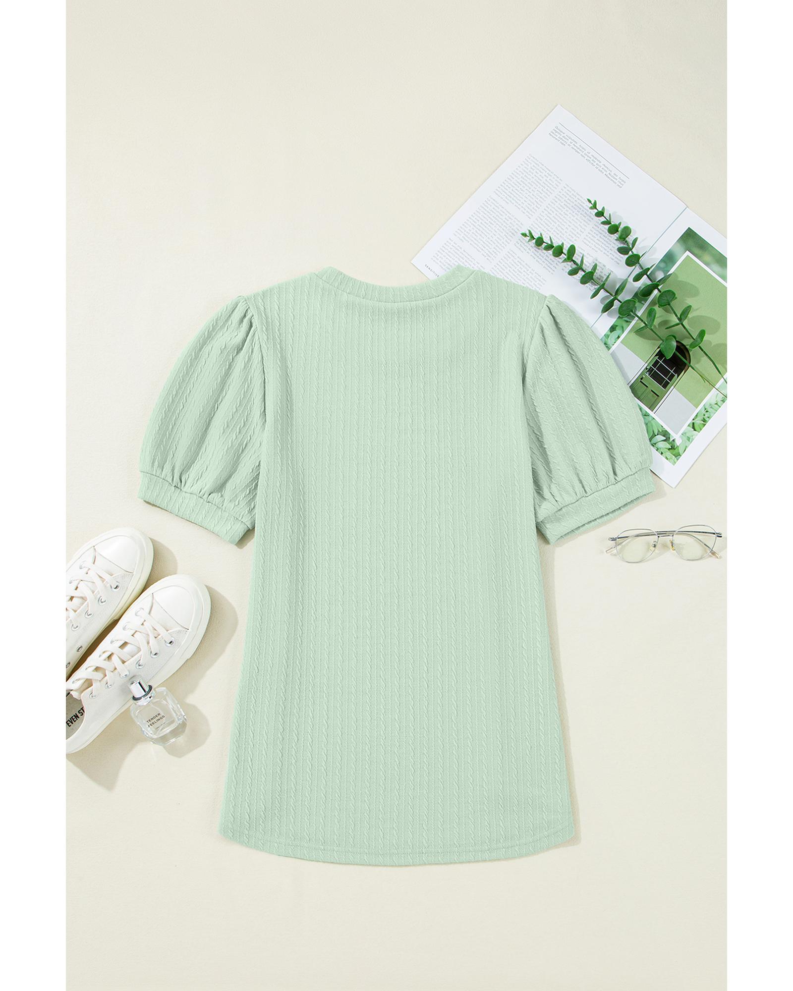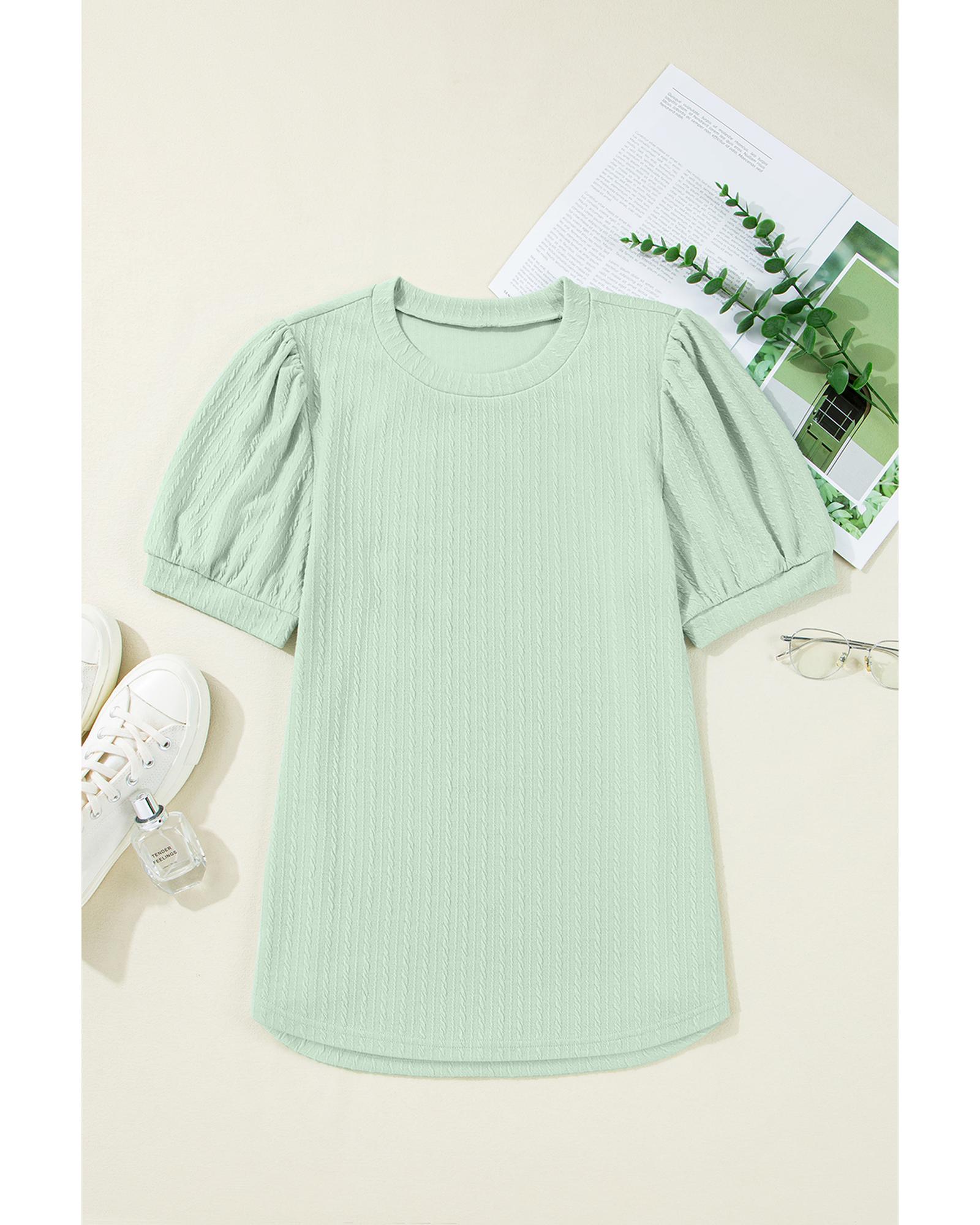 Mist Green Textured Round Neck Short Puff Sleeve Top – L