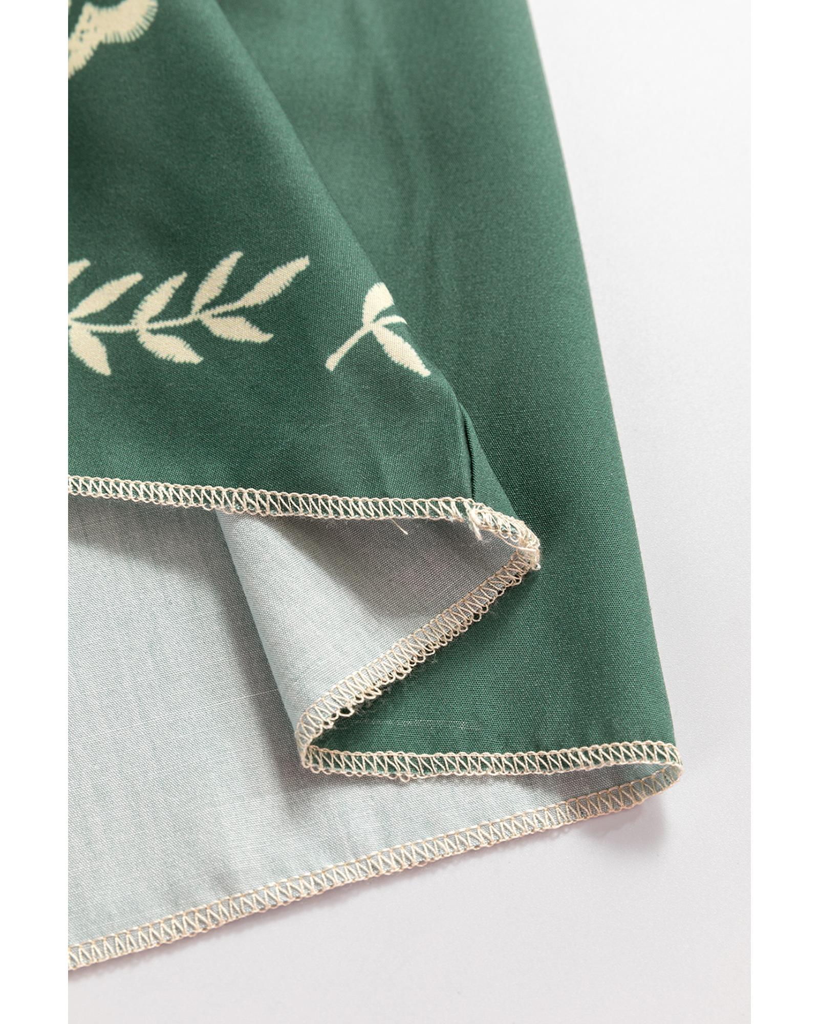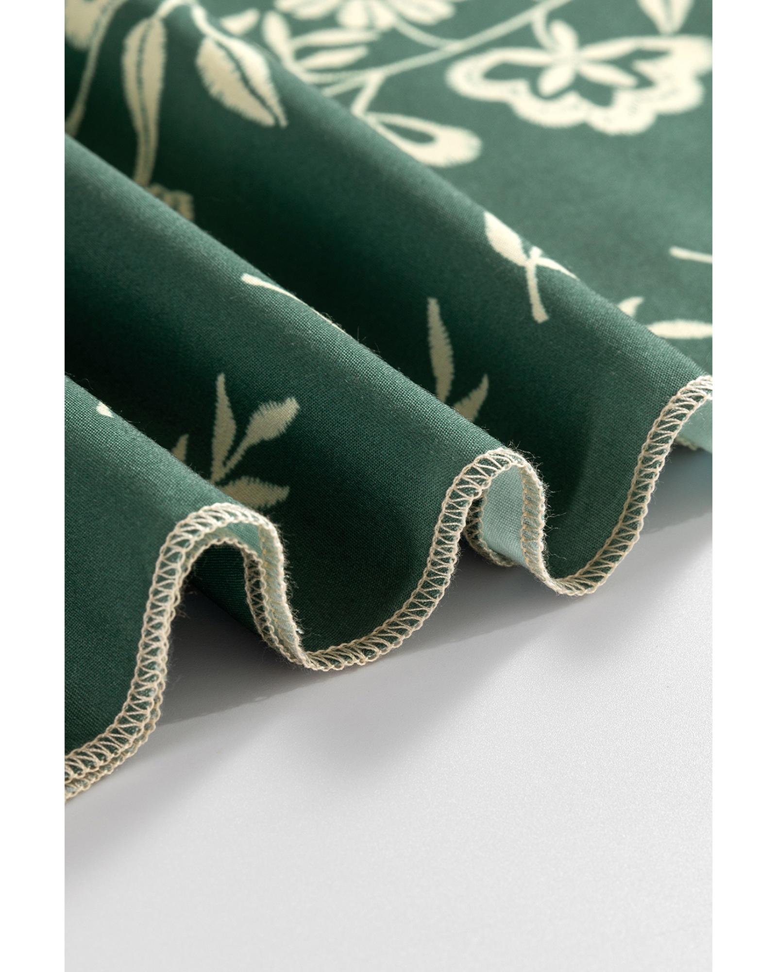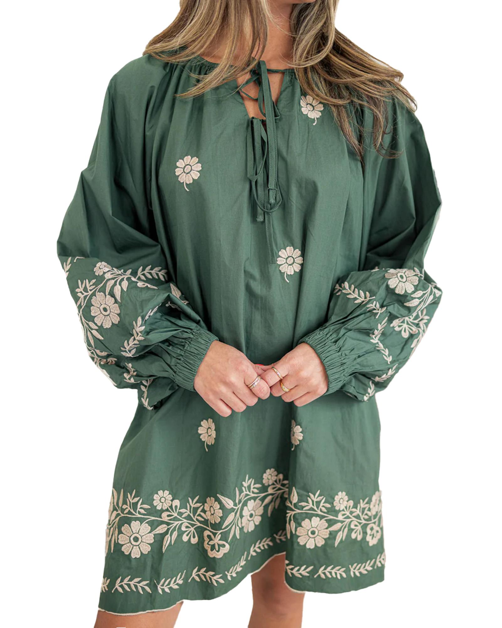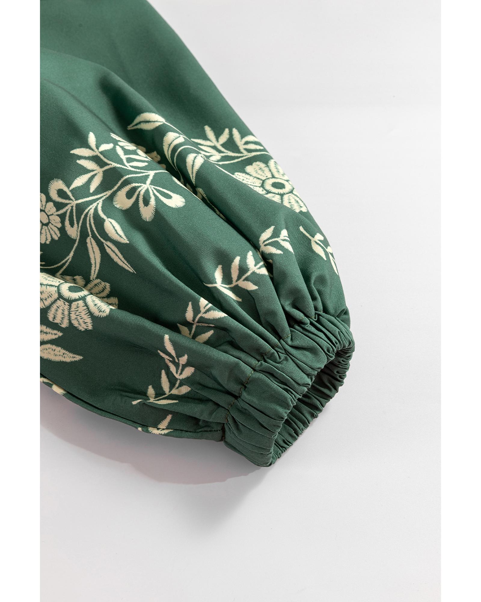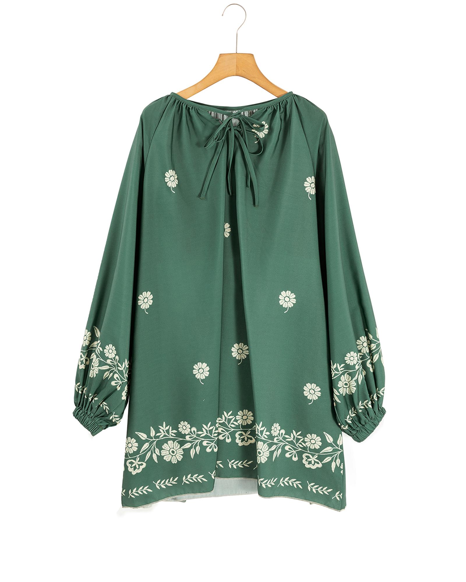 - Mist Green Tie Neck Boho Floral Pattern Puff Sleeve Shift Dress