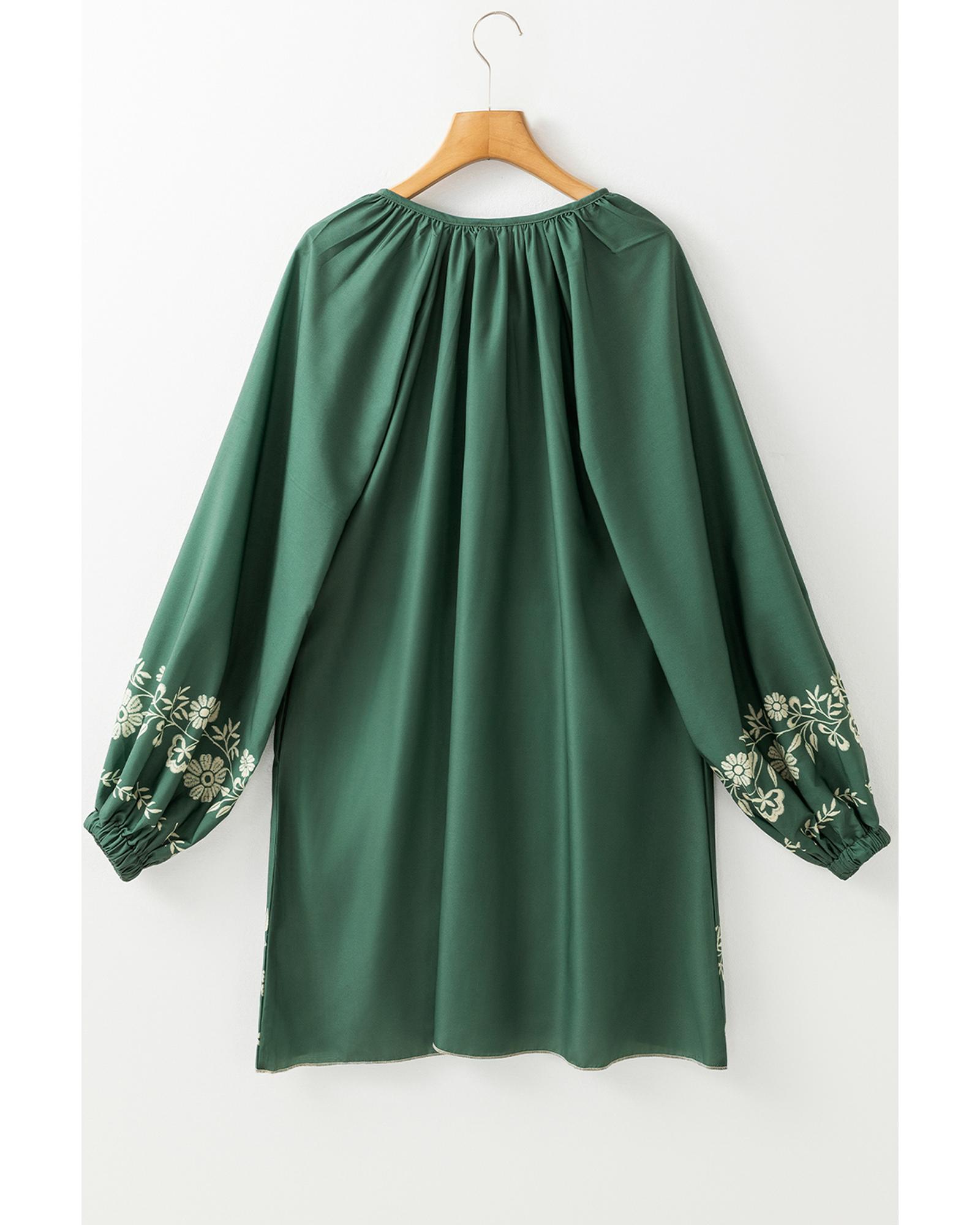 - Mist Green Tie Neck Boho Floral Pattern Puff Sleeve Shift Dress