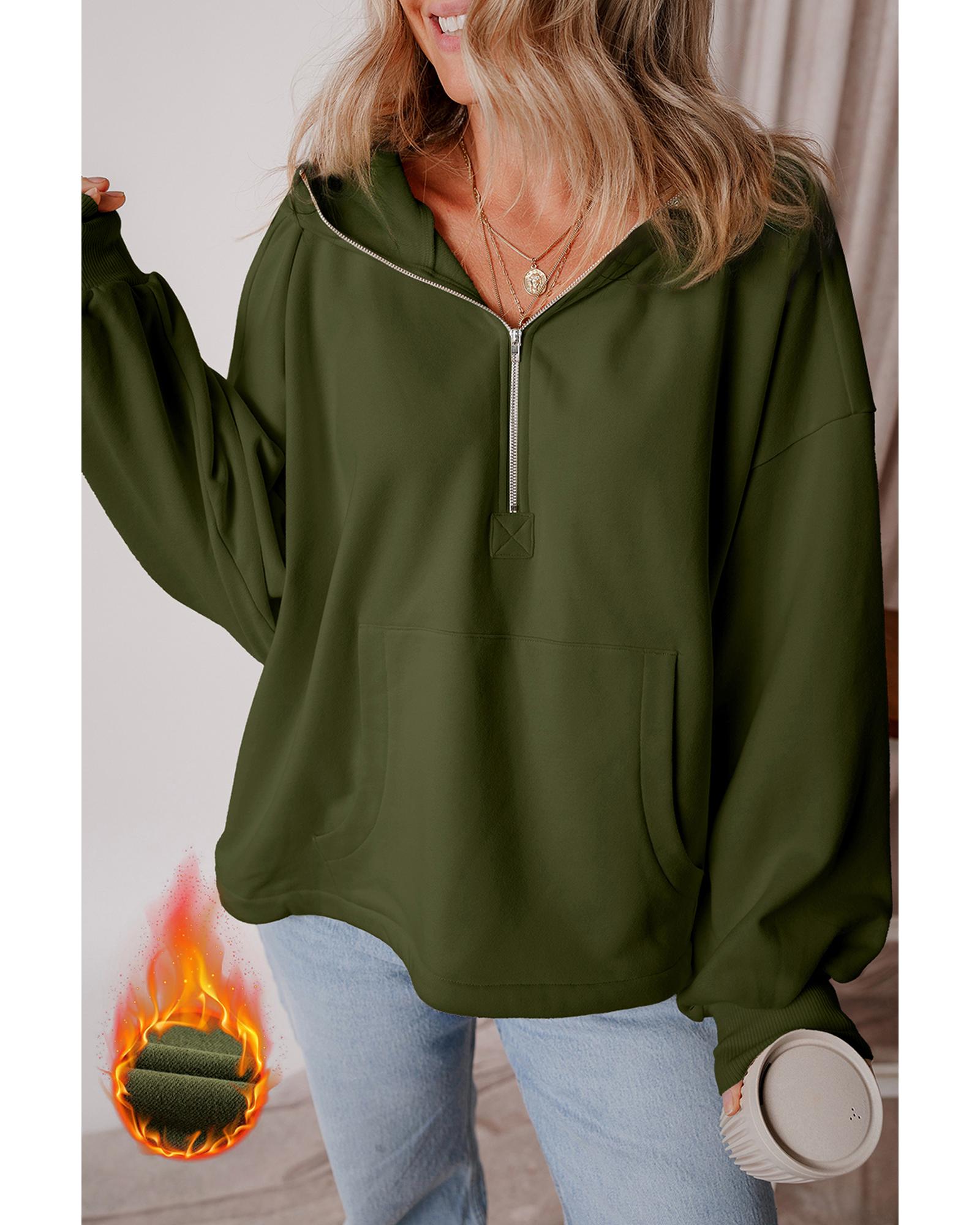 - Moss Green Fleece Lined Half Zipper Kangaroo Pockets Loose Hoodie