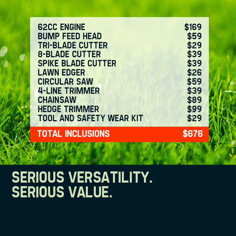 Utilisingpremium anodized commercial alloy, your MTM featurescommercial grade quick connect couplingsequipped withdual ball-bearing floating centres.Adjust the extension poles and tackle those hard to reach branches equipped with genuine commercial nine spline fastening ensuring maximum stability. Built tough, your MTM boasts unparalleled levels of quality backed by an extensive12 month warranty.Buy now and this amazing package comes loaded with a bonus accessory kit, including gloves, earmuffs, mini toolkit and fuel mixer.