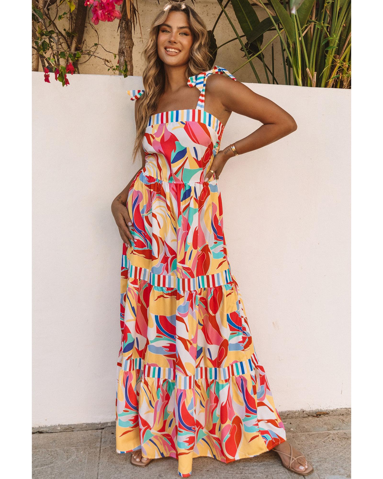- Multicolor Abstract Print Striped Trim Maxi Sundress