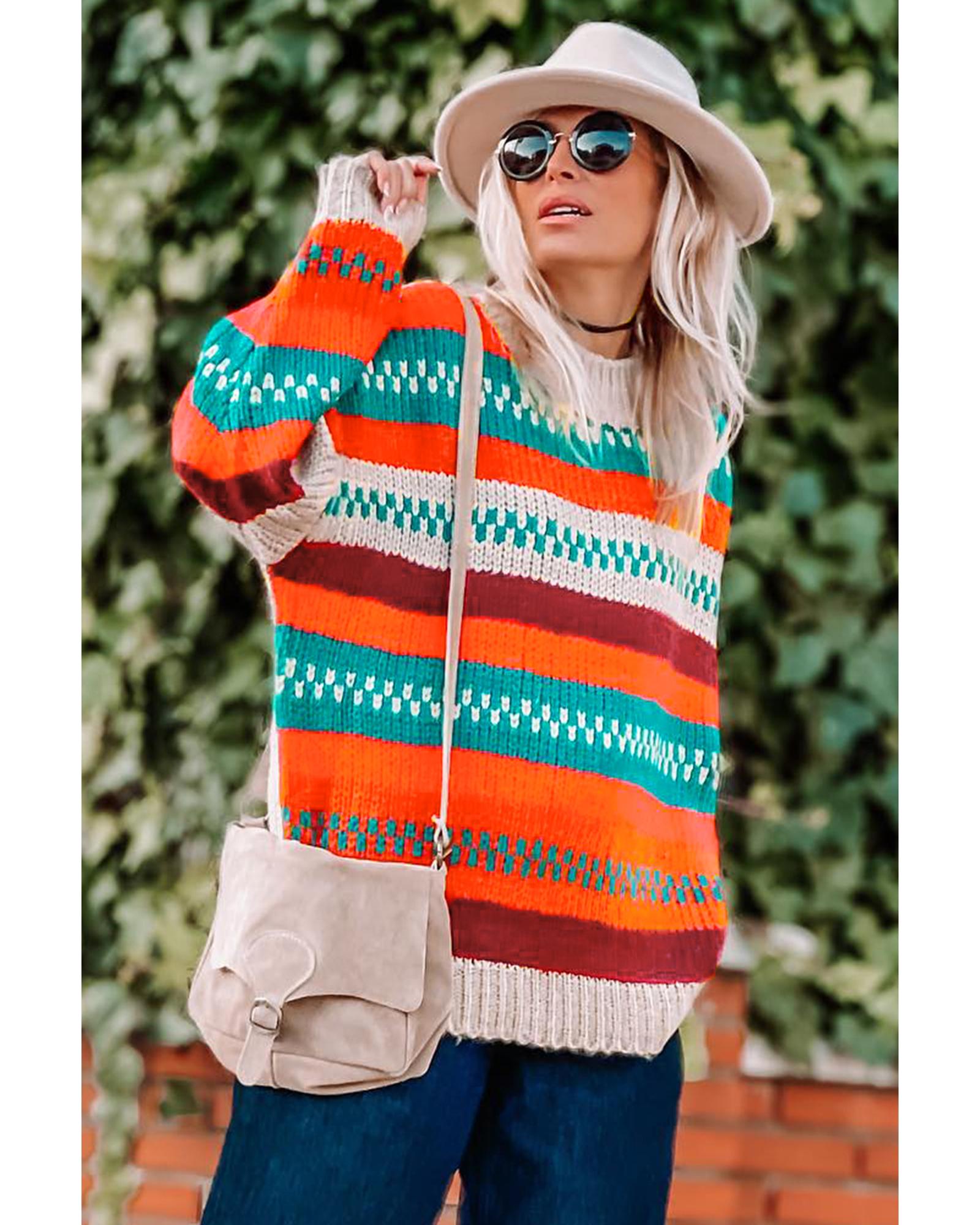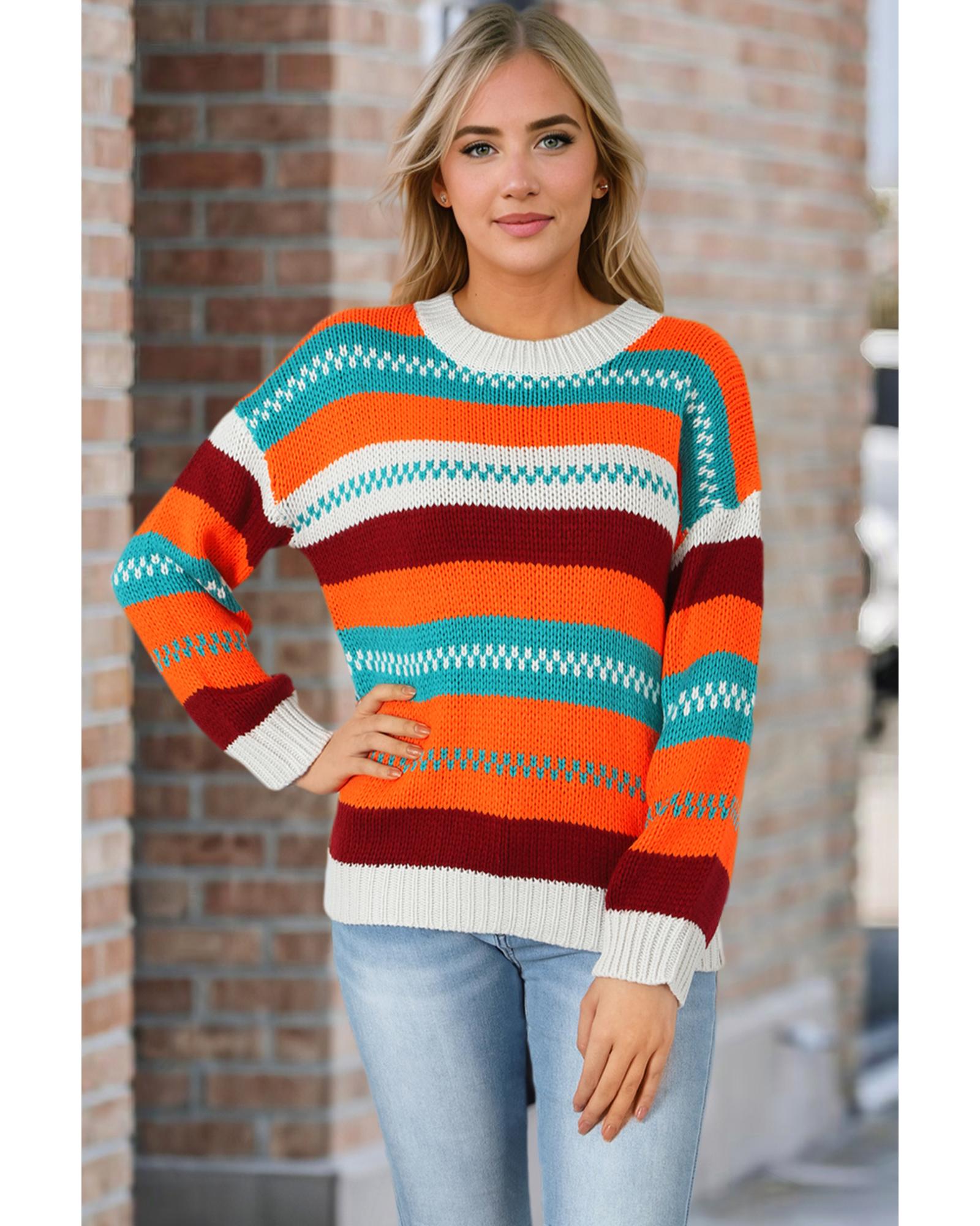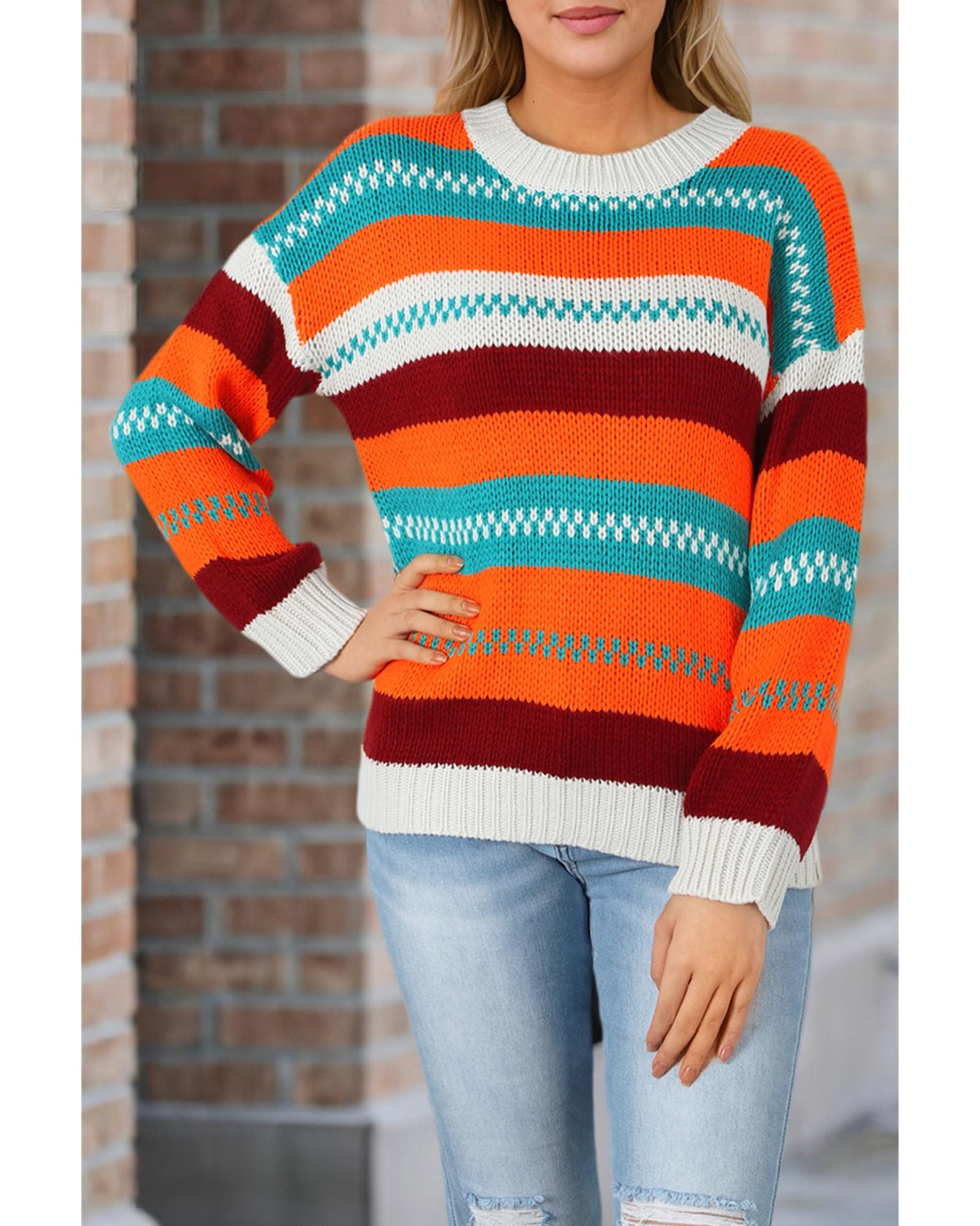 Multicolor Color Block Striped Loose Sleeve Sweater – L