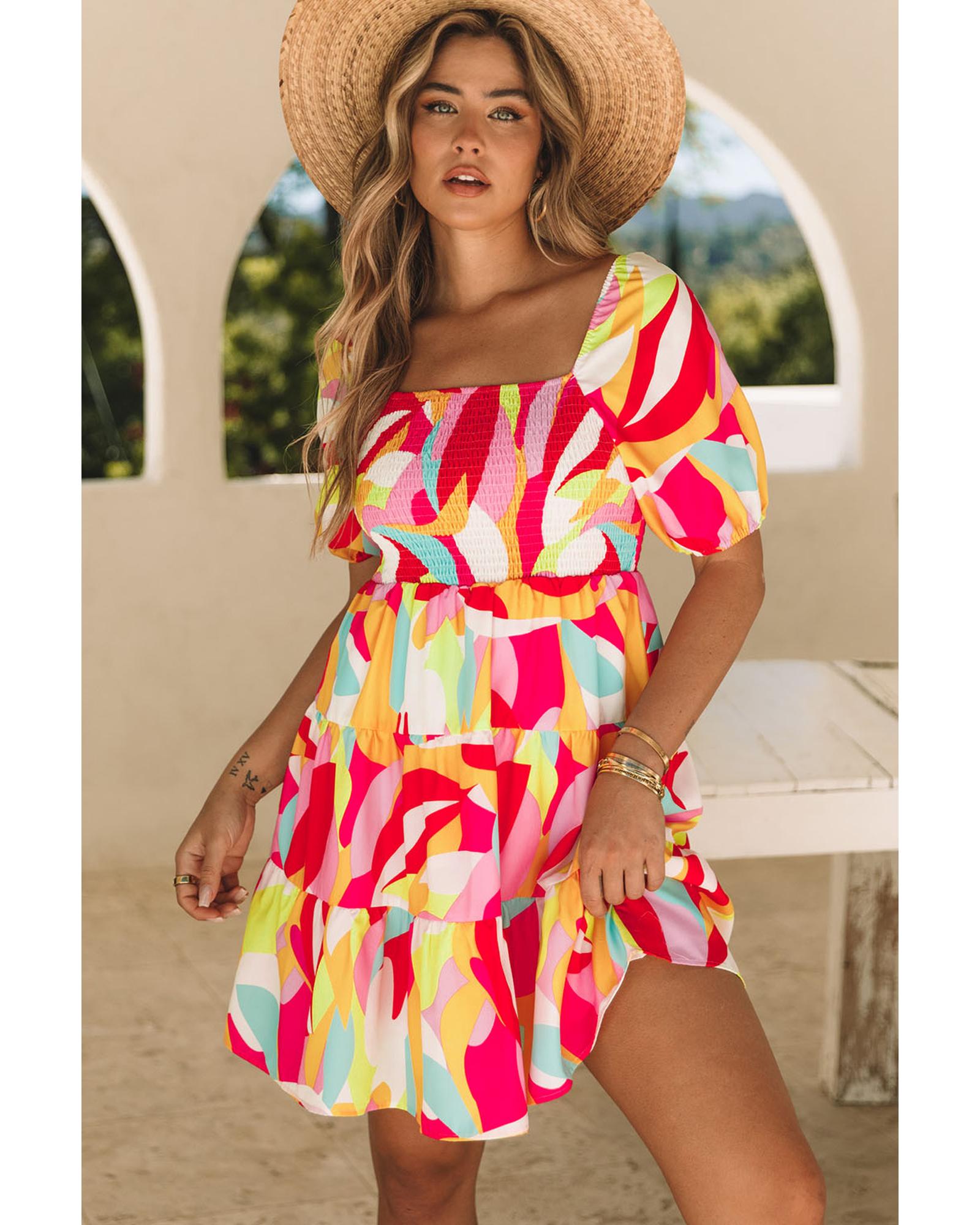 Multicolor Geometric Print Smocked Babydoll Mini Dress – L