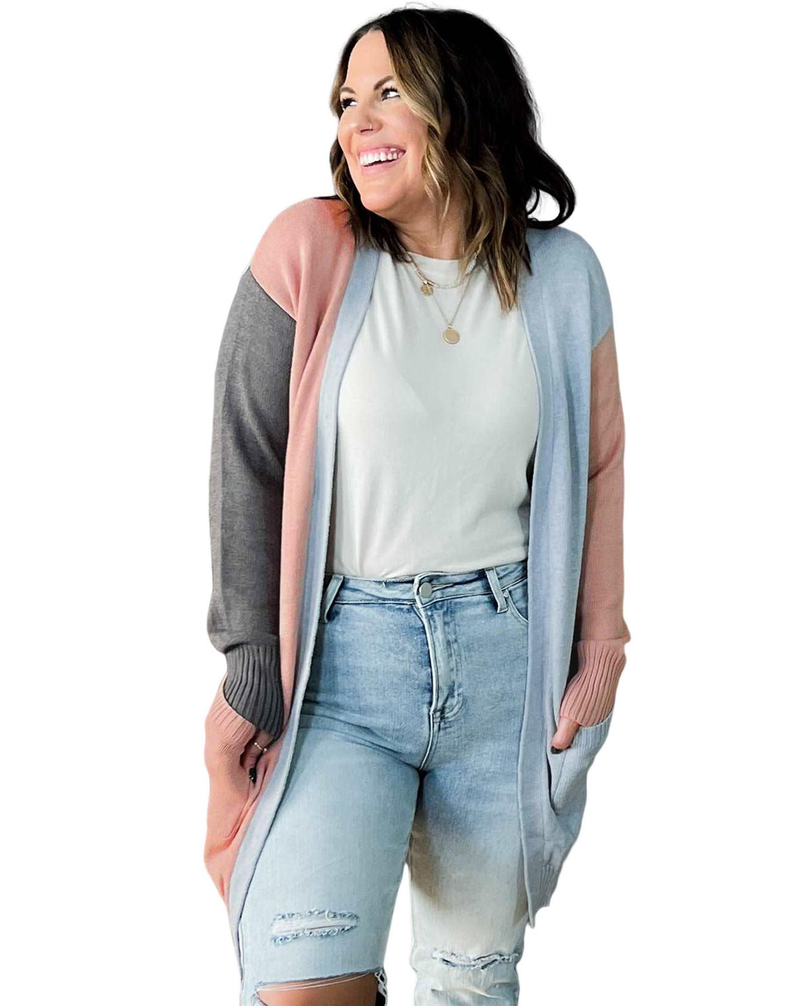 Multicolor Plus Size Colorblock Pocketed Open Front Cardigan – 1X