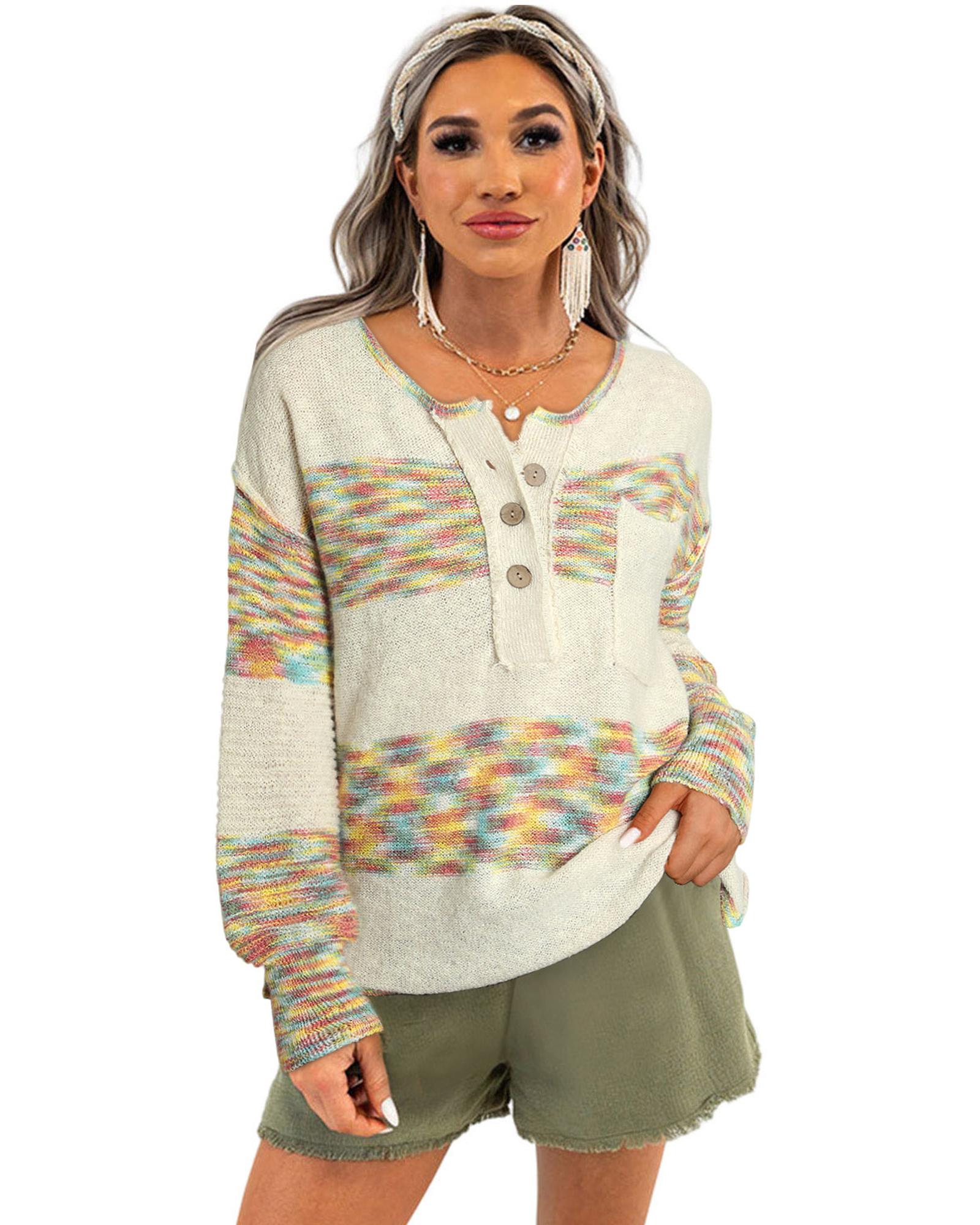 - Casual and trendy Multicolor Space Dye Henley Knit Sweater