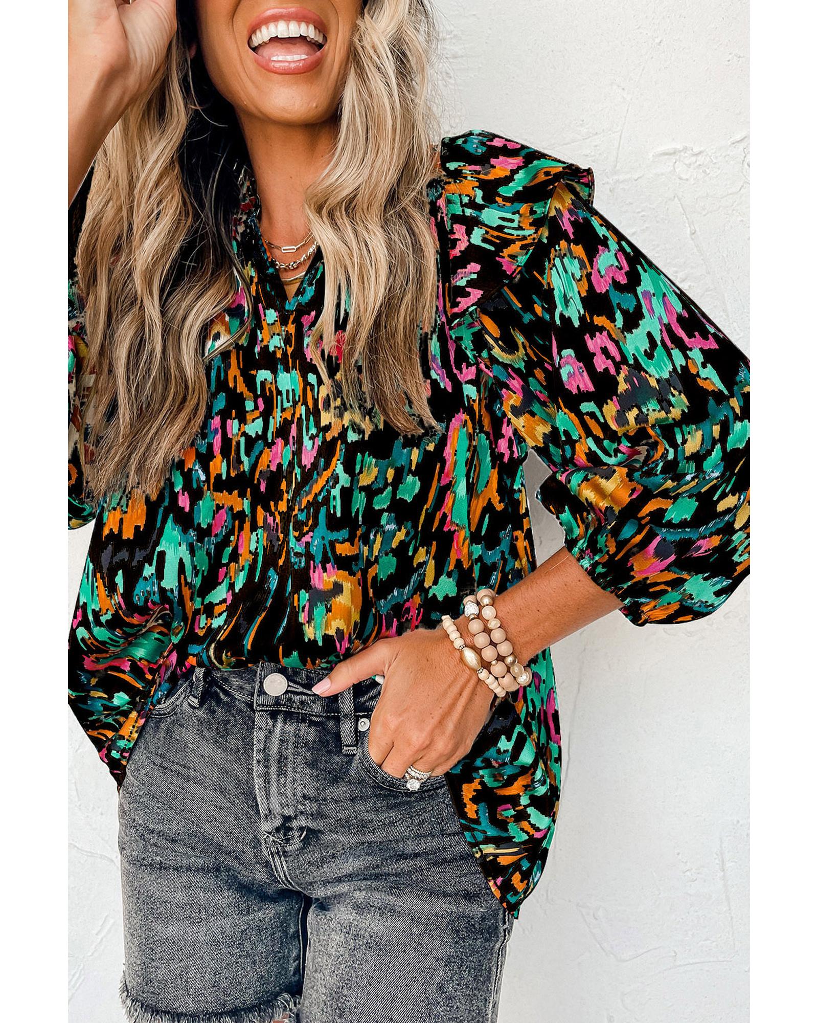 Multicolour Abstract Print 3/4 Puff Sleeve Ruffle Blouse – L