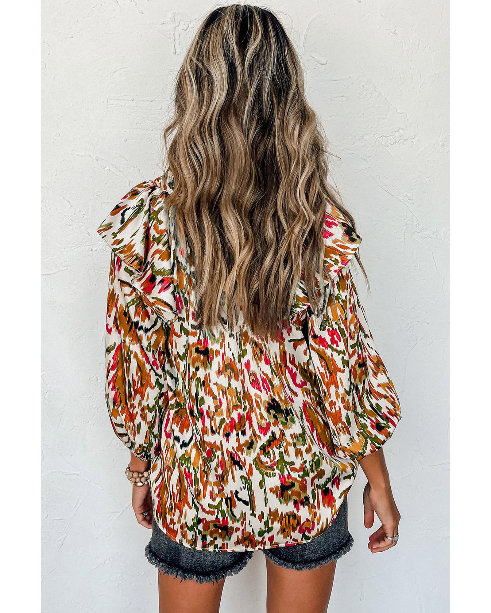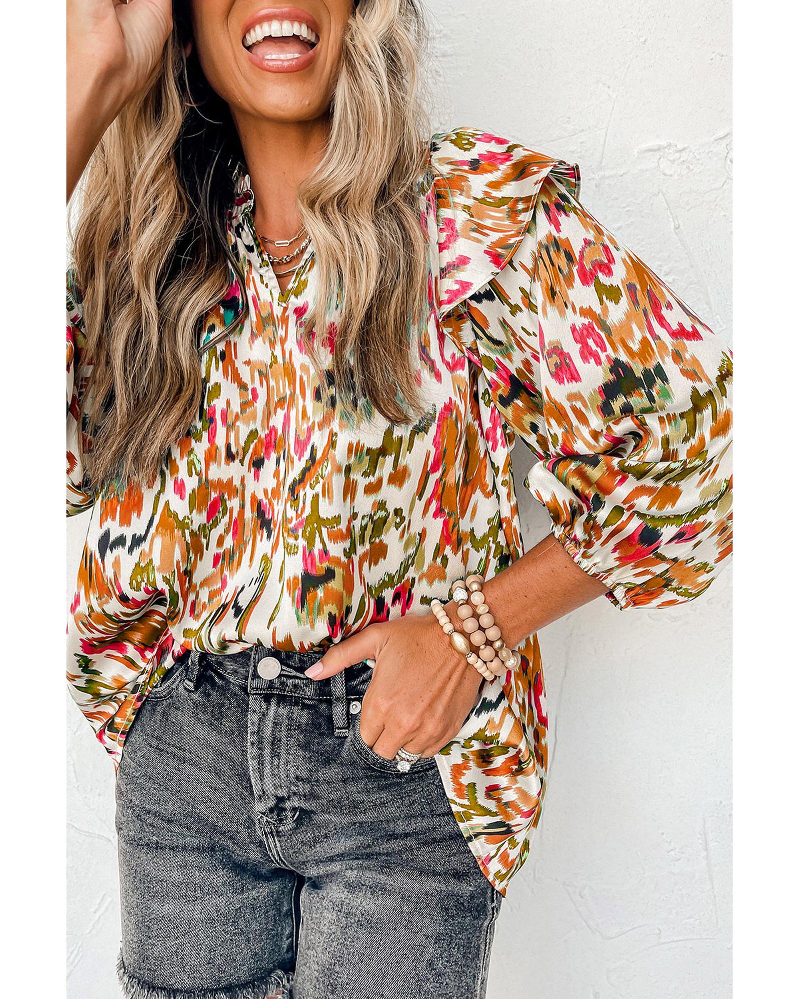Multicolour Abstract Print 3/4 Puff Sleeve Ruffle Blouse – S
