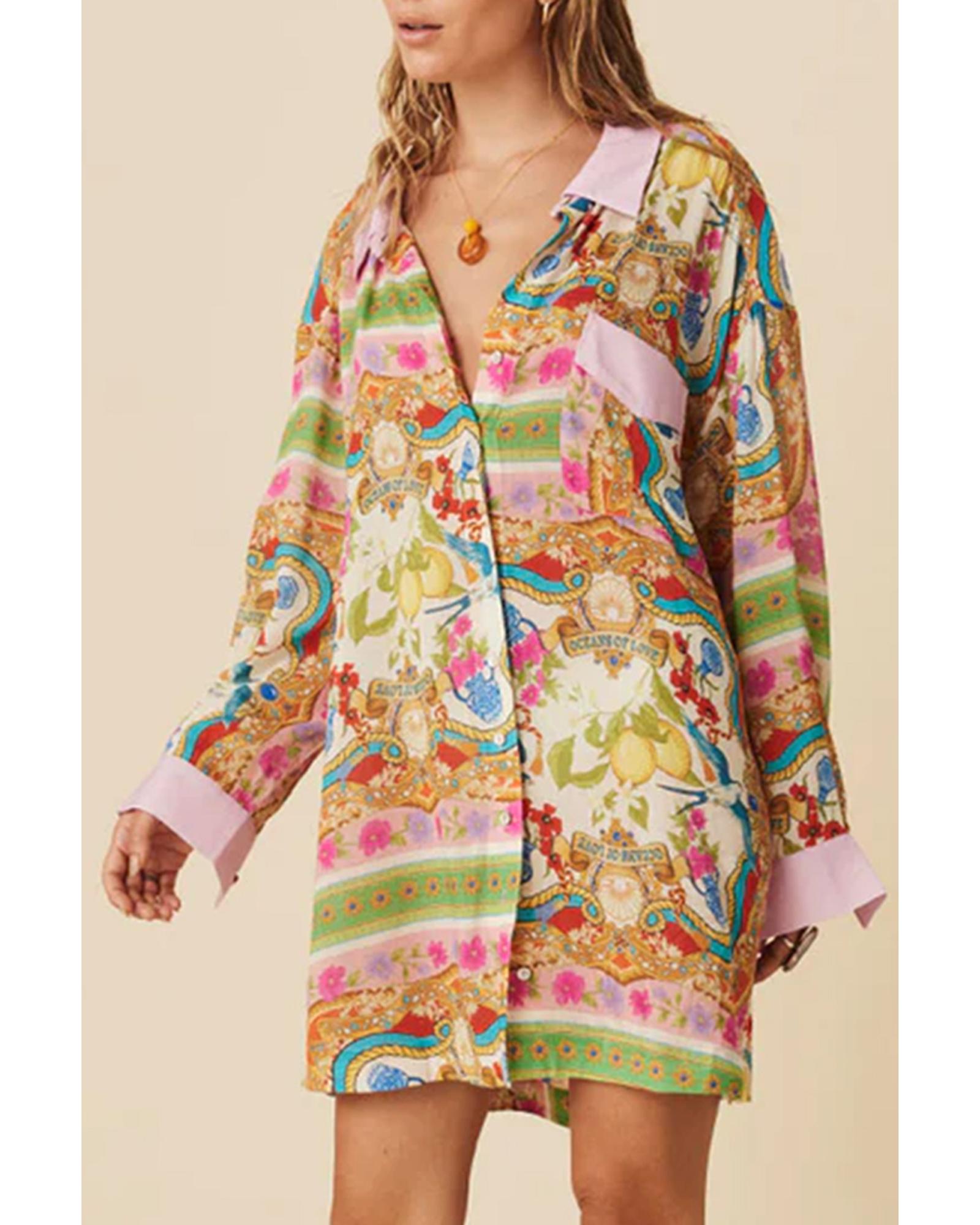 Multicolour Boho Floral Print Buttoned Long Sleeve Shirt Dress - S