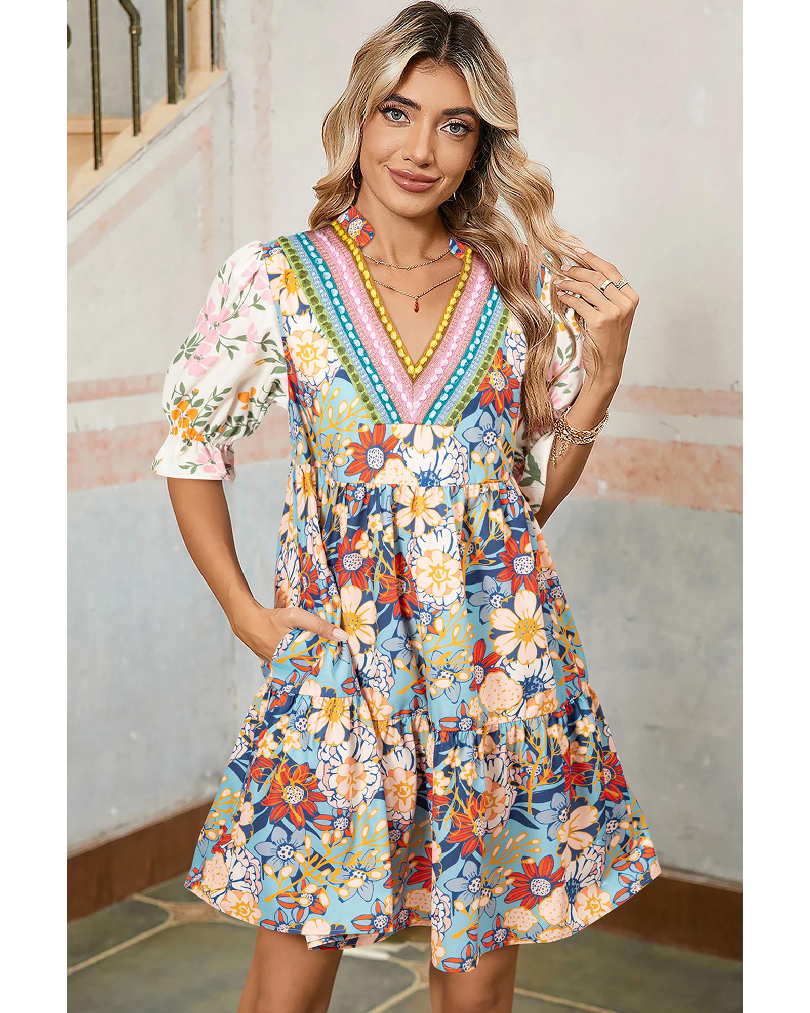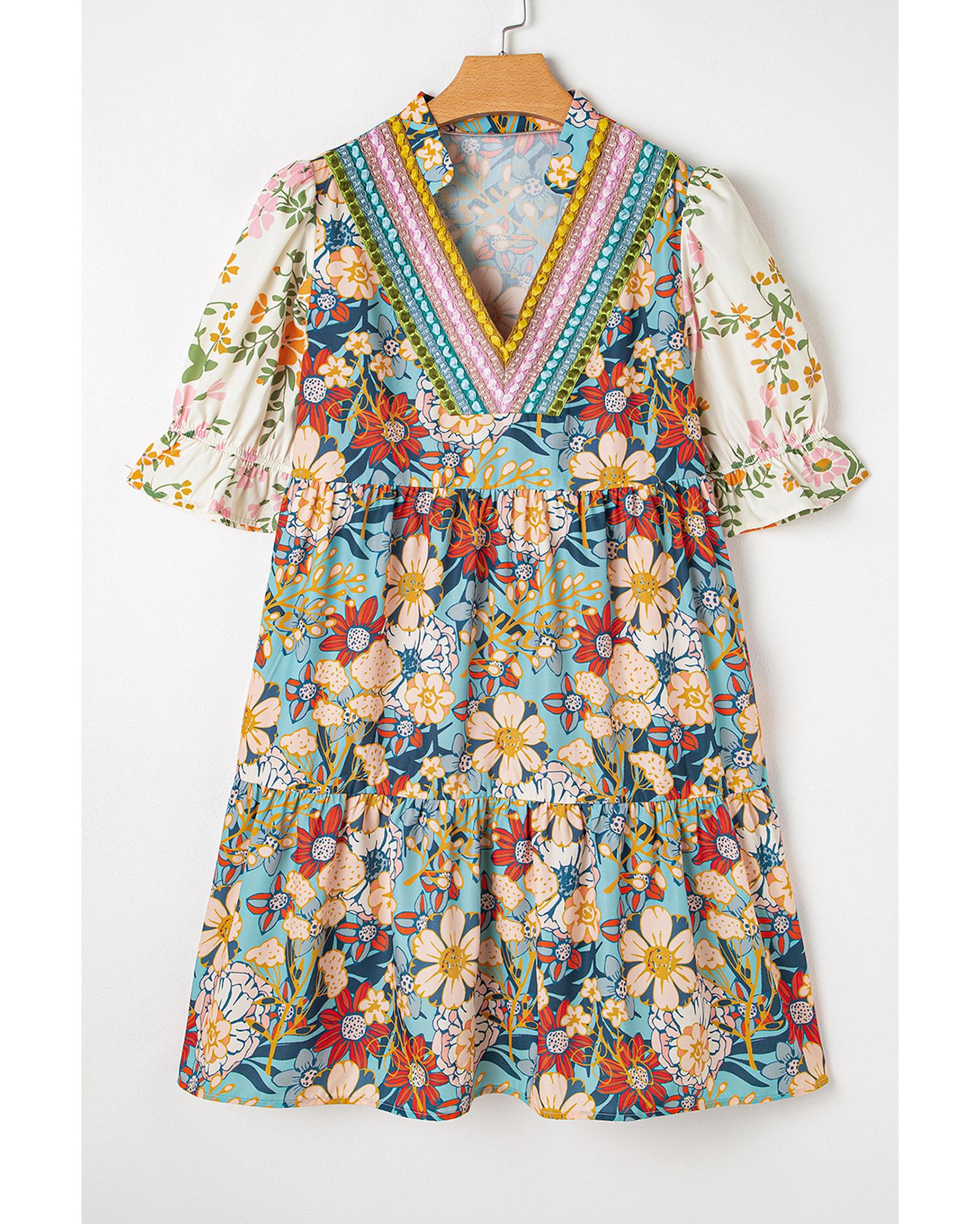 Multicolour Boho Floral Print Crochet Patchwork V Neck Loose Mini Dress – S