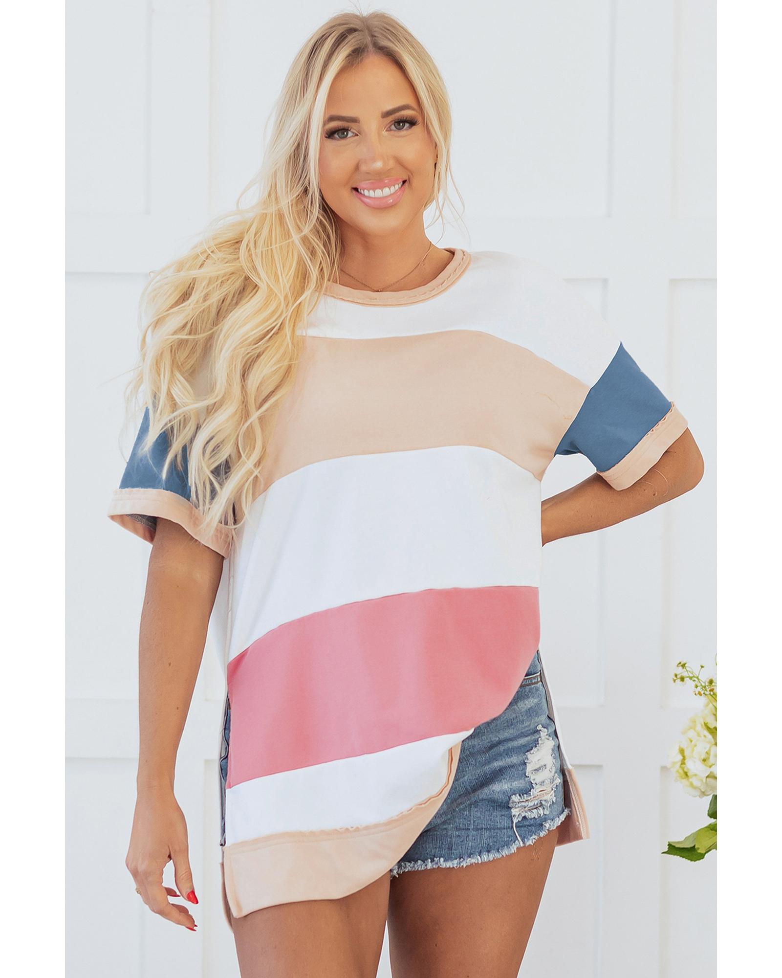 Multicolour Colorblock Patchwork Side Split Tunic T Shirt – M