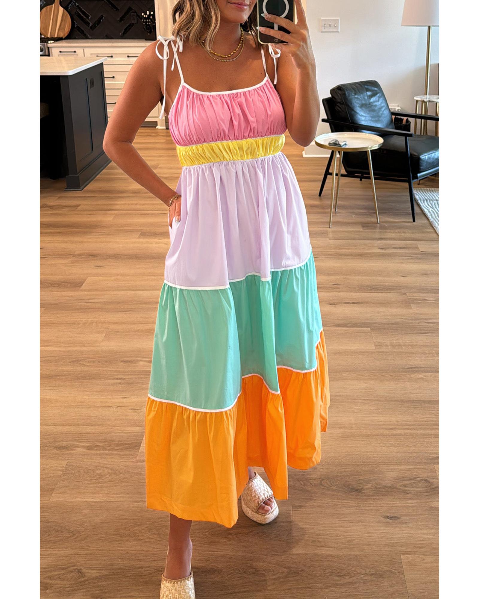 Multicolour Colorblock Self-tie Straps High Waist Flowy Maxi Dress with Pockets – XL