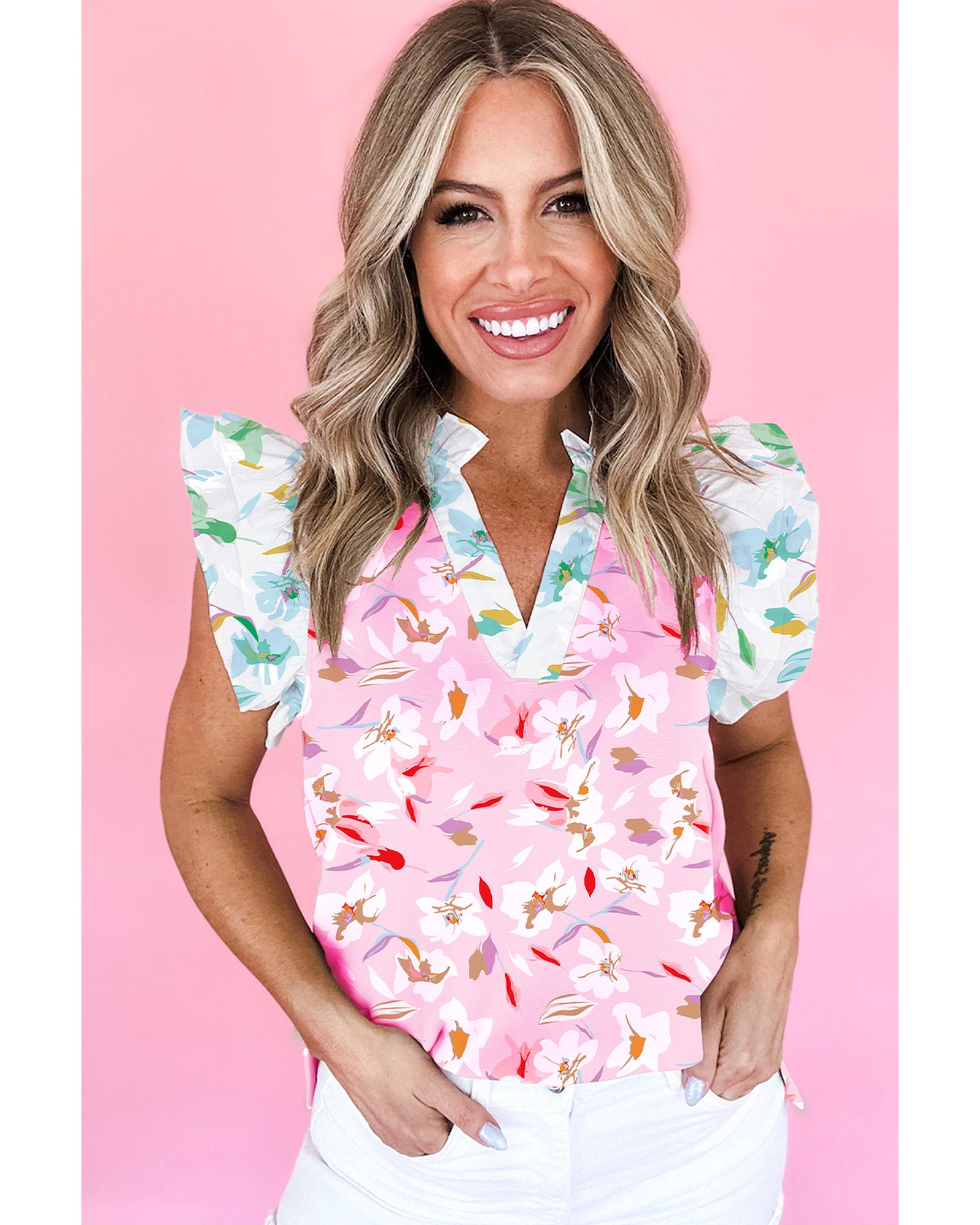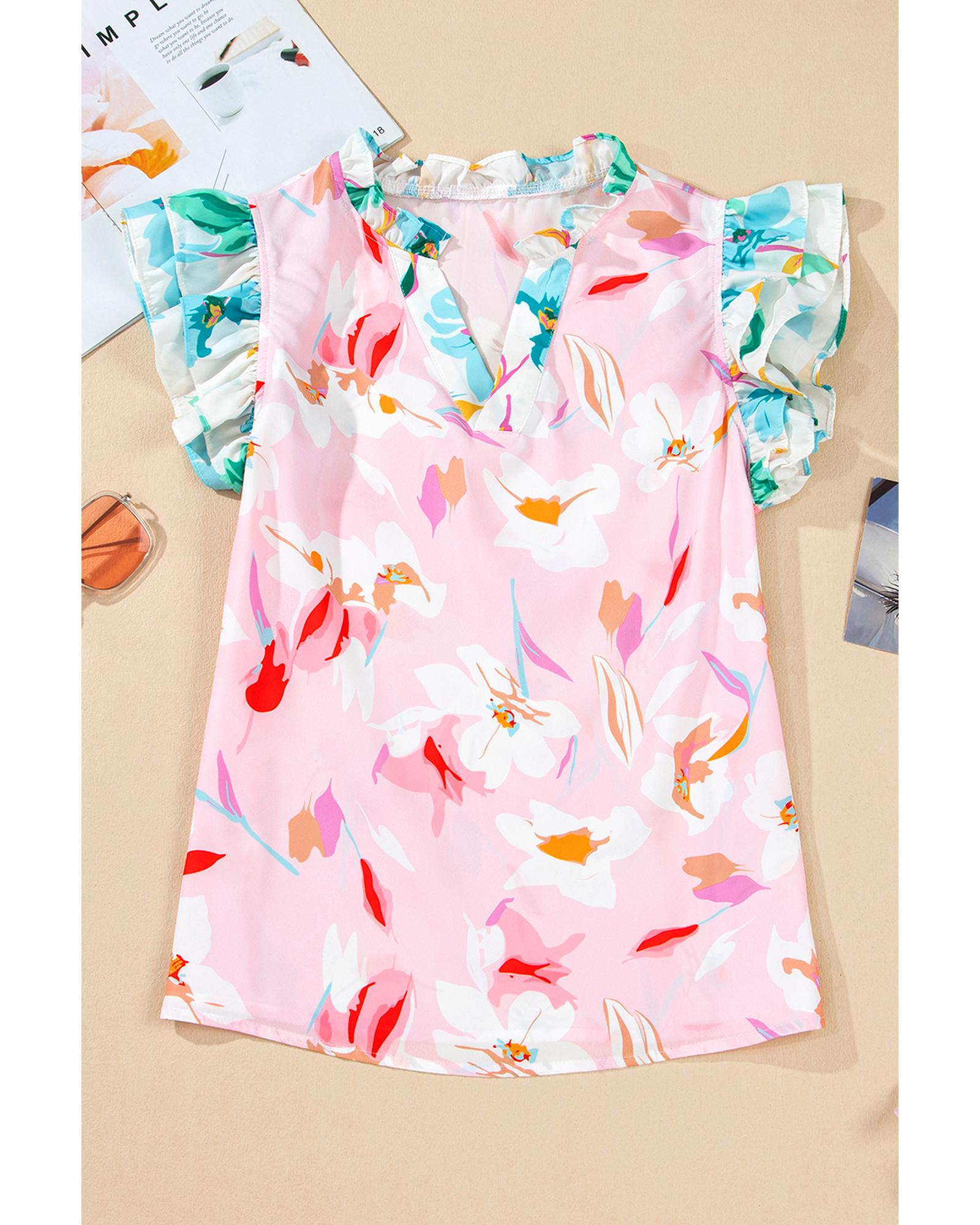 Multicolour Contrast Floral Patchwork Notched Neck Flutter Sleeve Blouse – L