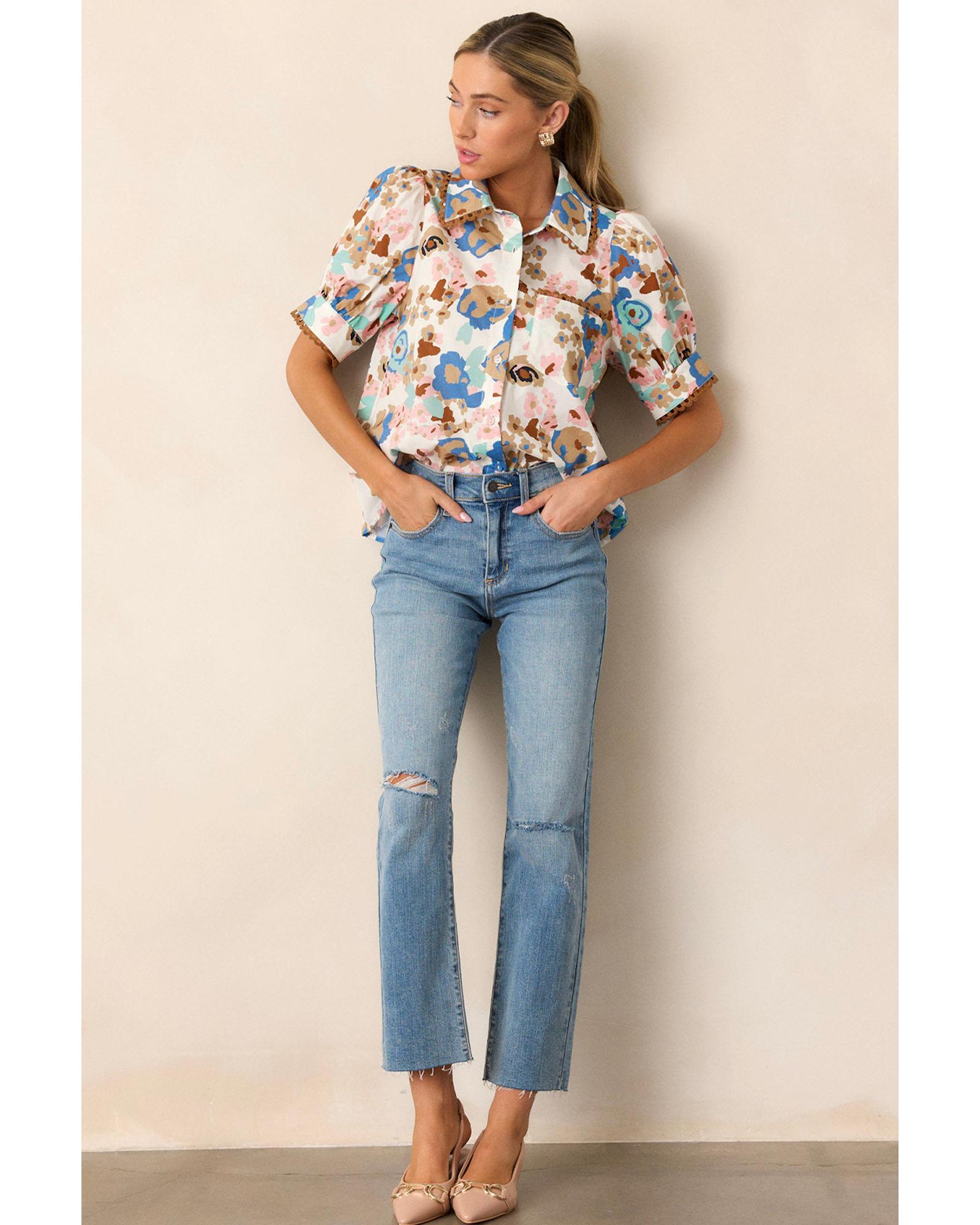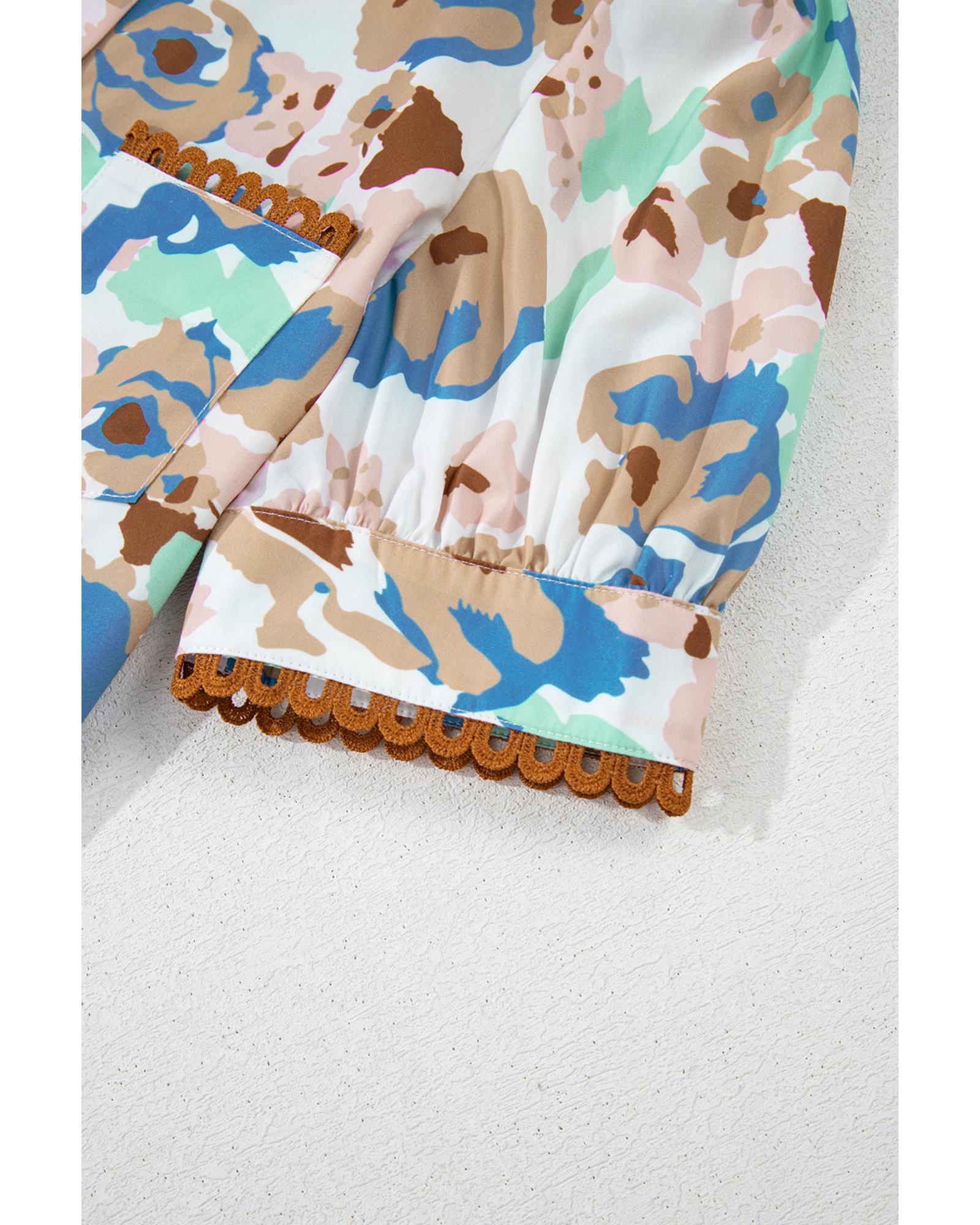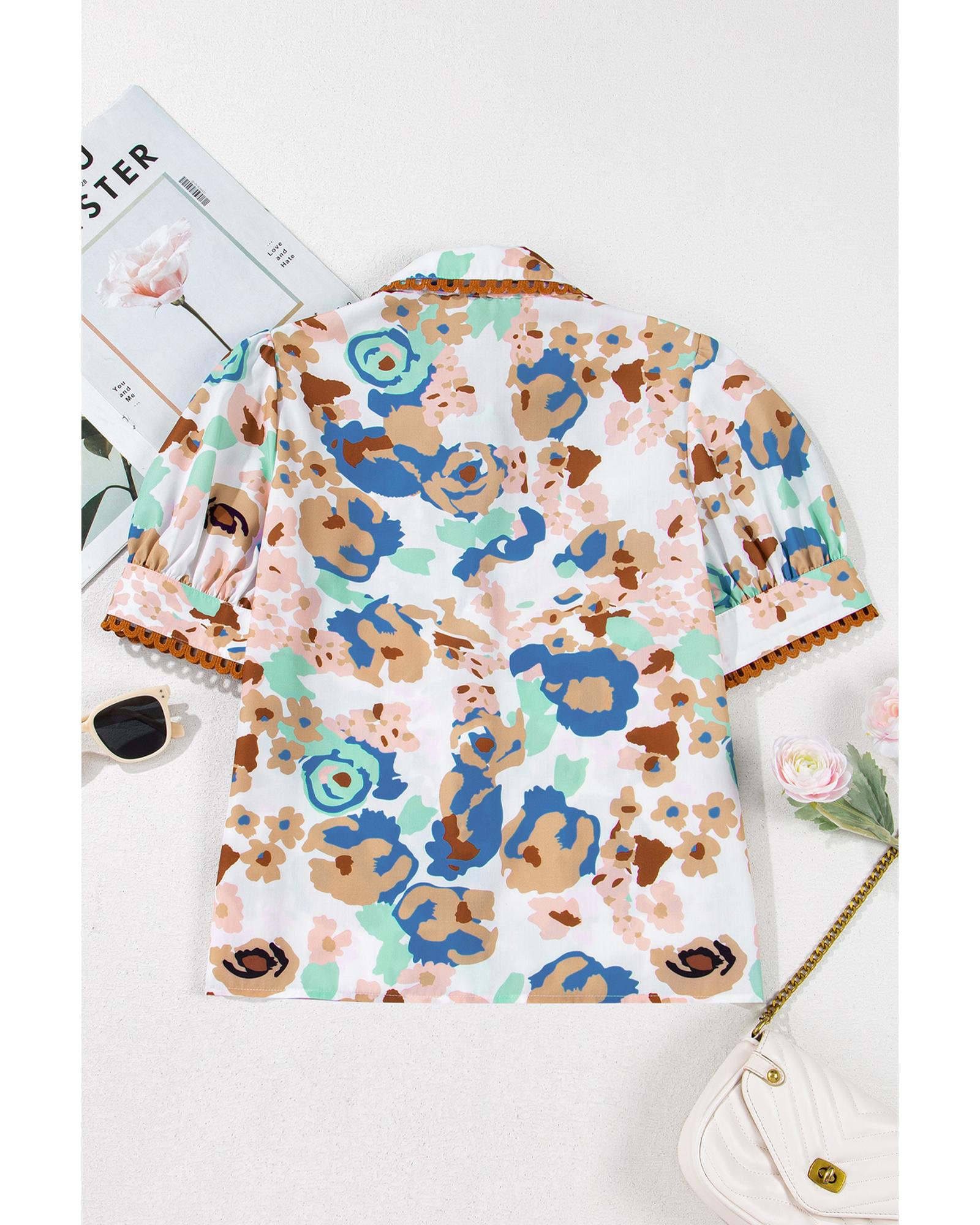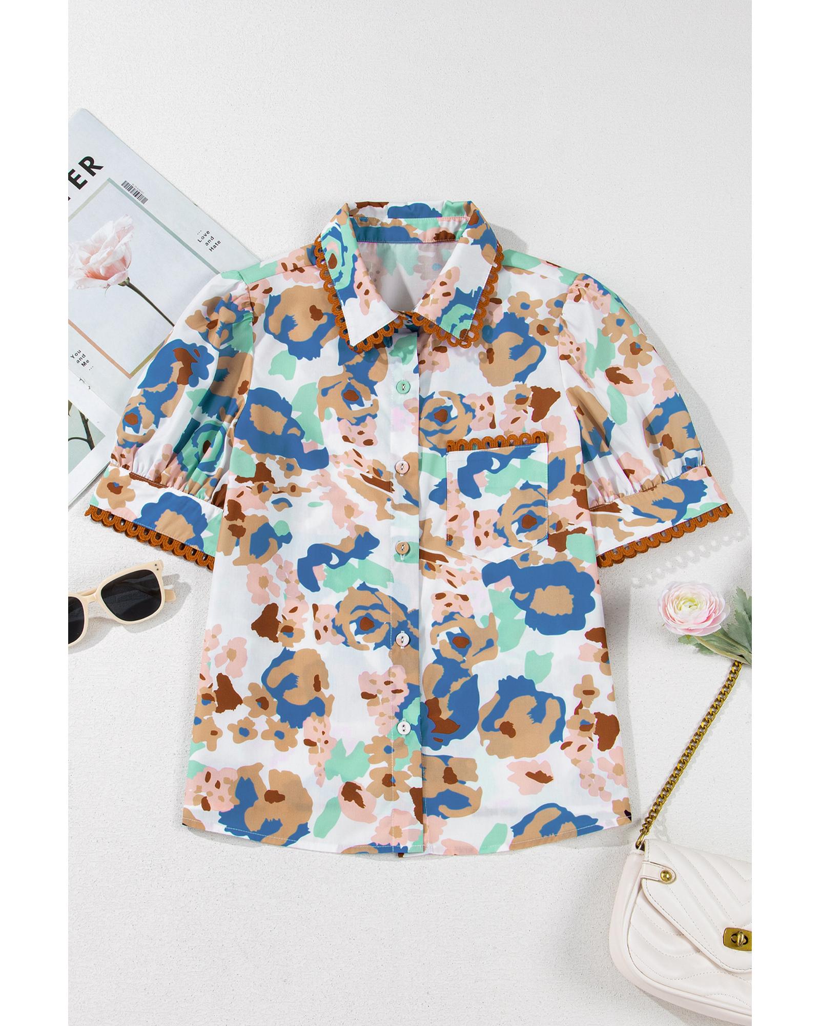Multicolour Floral Print Ricrac Trim Collared Puff Short Sleeve Shirt – XL