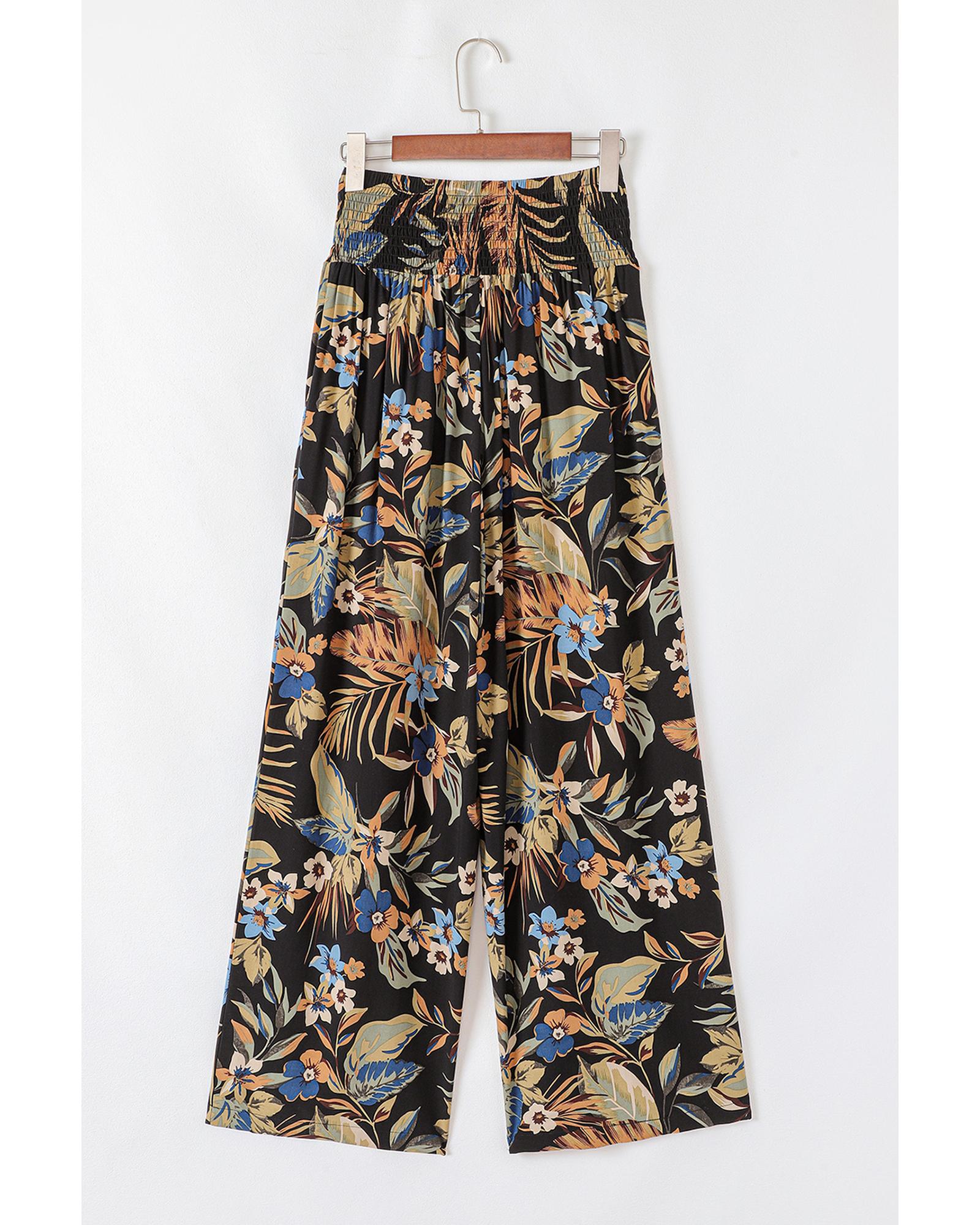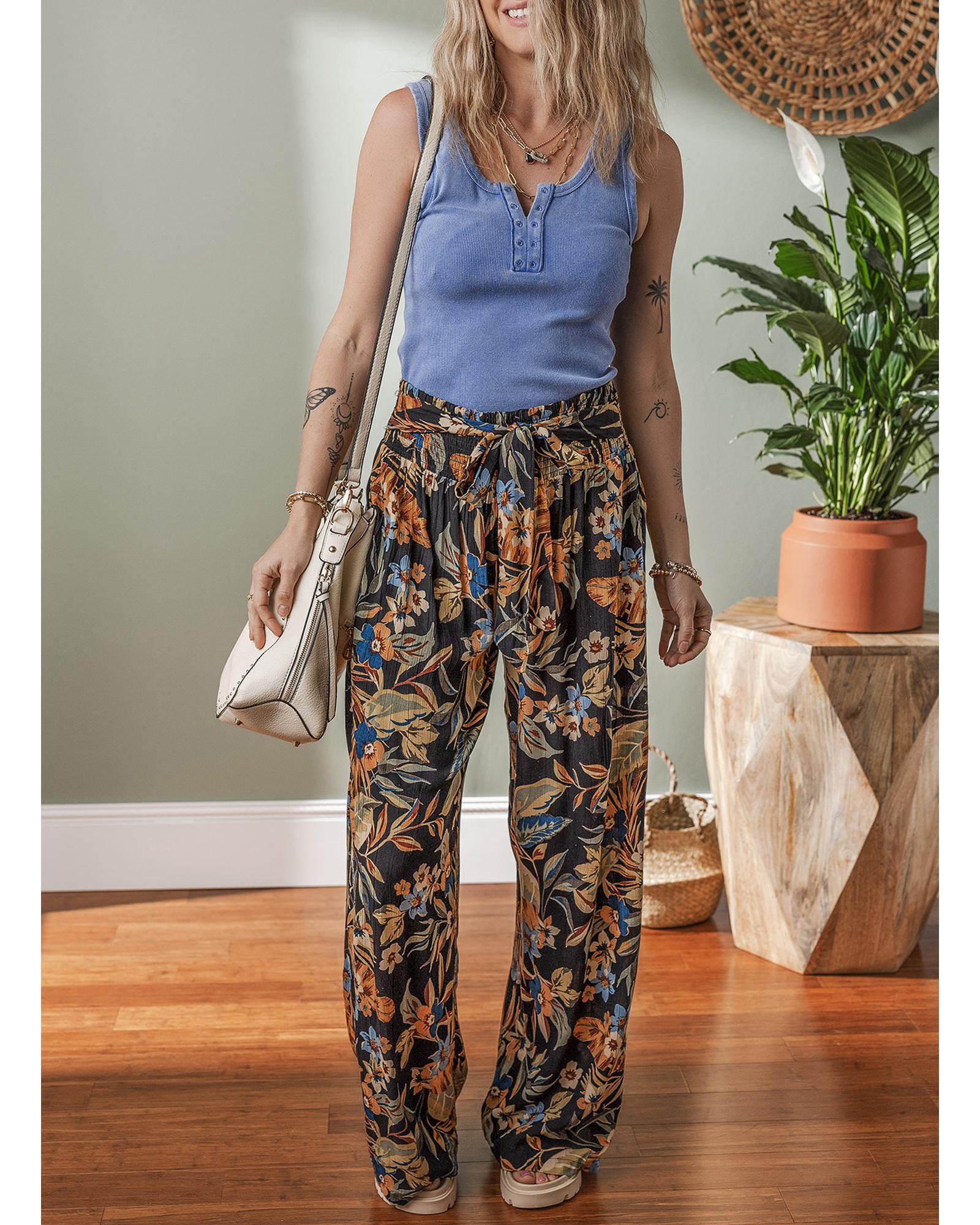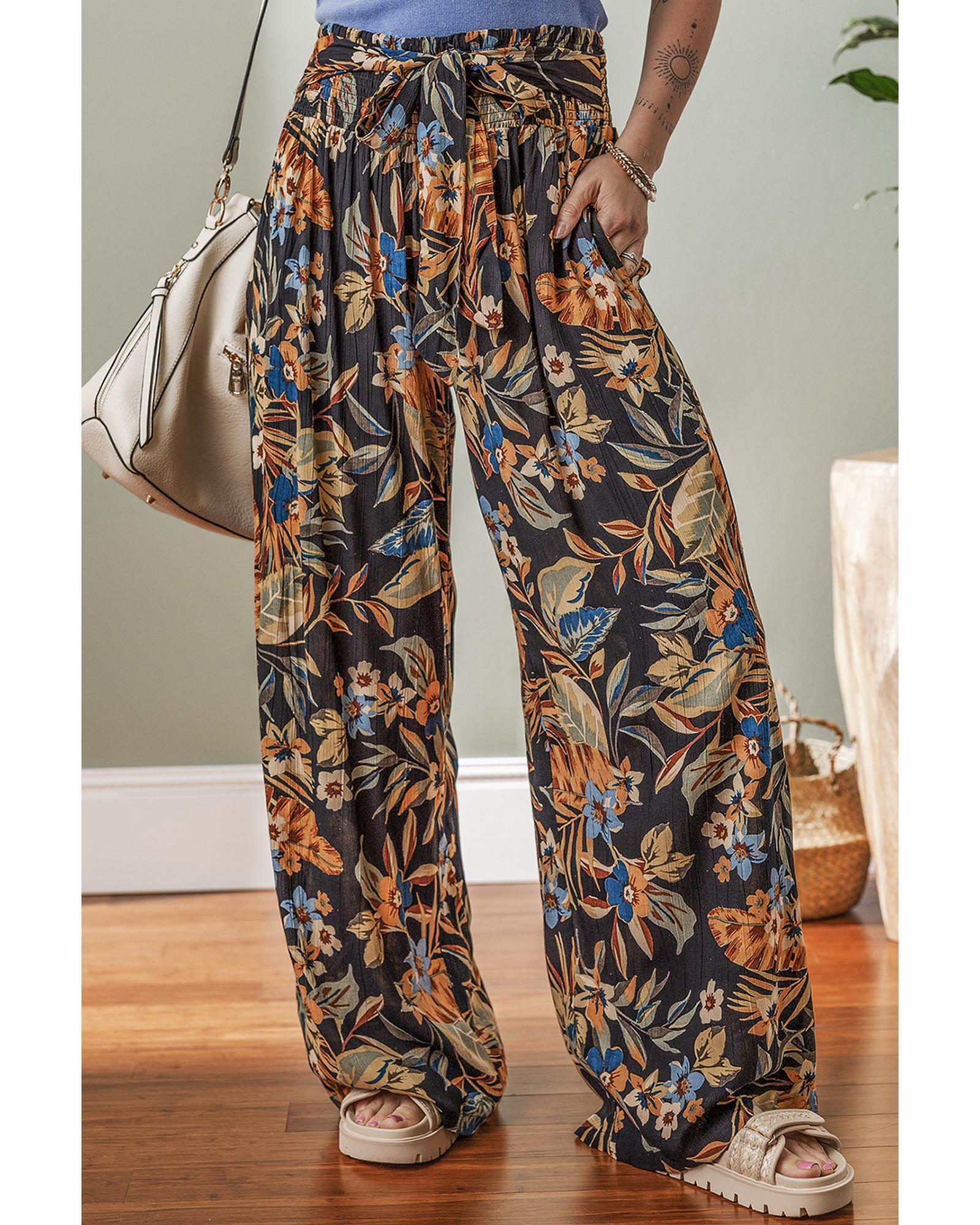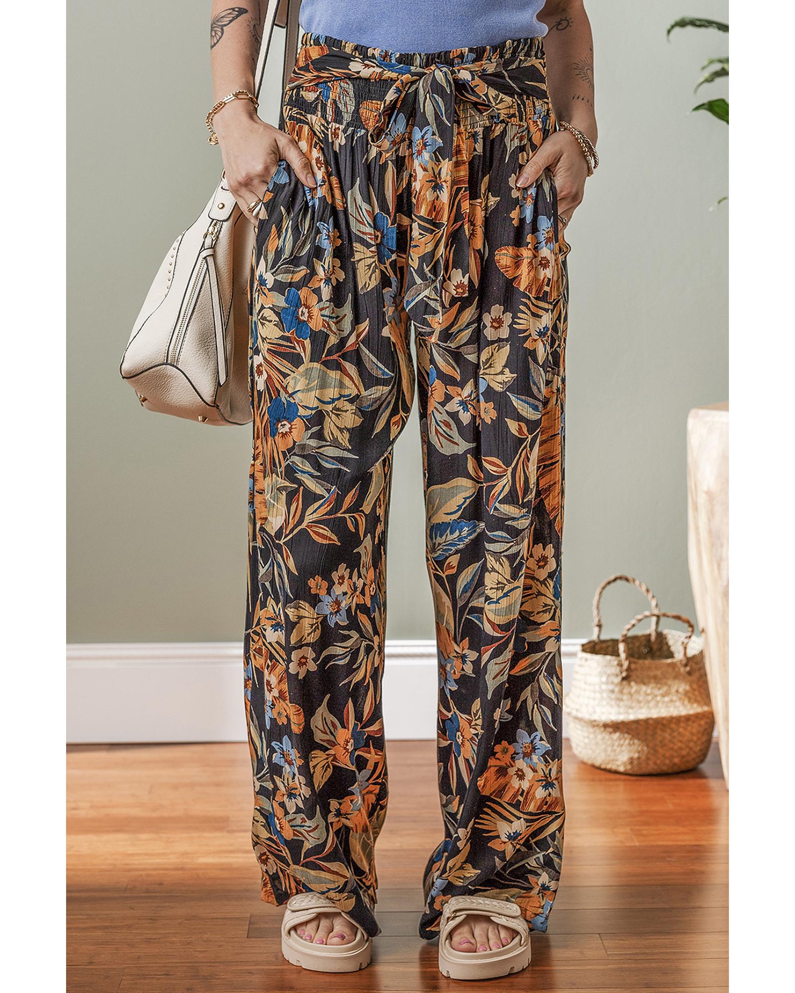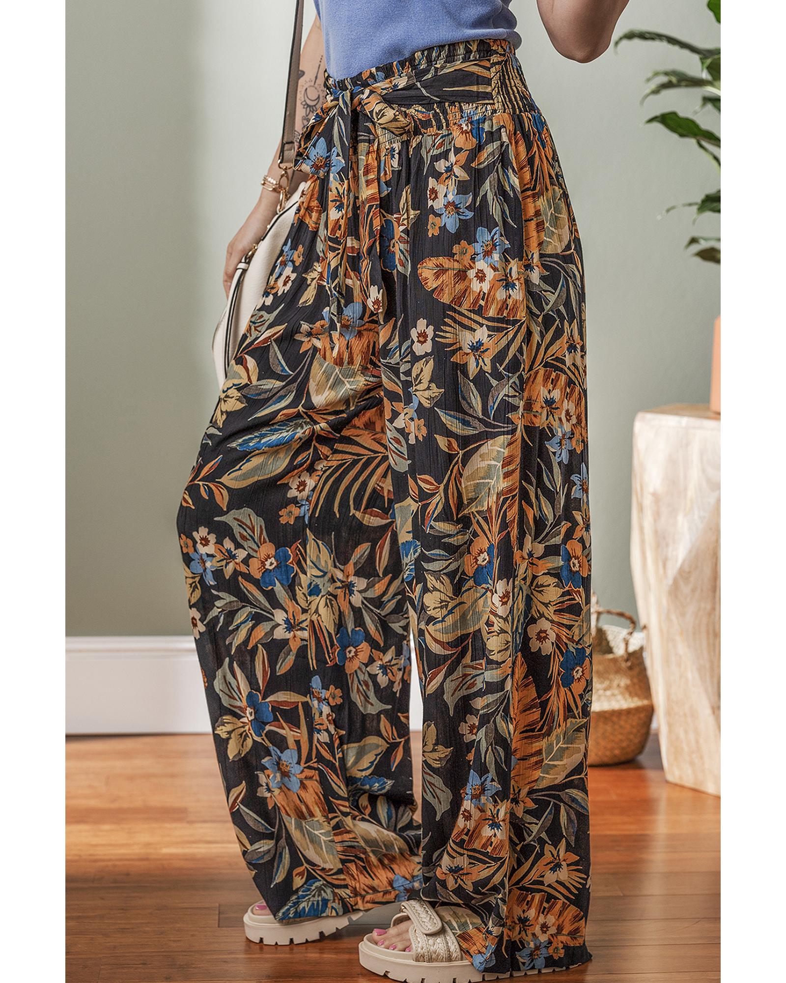 Multicolour Floral Shirred High Waist Wide Leg Pants with Tie – L