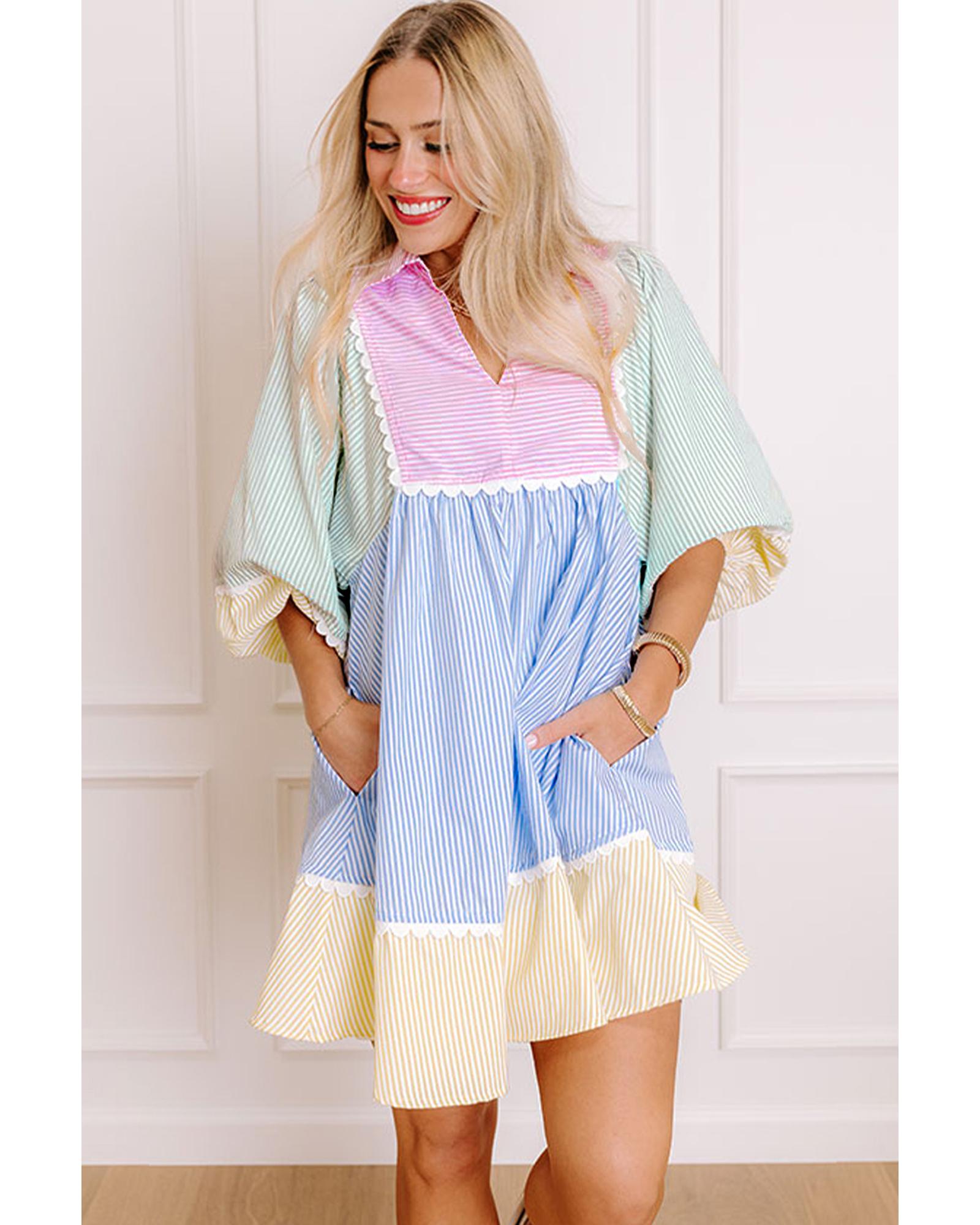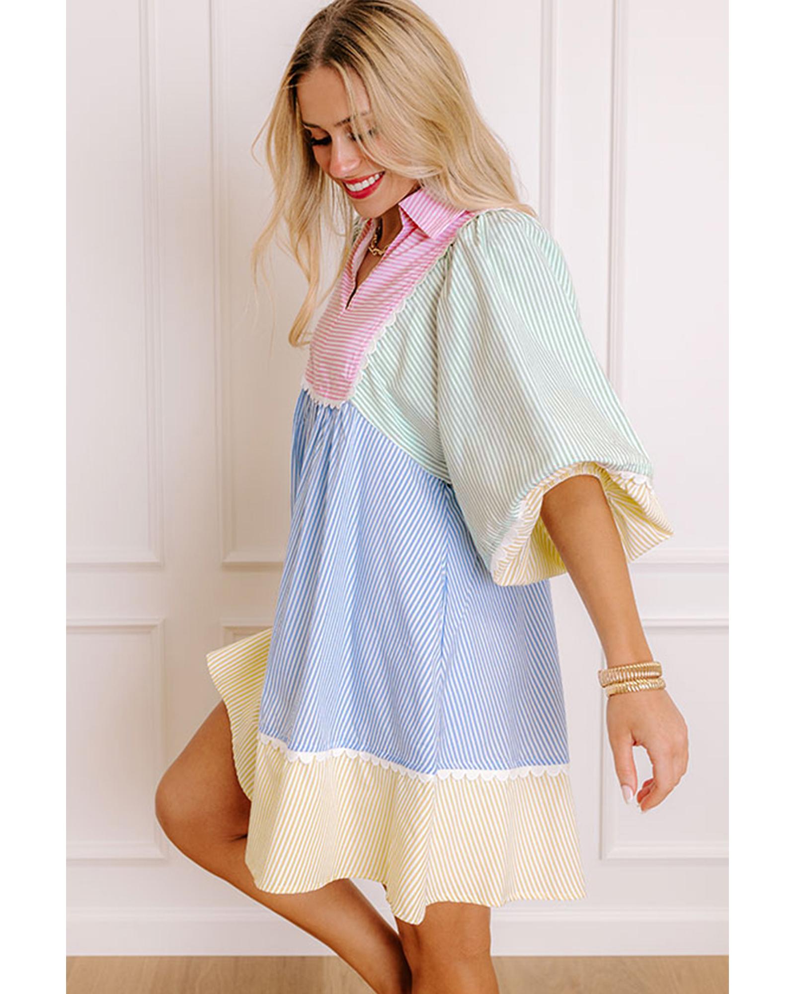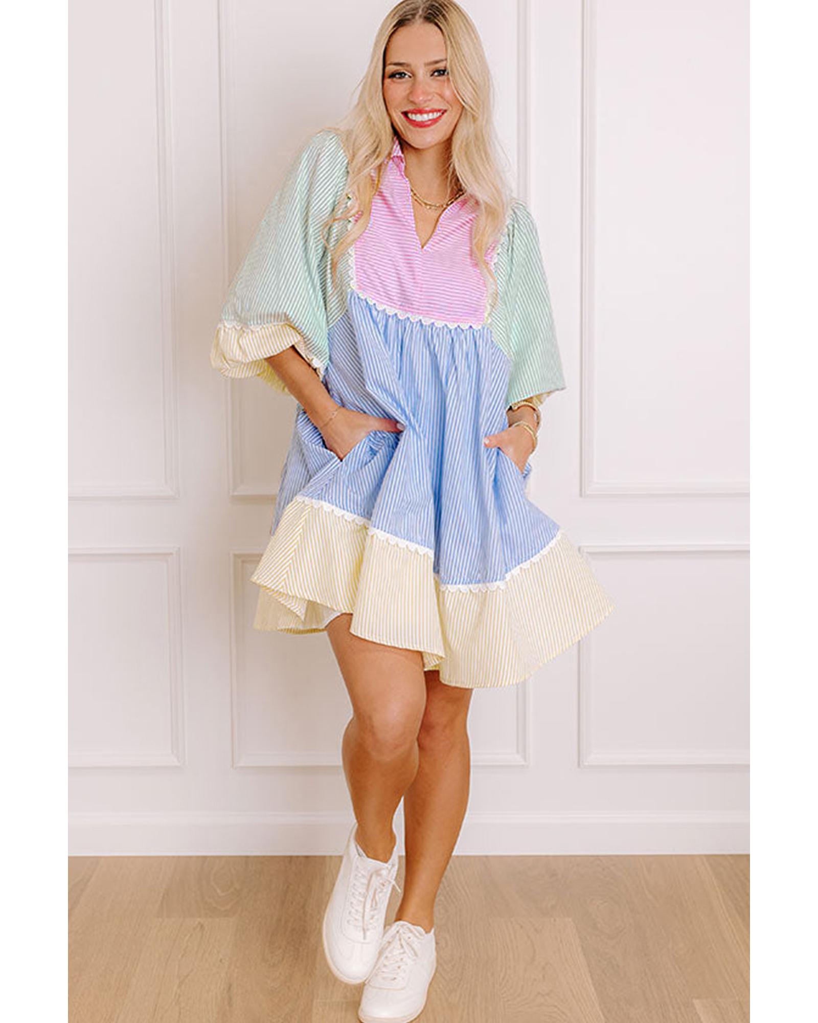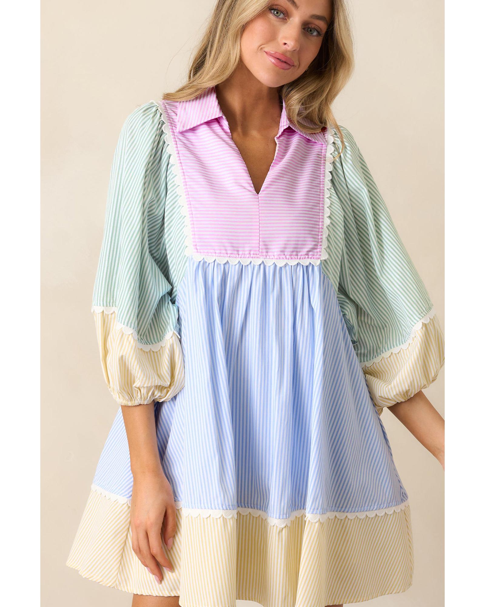 Multicolour Striped Patchwork Ric Rac Puff Sleeve Collared Mini Dress – L