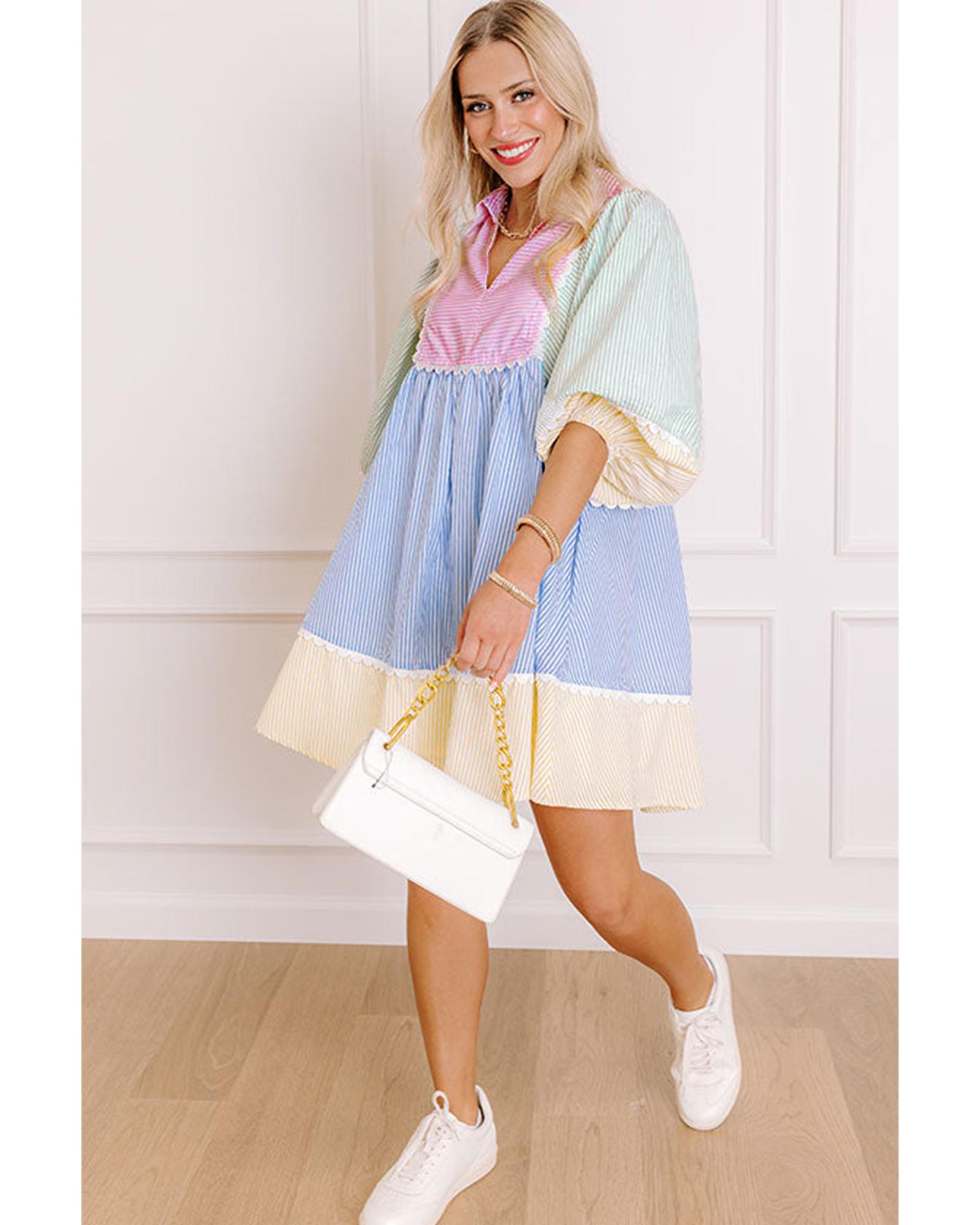 Multicolour Striped Patchwork Ric Rac Puff Sleeve Collared Mini Dress – M