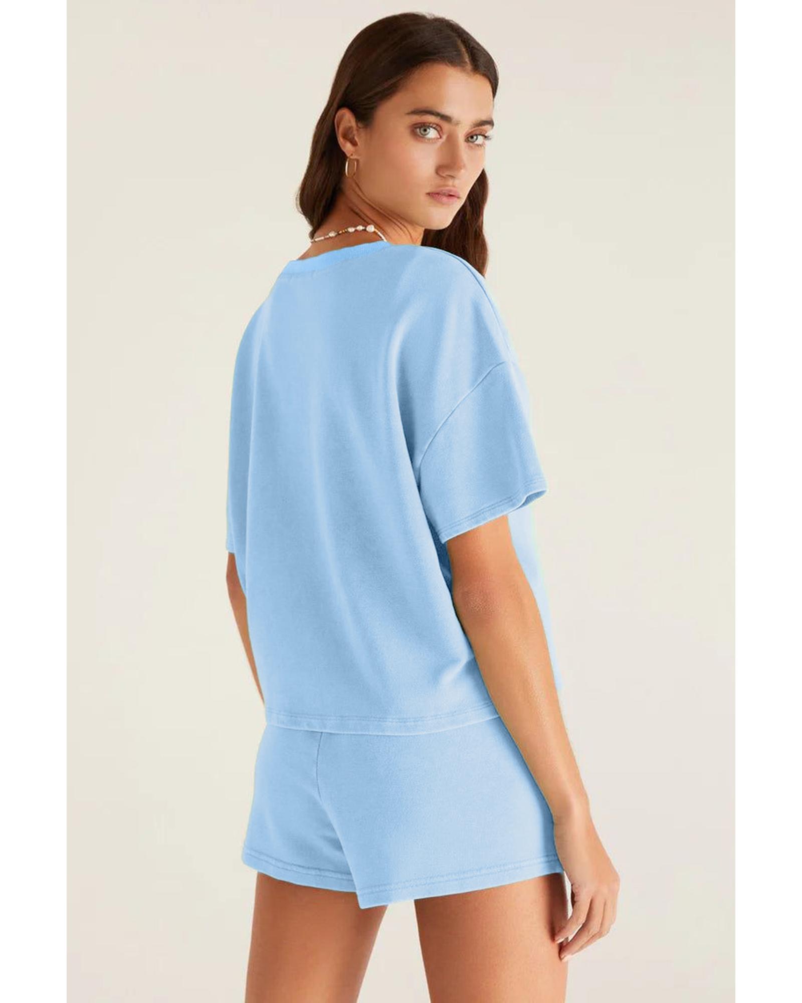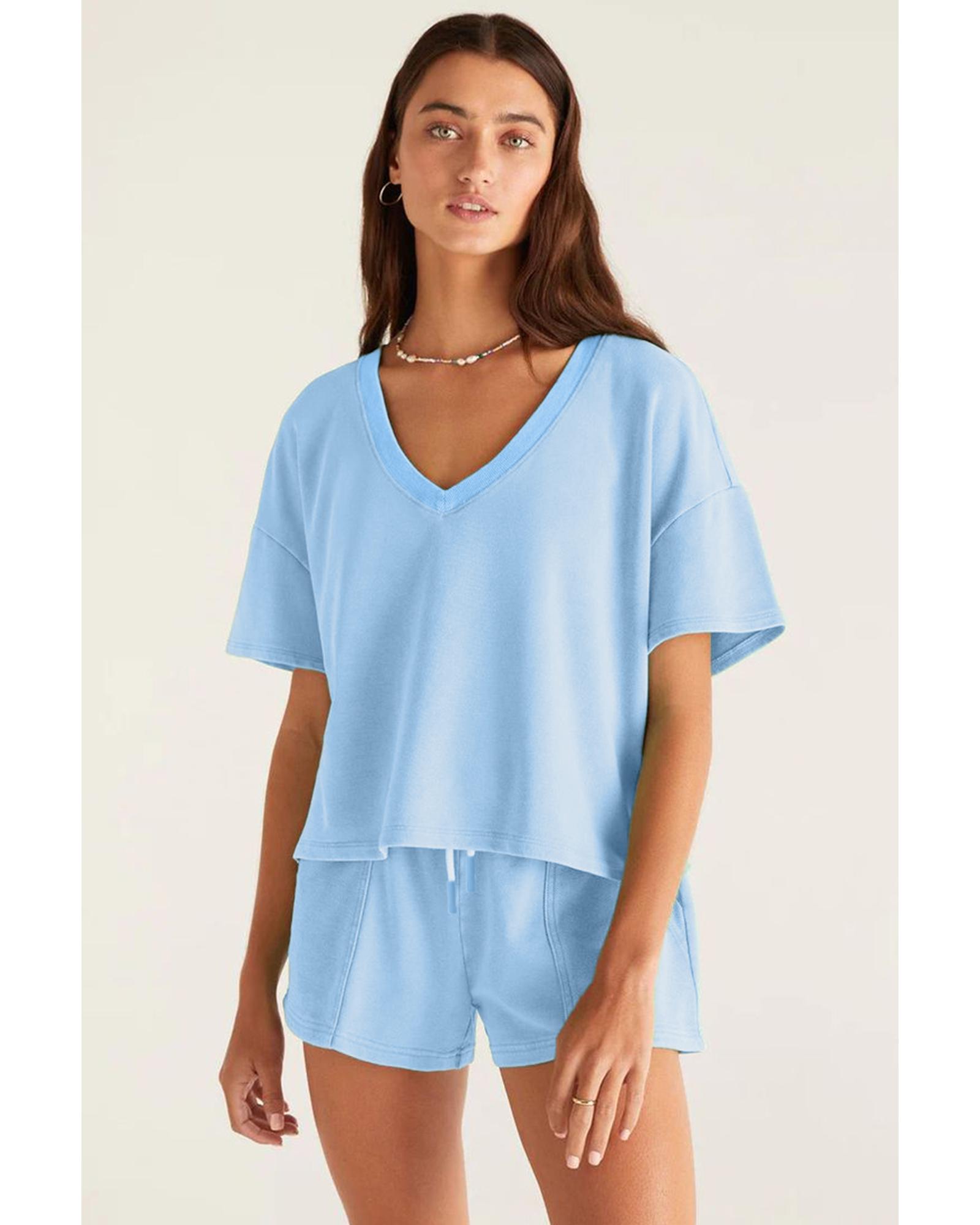 Myosotis V Neck Drop Shoulder Tee and Patchwork Drawstring Shorts Set – L