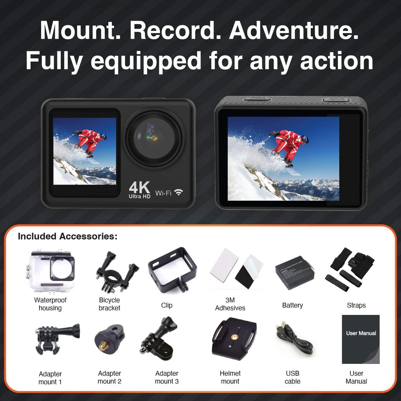 Ready to Mount. Ready for Action: With a complete accessory kit included, this camera is built for every adventure. Mount it to your bike, helmet, surfboard, or gear and start capturing from new perspectives.