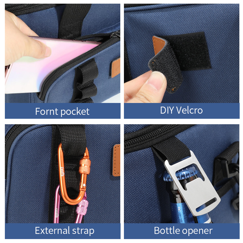 - Convenient Features: Equipped with a bottle opener, side pockets, a front pocket, and an external strap for additional storage and functionality.