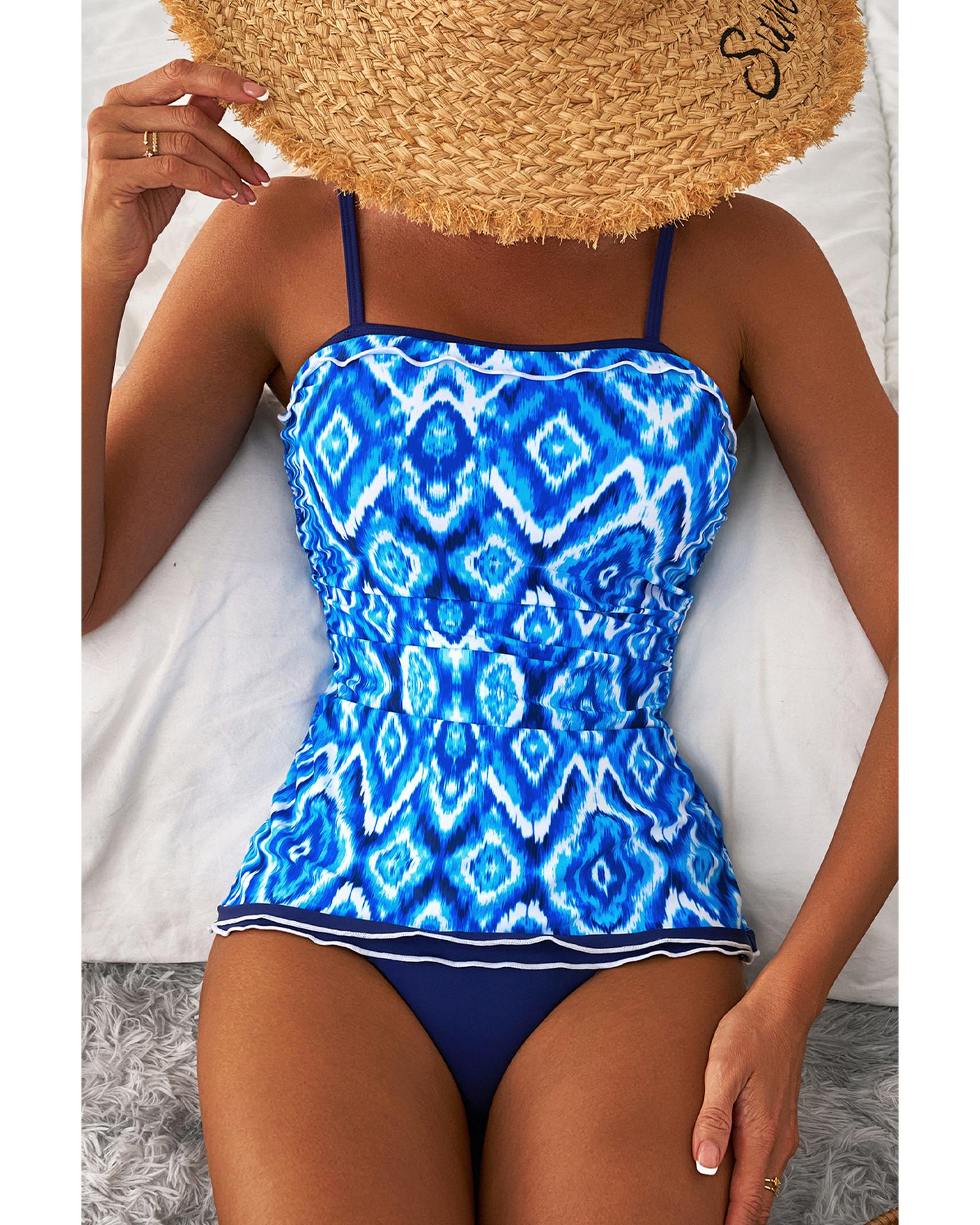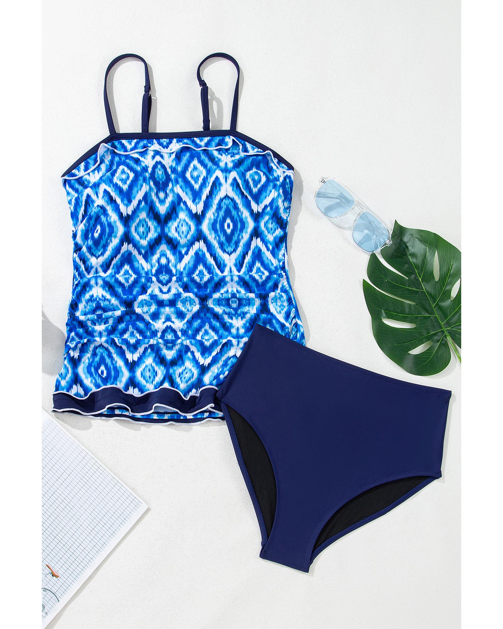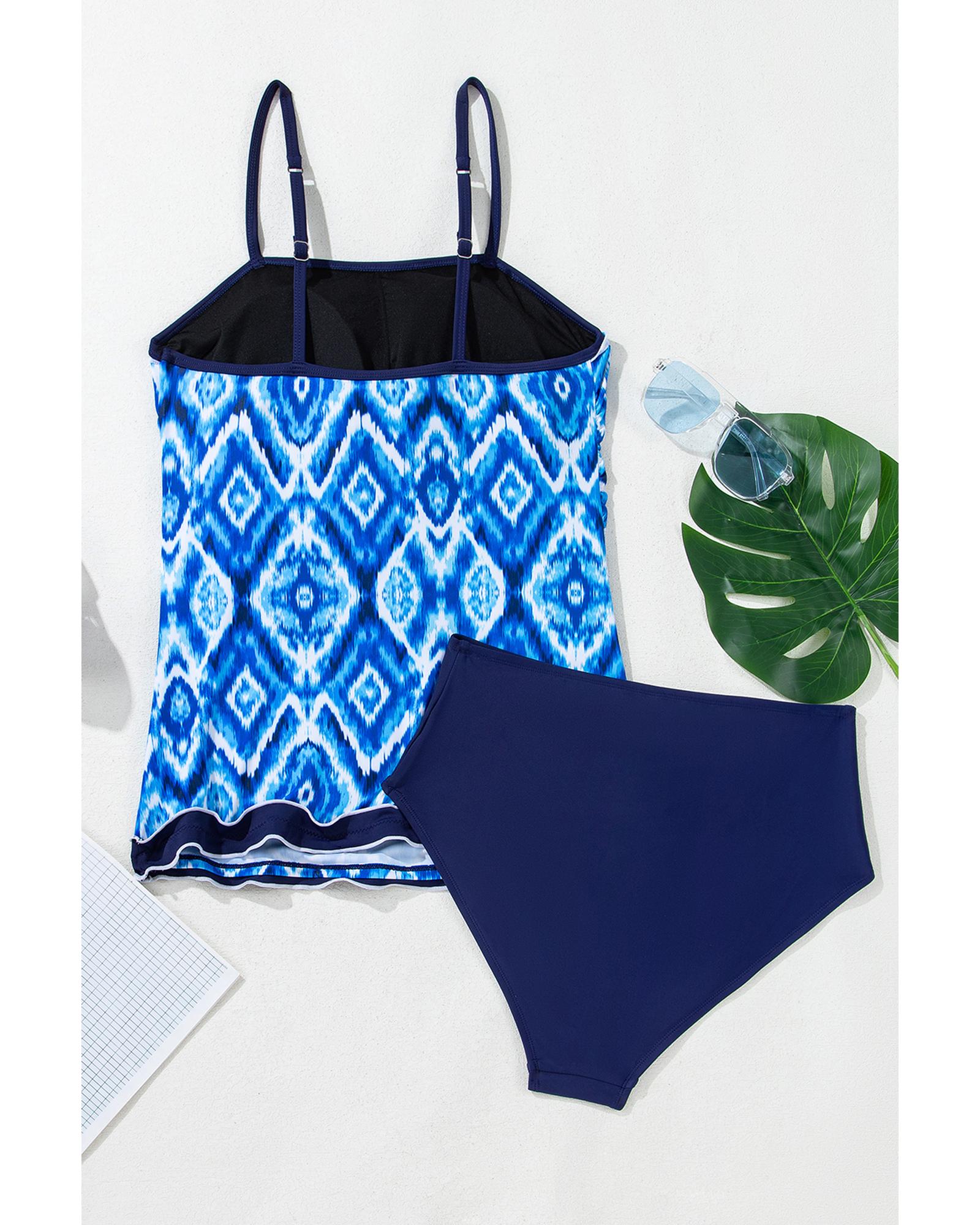 - Navy Blue Abstract Print Frilled Trim Spaghetti Straps Tankini Set