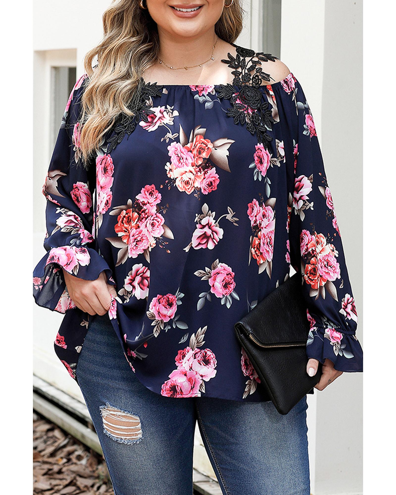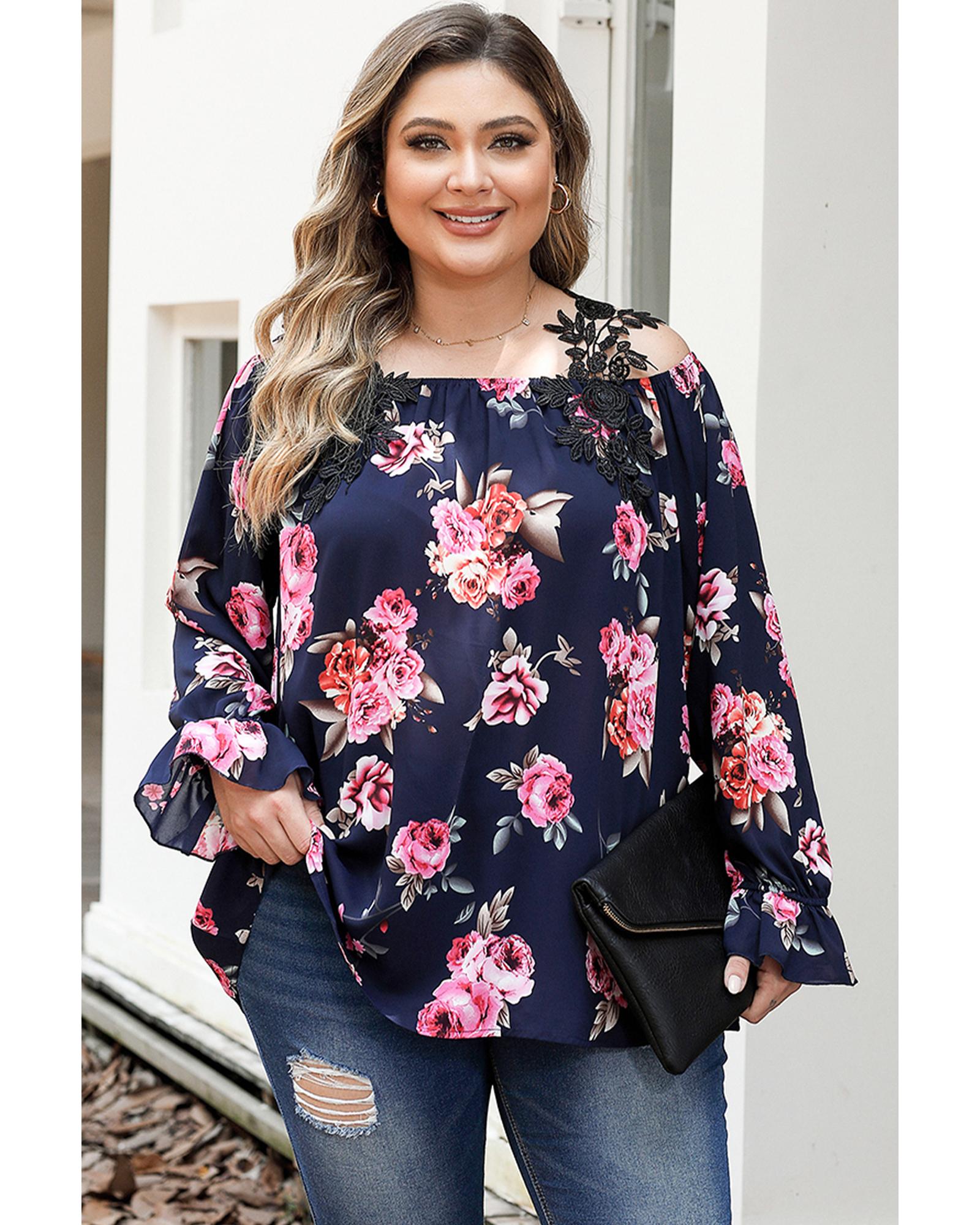 Navy Blue Plus Size Crochet Detail Cold shoulder Floral Blouse – 1X