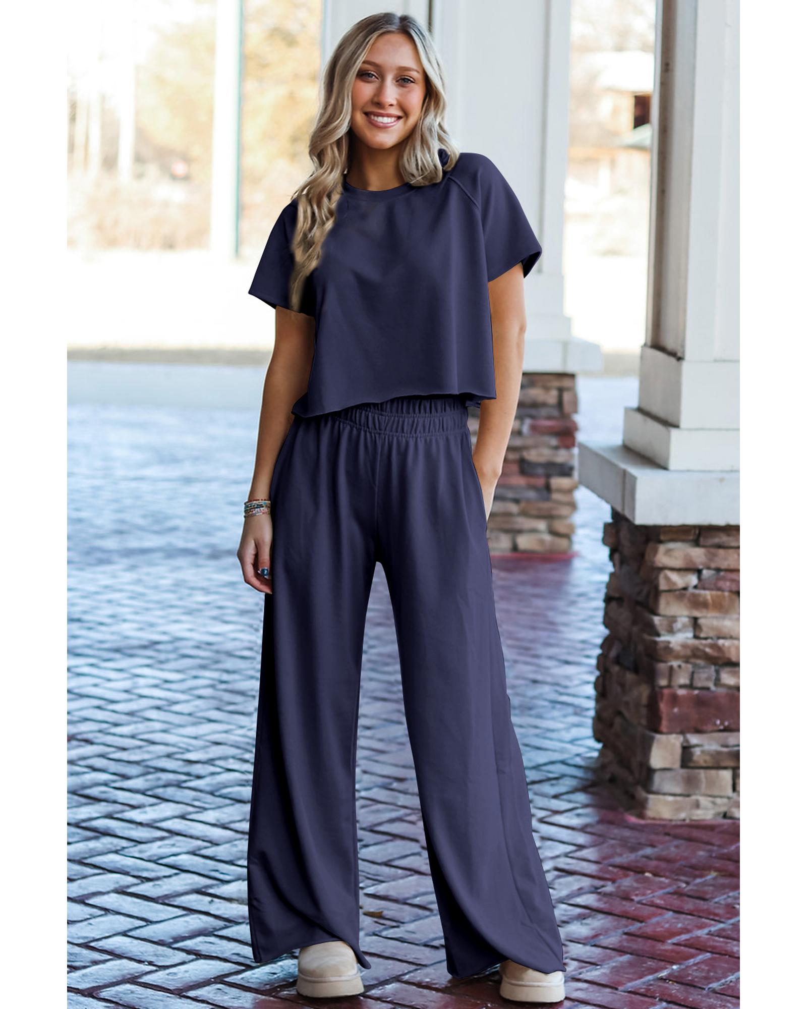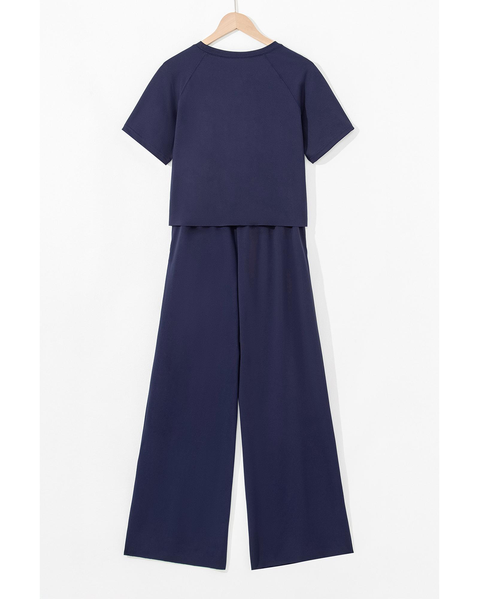 Navy Blue Raw Hem Loose Tee and Wide Leg Pants Set - L