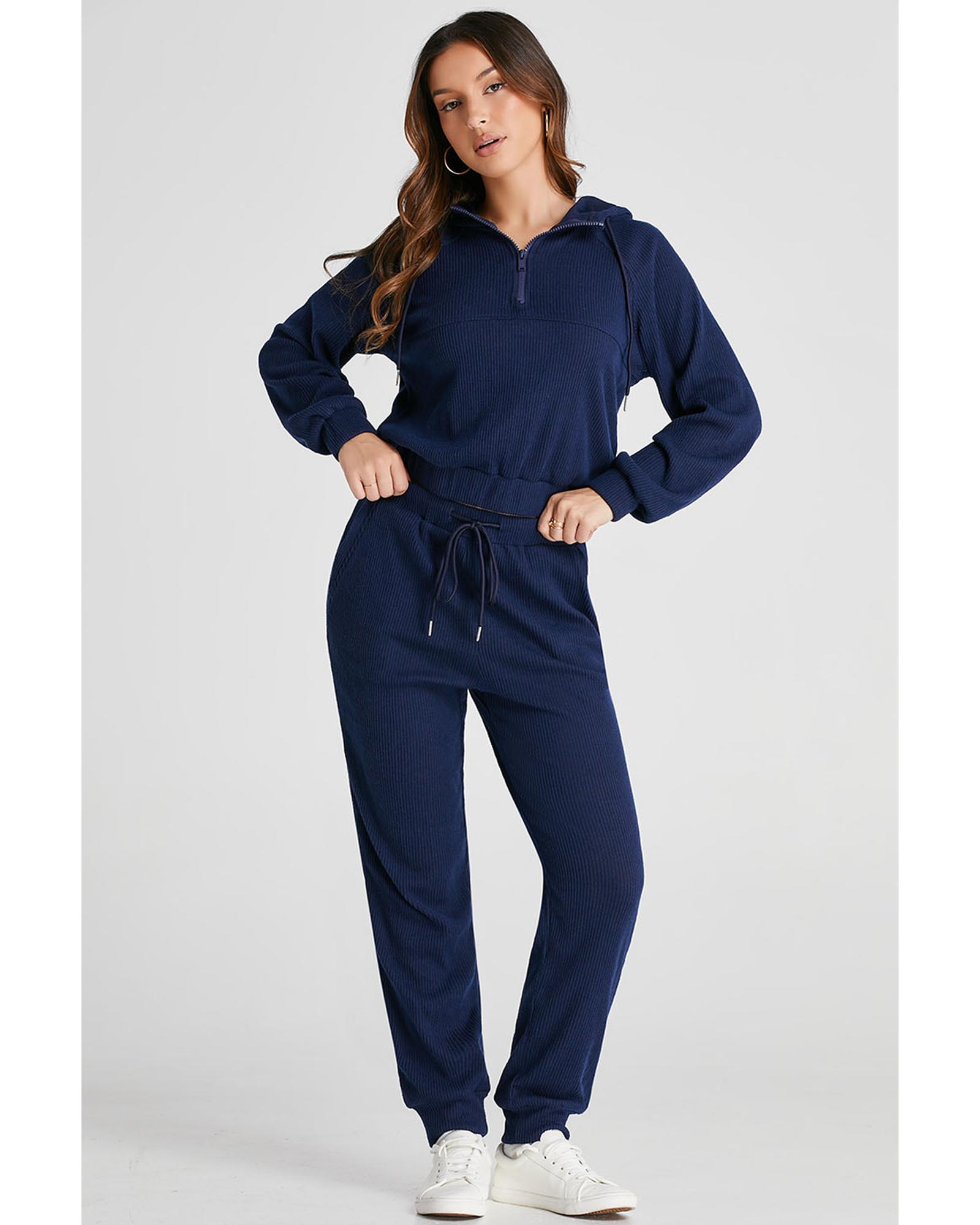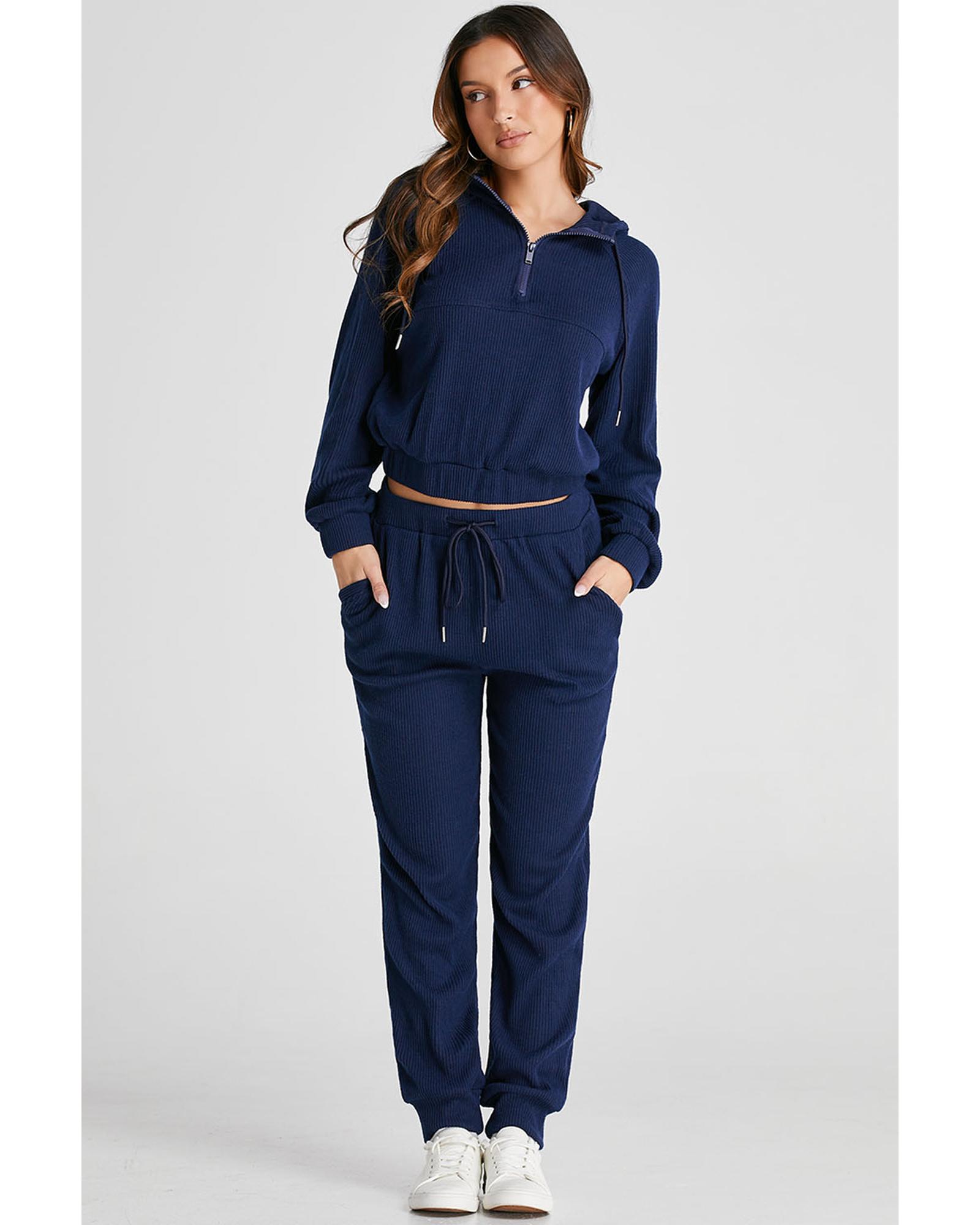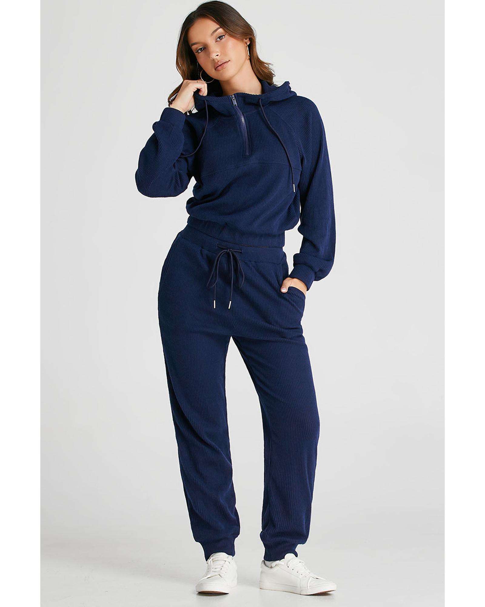 - Navy blue ribbed knit cropped hoodie and drawstring joggers set