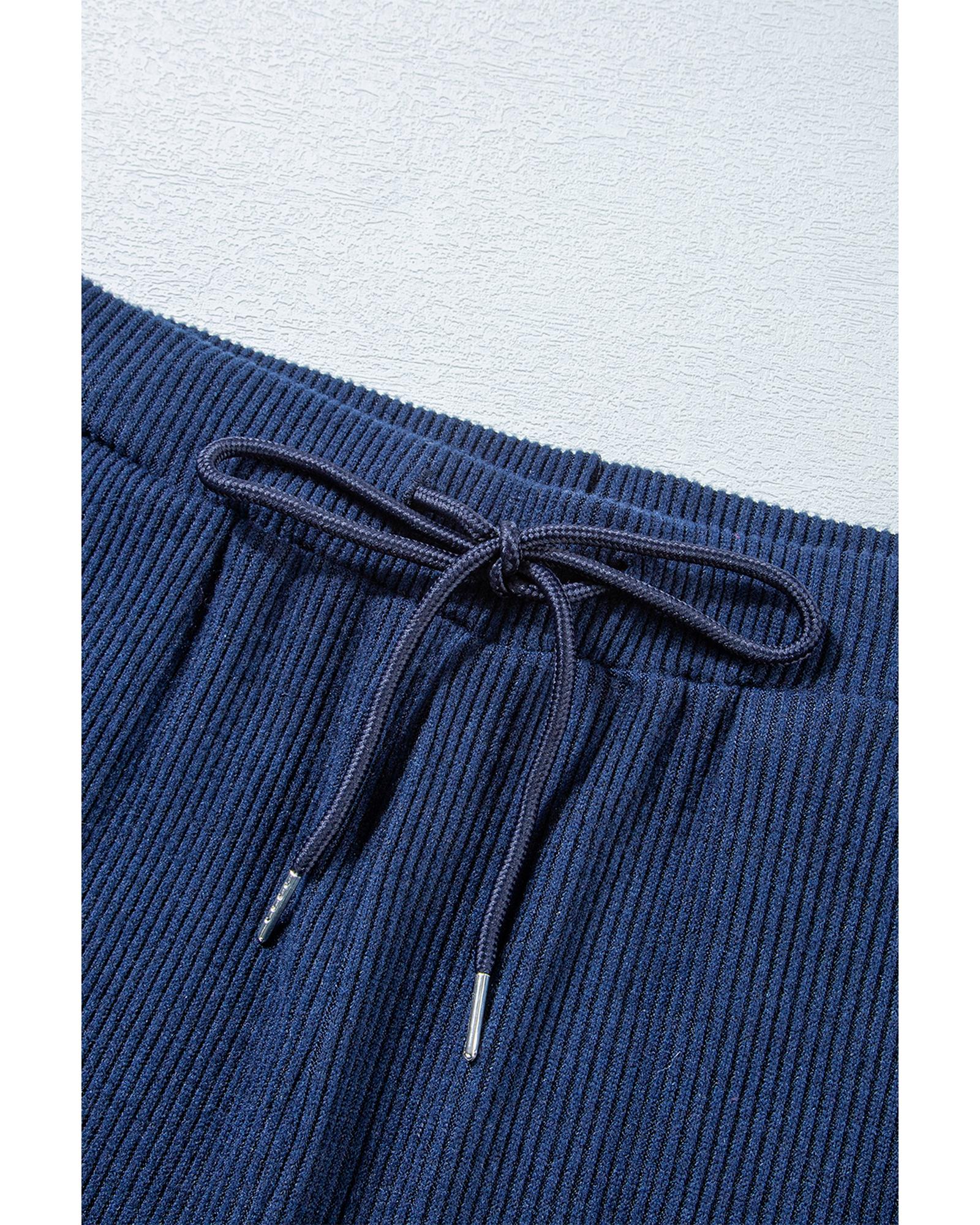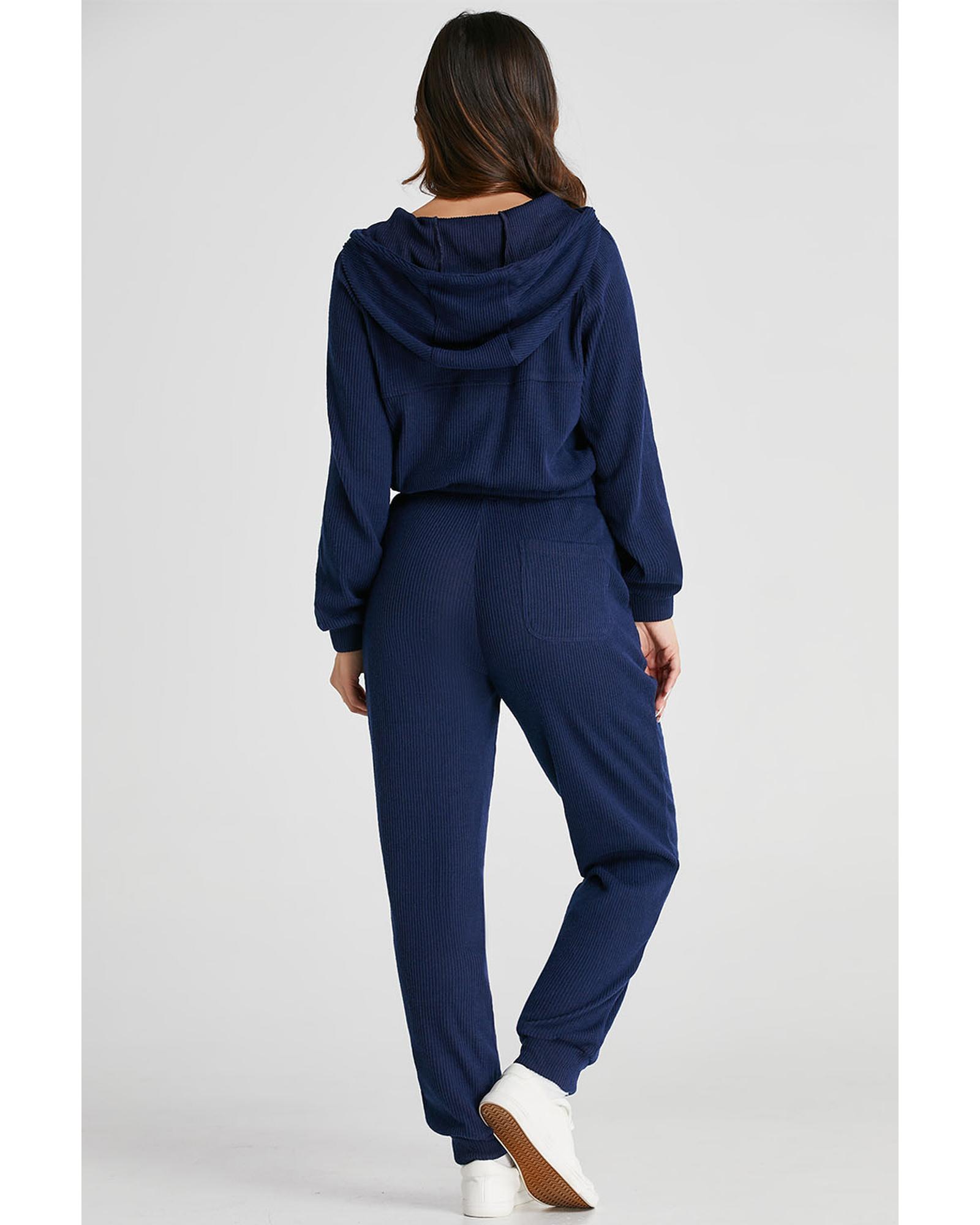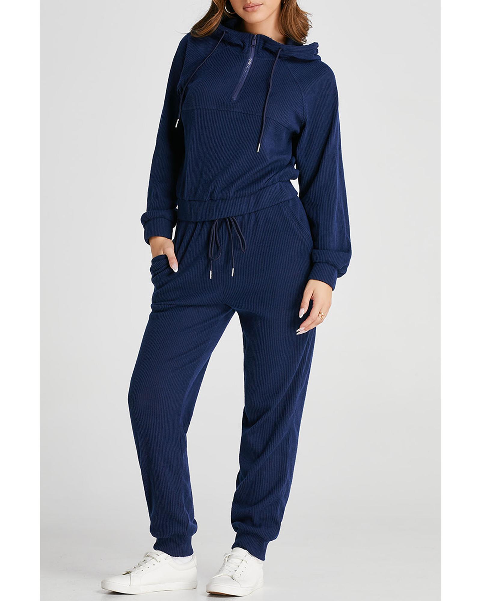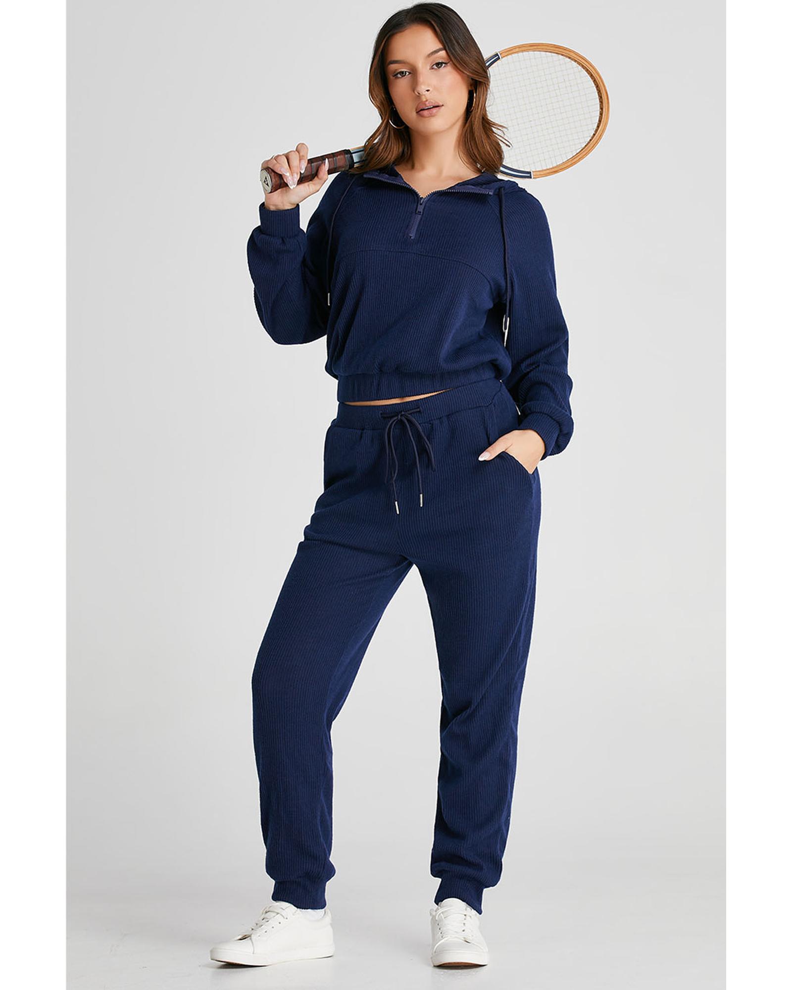 - Navy blue ribbed knit cropped hoodie and drawstring joggers set