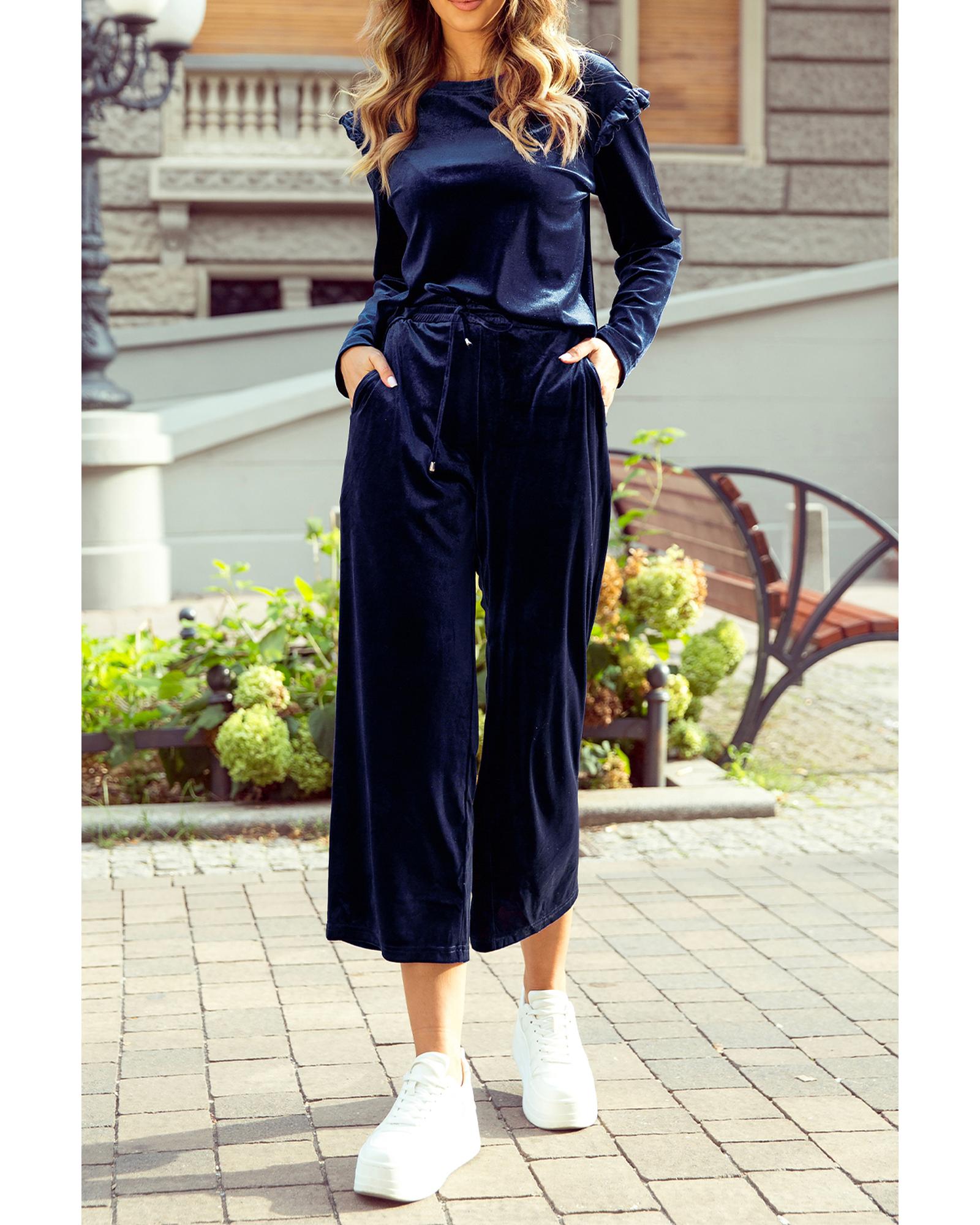 Navy Blue Solid Velvet Ruffled Two Piece Pants Set - S