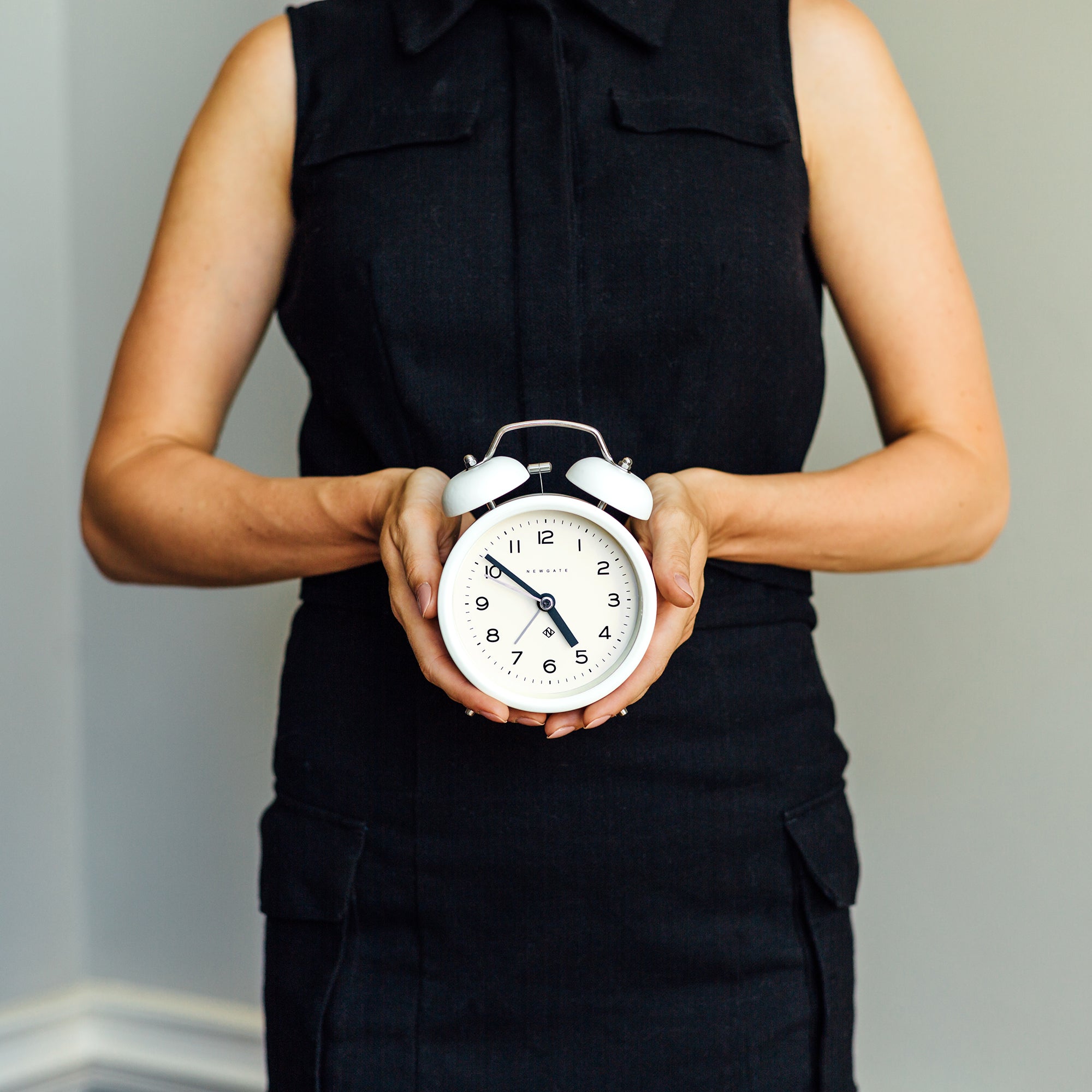 Newgate Charlie Bell Echo Matte Pebble White A modern white alarm clock with a contemporary graphic dial and a moving hammer and twin-bell alarm.