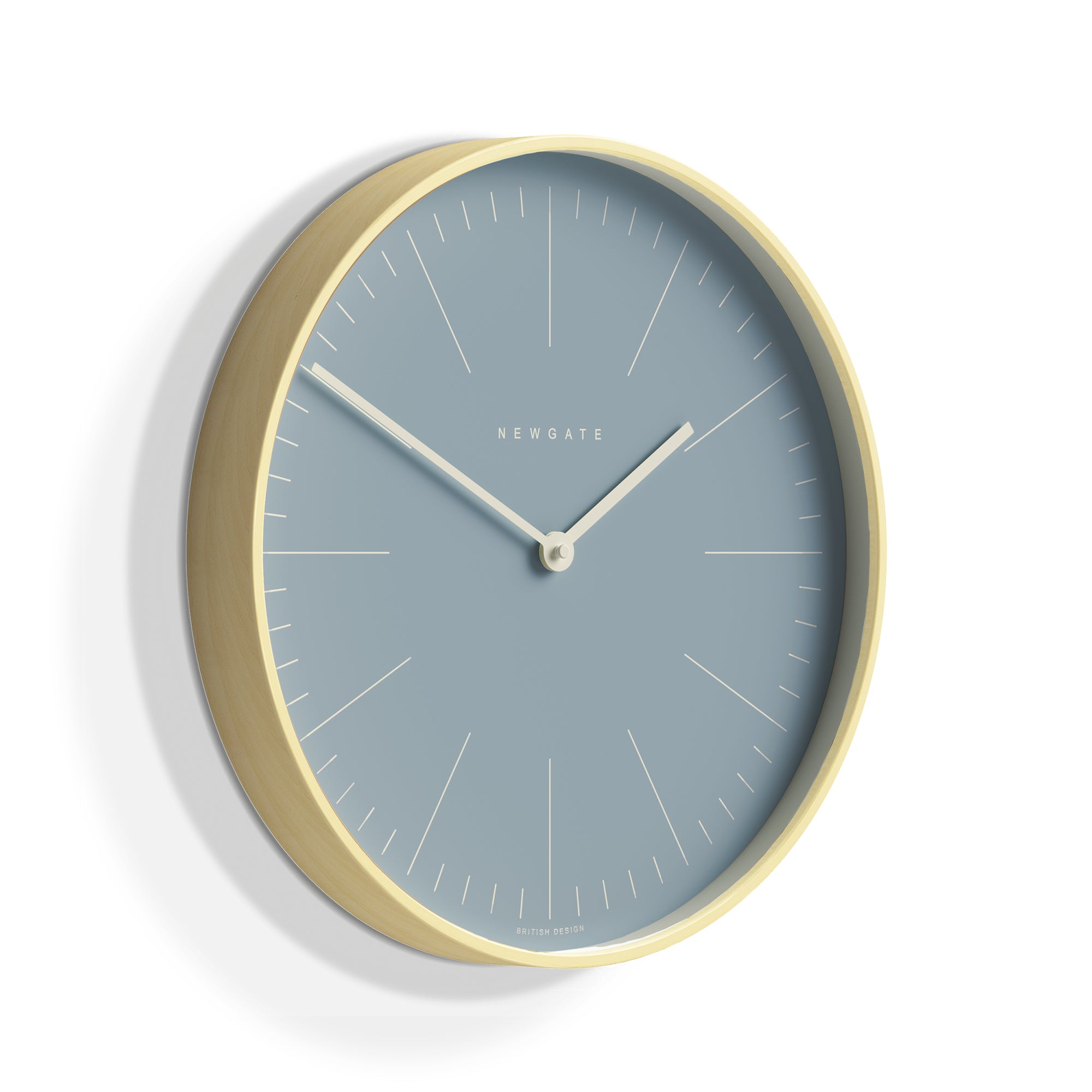 Newgate Mr Clarke Clock Pale Wood Pill Blue Dial 128 A modern Scandinavian-inspired wall clock with a pale plywood case and a contemporary ‘Pill Blue’ face with a minimalist marker dial.