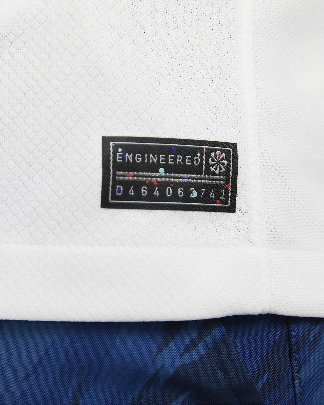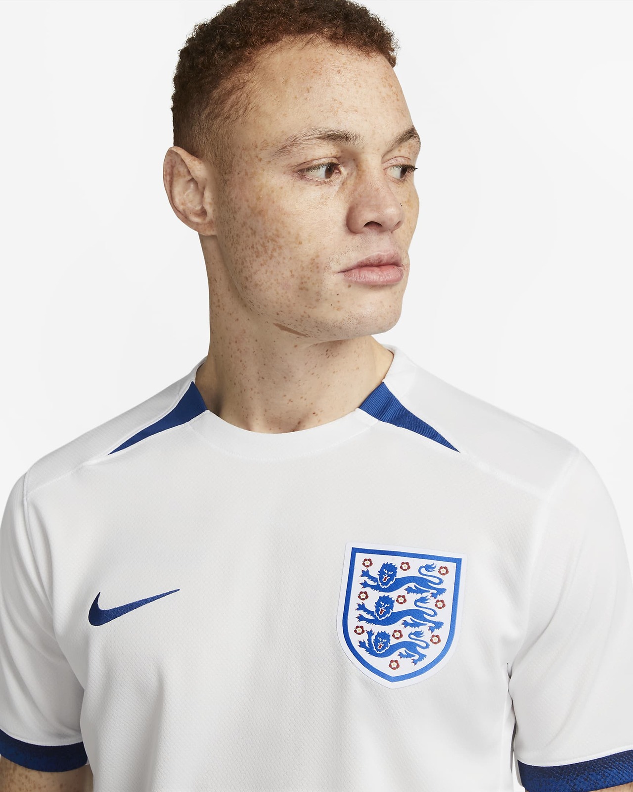 With a white and blue colorway, the England 2023 Home jersey nods to the national team’s impassioned attempt to capture a championship in ’84. A graffiti-inspired accent on the sleeves pairs with a deconstructed England graphic hidden on the insides gives this throwback design a modern feel. Like other jerseys in our Stadium collection, this one pairs replica design details with sweat-wicking technology to give you a game-ready look inspired by the Lionesses