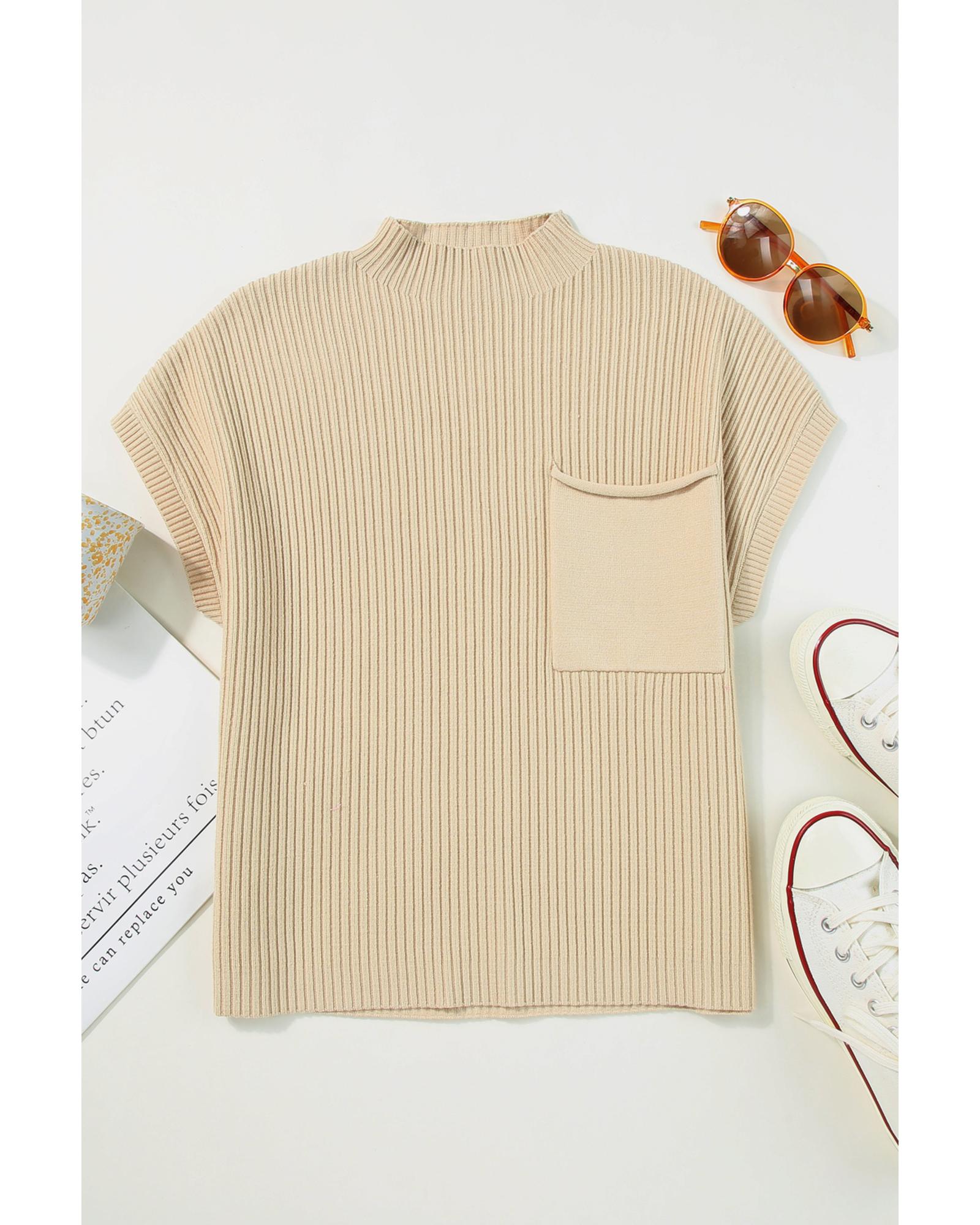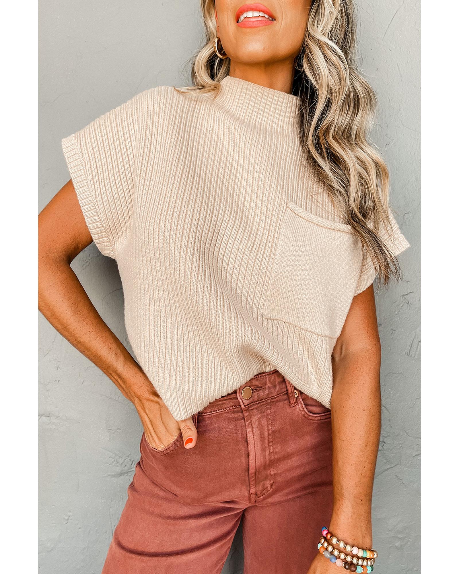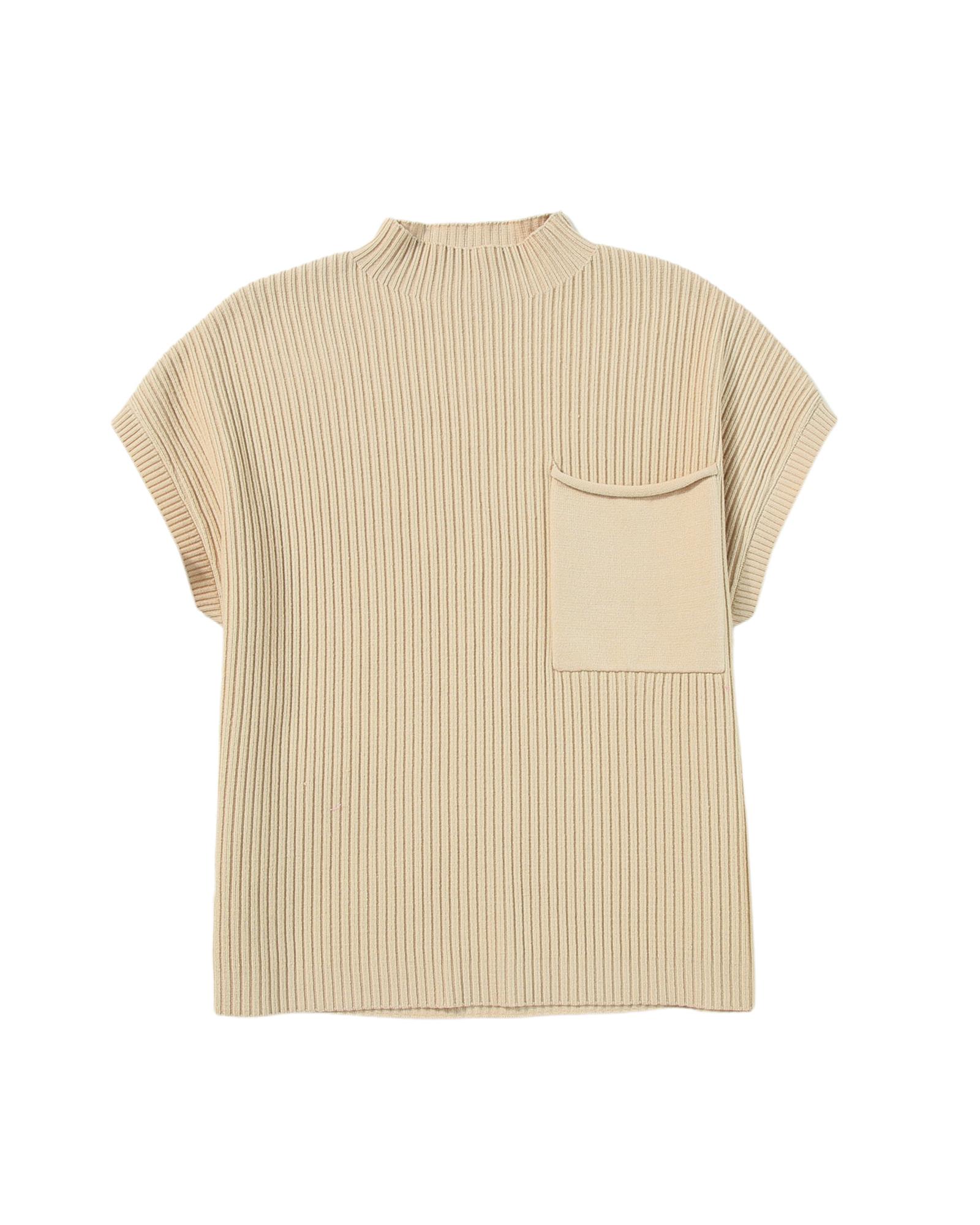 - Oatmeal patch pocket ribbed knit short sleeve sweater