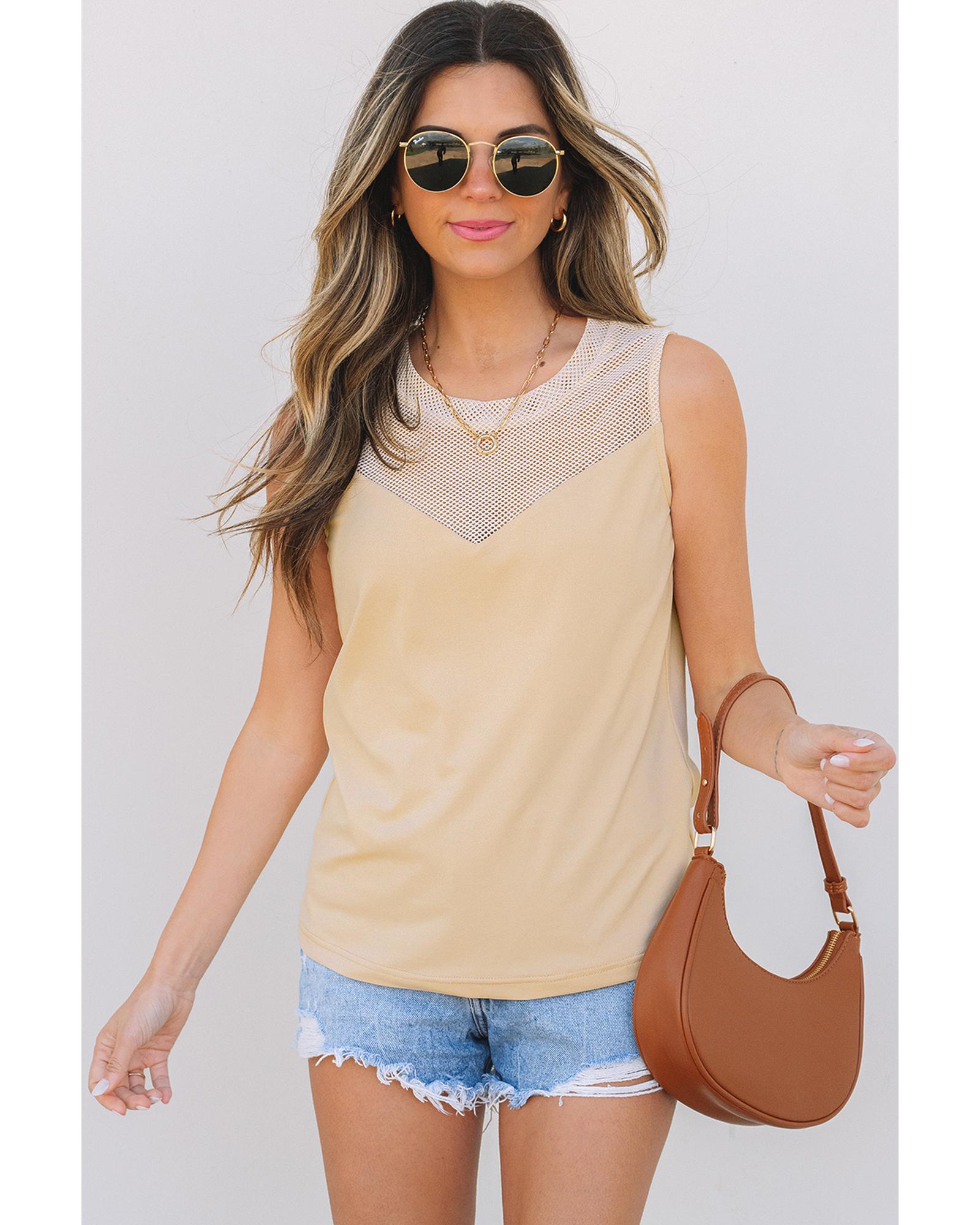 Oatmeal Solid Mesh Patchwork Crew Neck Tank Top – L