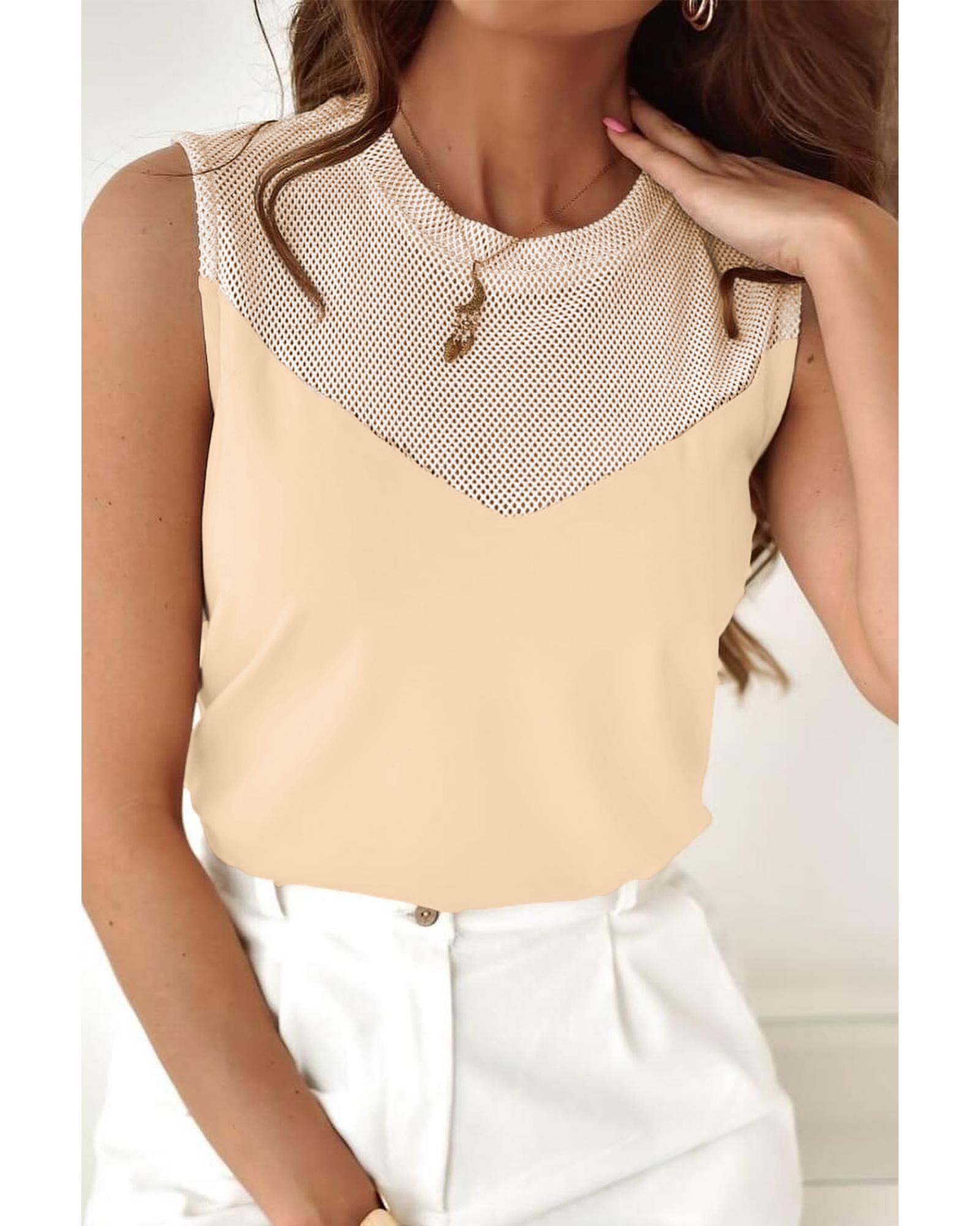 Oatmeal Solid Mesh Patchwork Crew Neck Tank Top – M