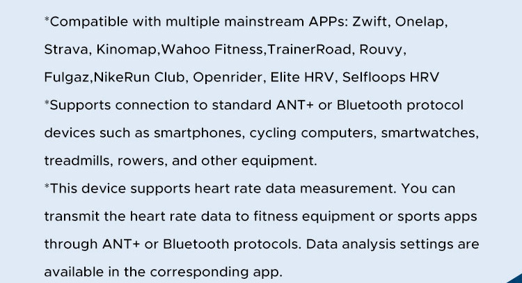 • Wide App Compatibility: Works with multiple mainstream fitness apps such as Zwift, Onelap, Strava, Kinomap, Wahoo Fitness, TrainerRoad, Rouvy, and NikeRun Club.