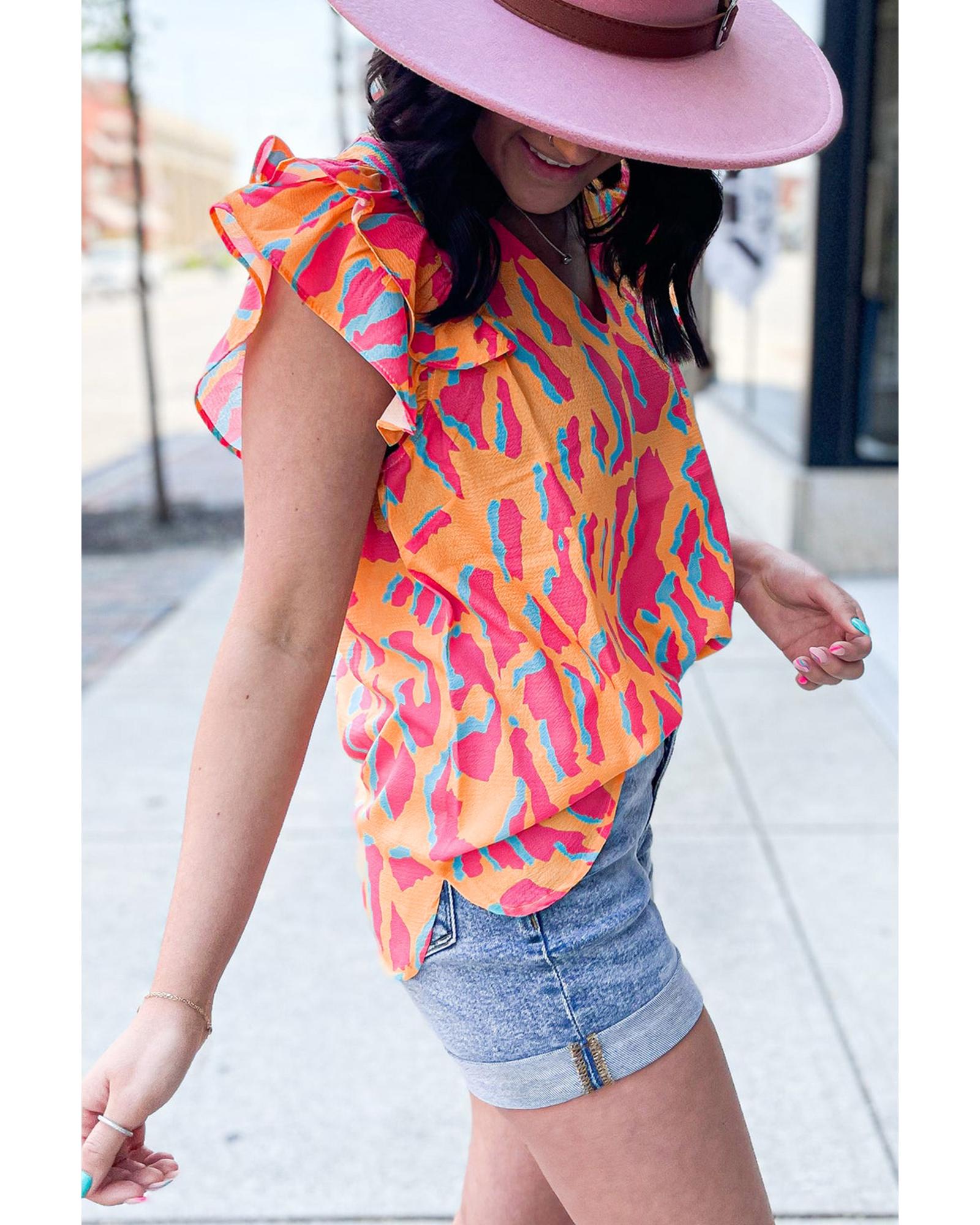 Orange Abstract Print V Neck Ruffled Sleeve Blouse – S