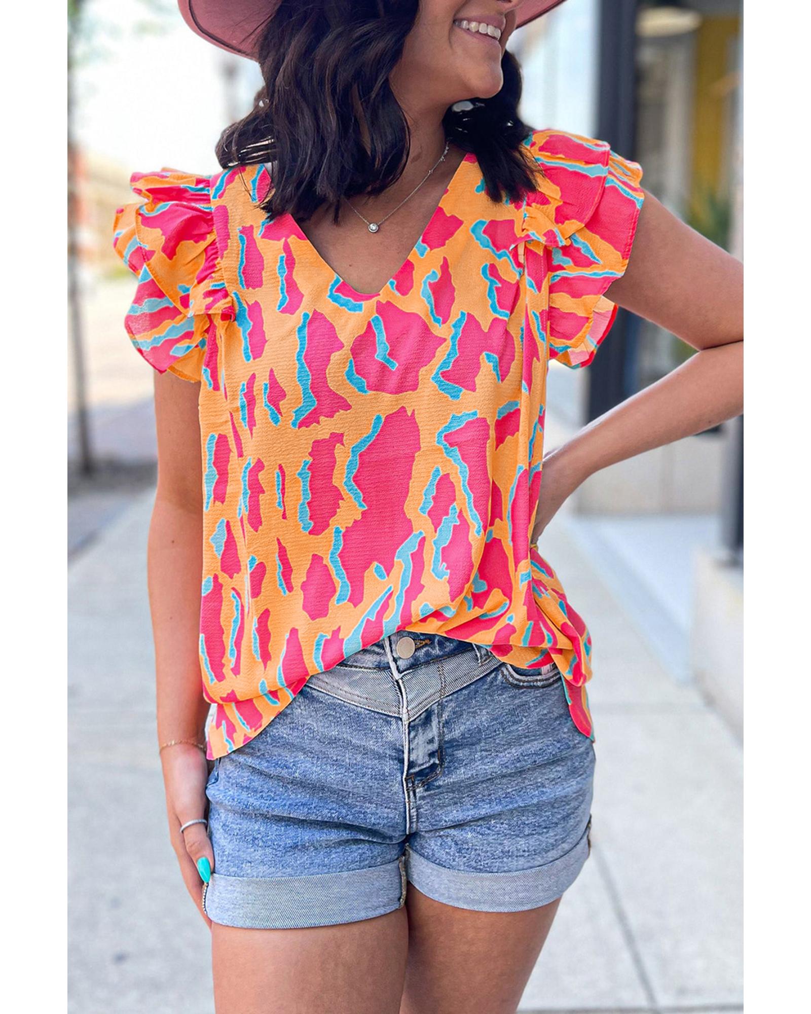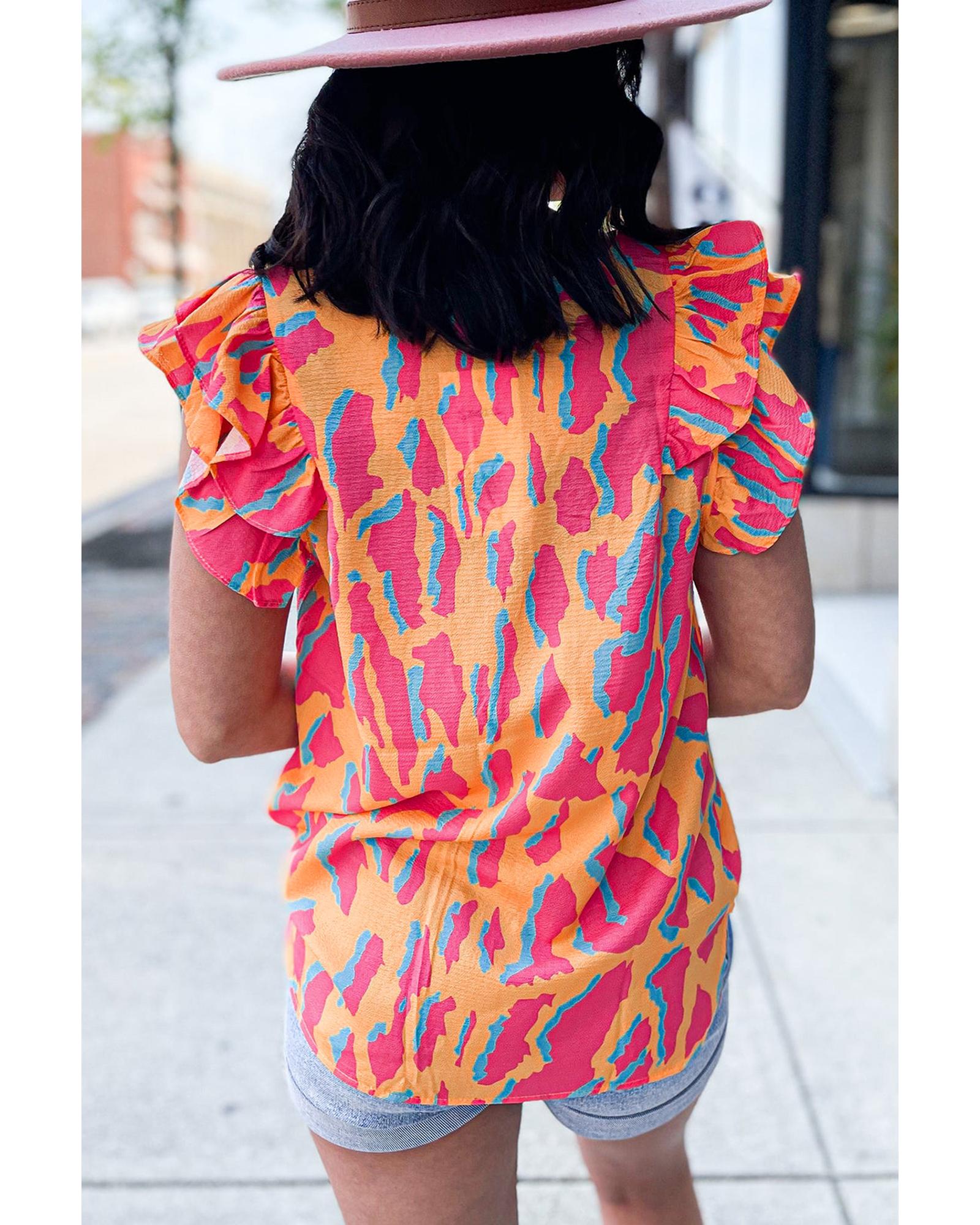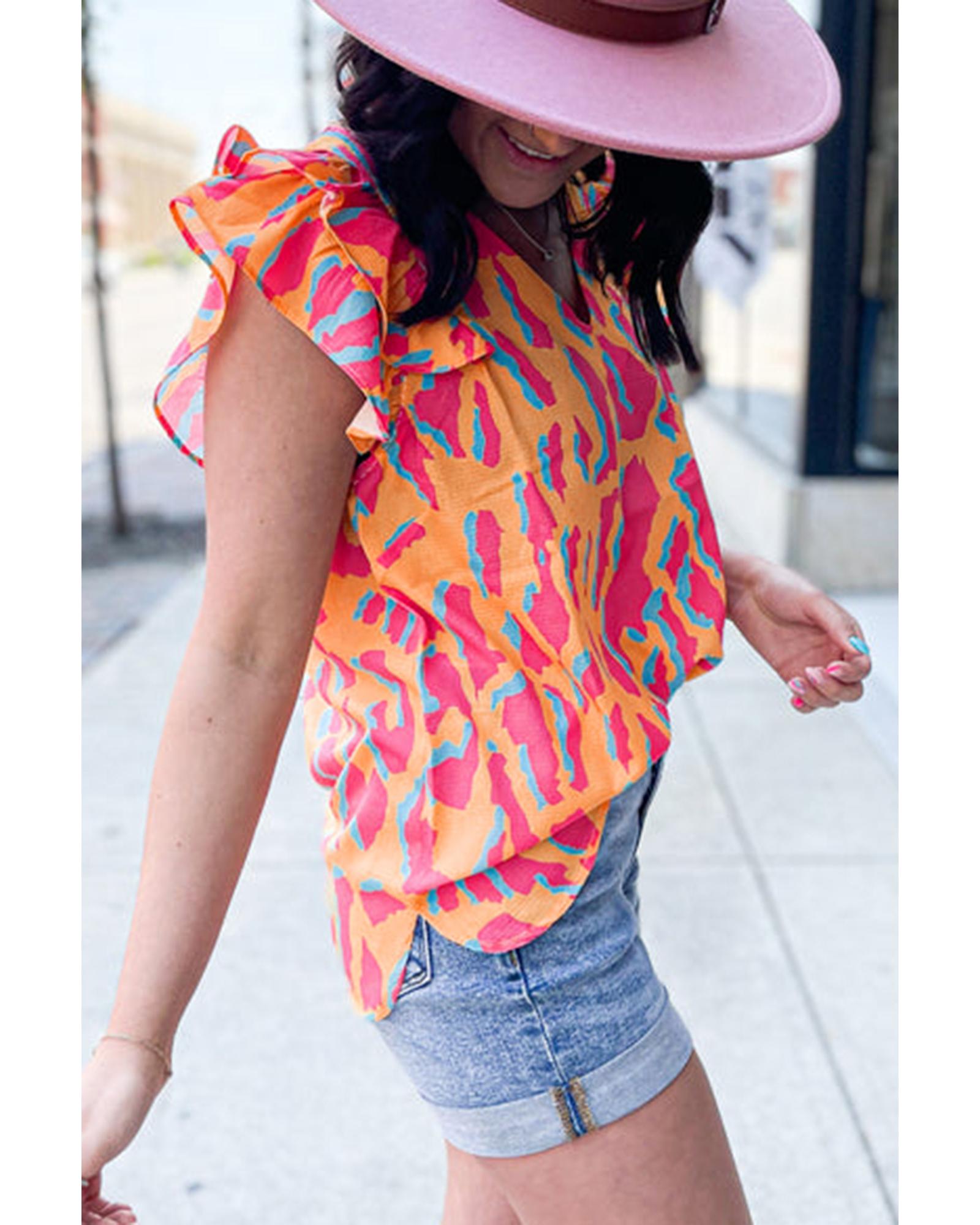 Orange Abstract Print V Neck Ruffled Sleeve Blouse – XL