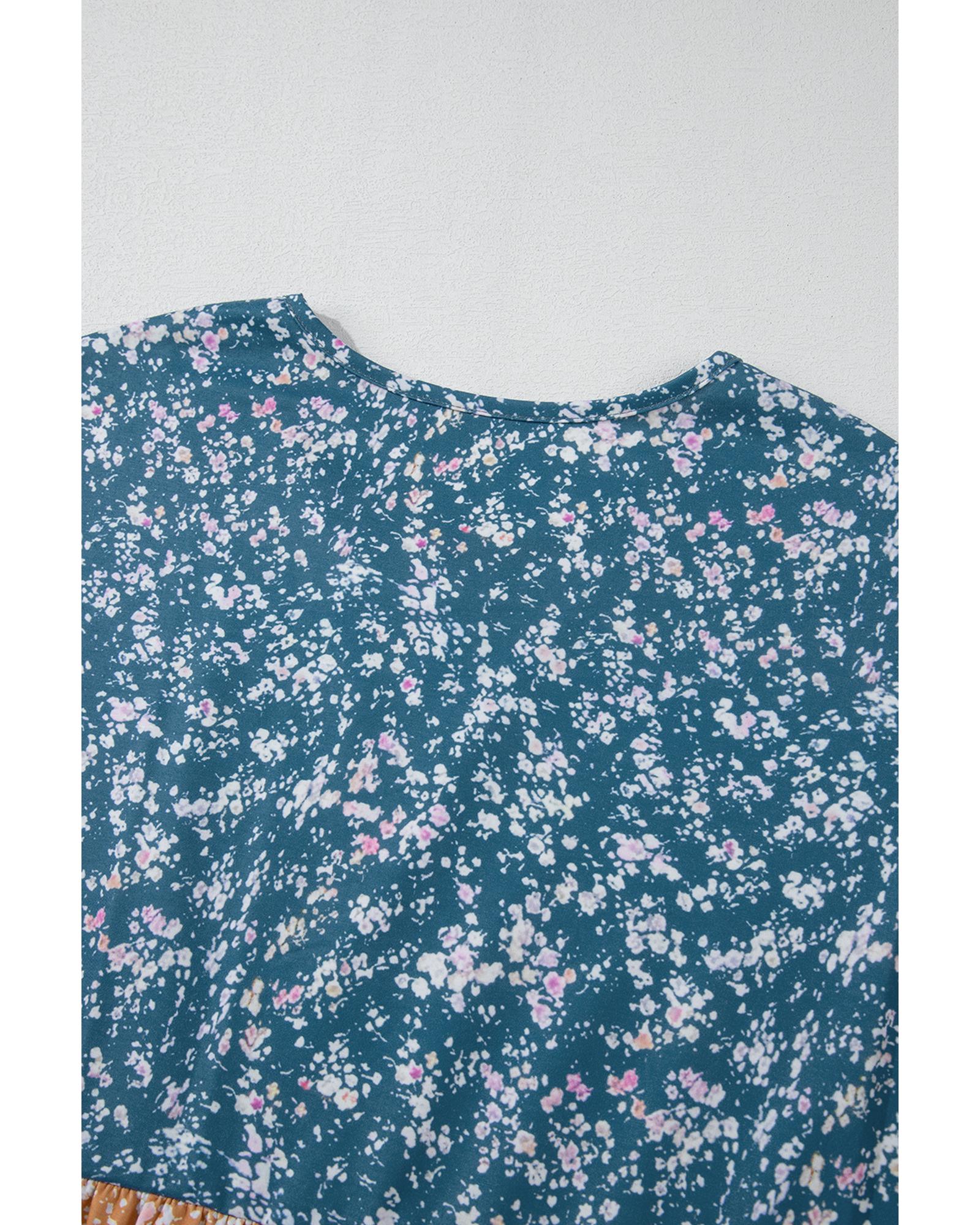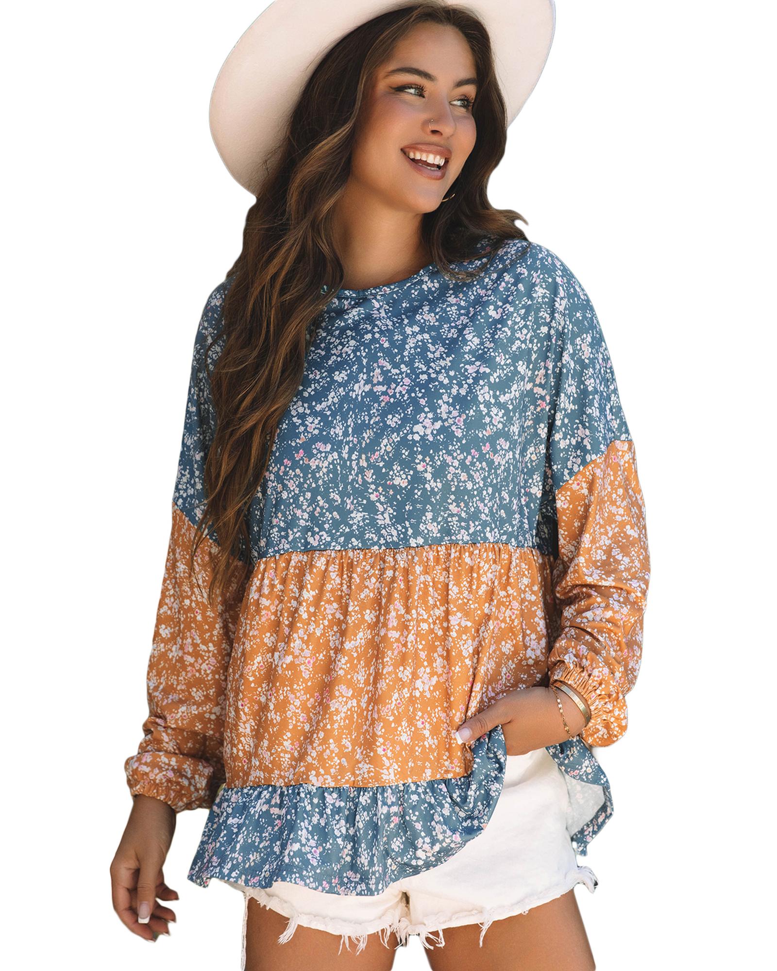 Orange Floral Color Block Patchwork Ruffled Hem Round Neck Blouse – L