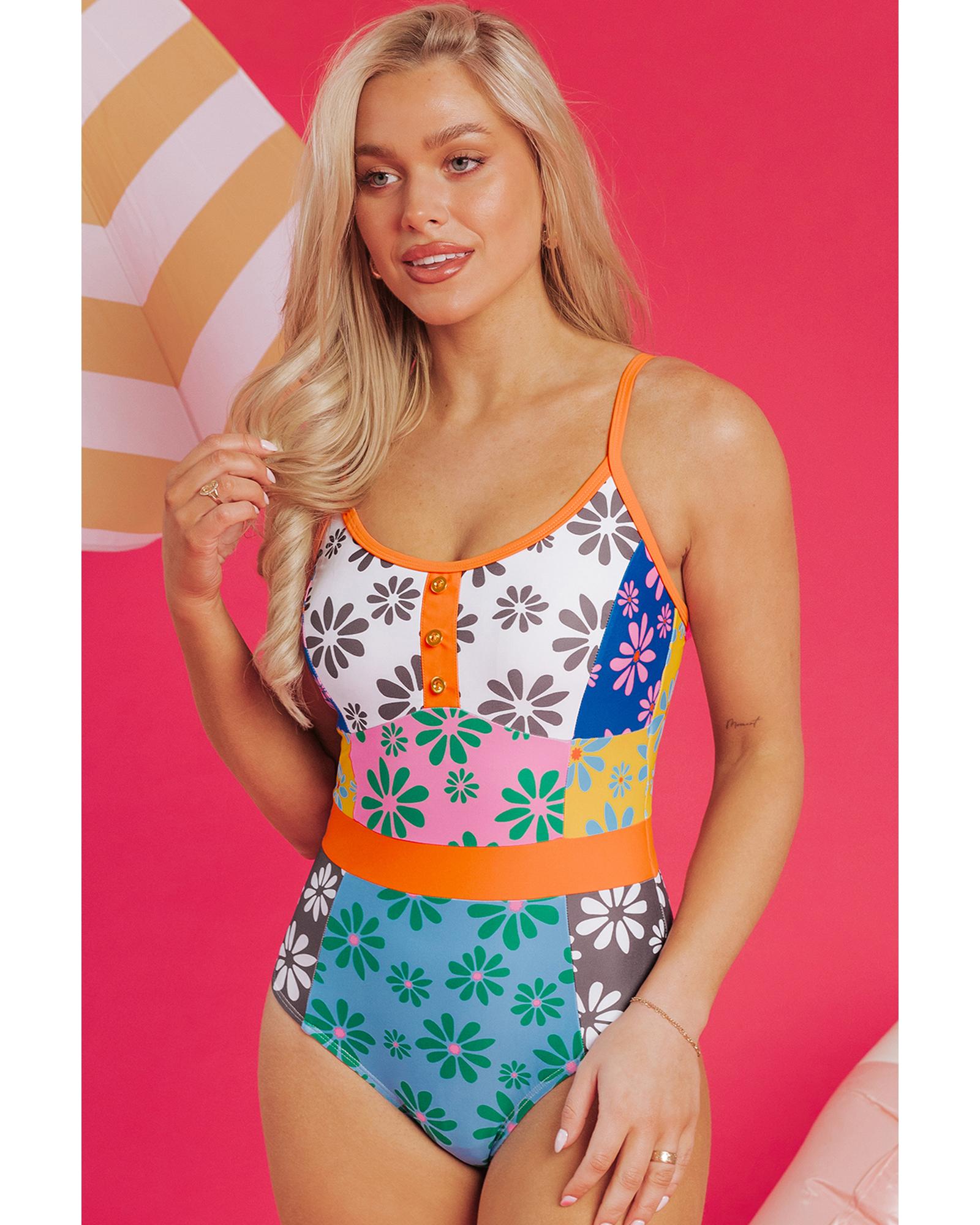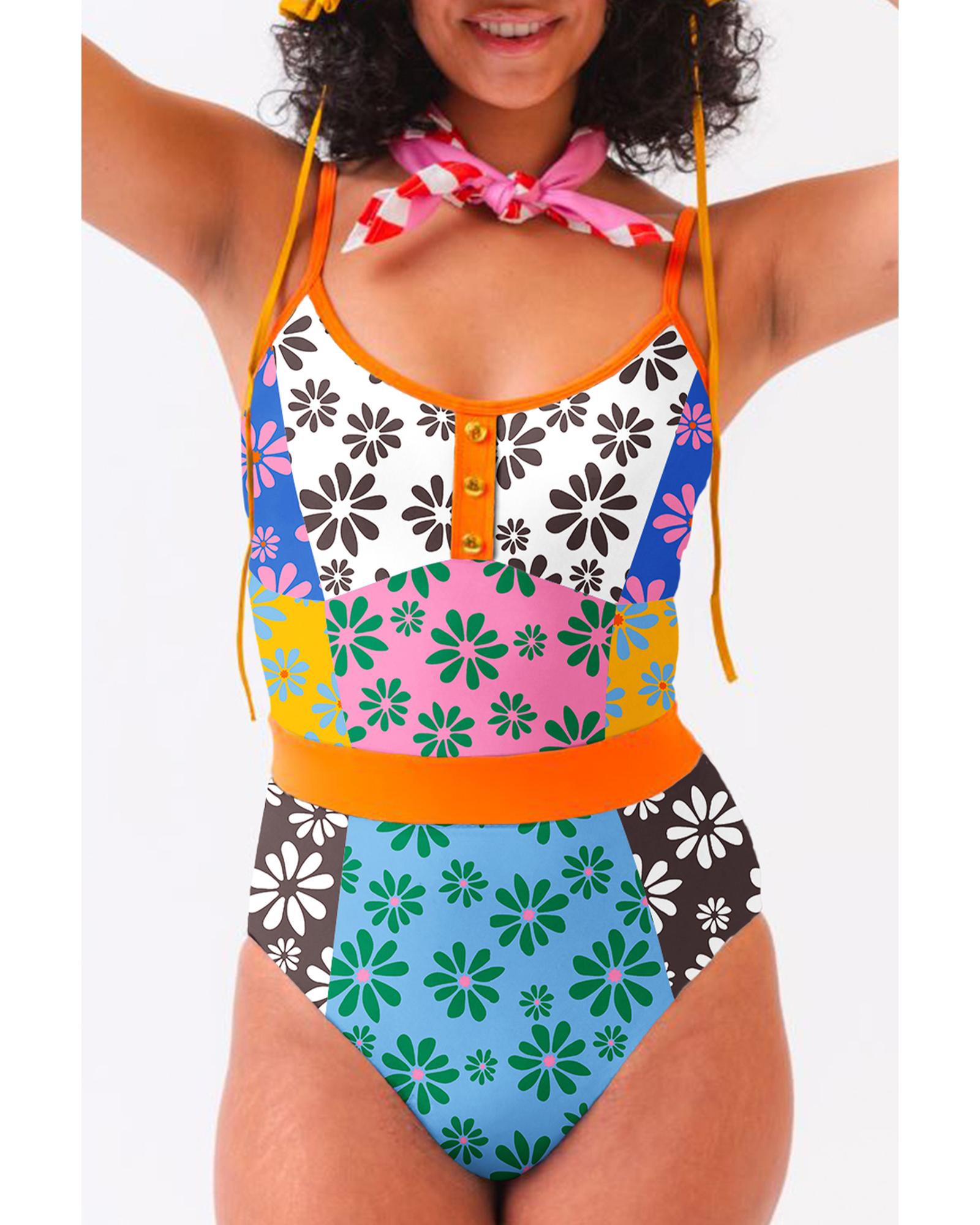 Orange Floral Colorblock Buttoned Decor Front Spaghetti Straps Teddy Swimsuit – L