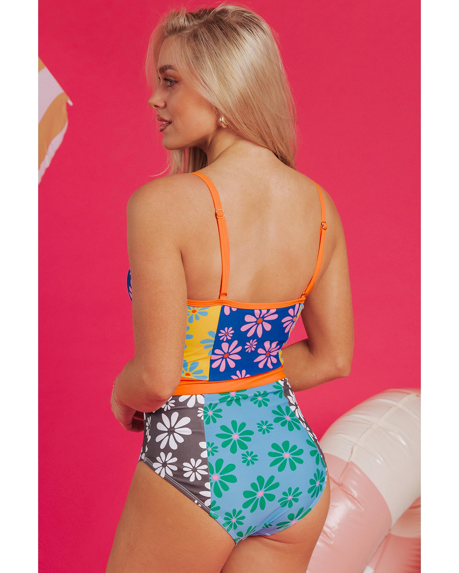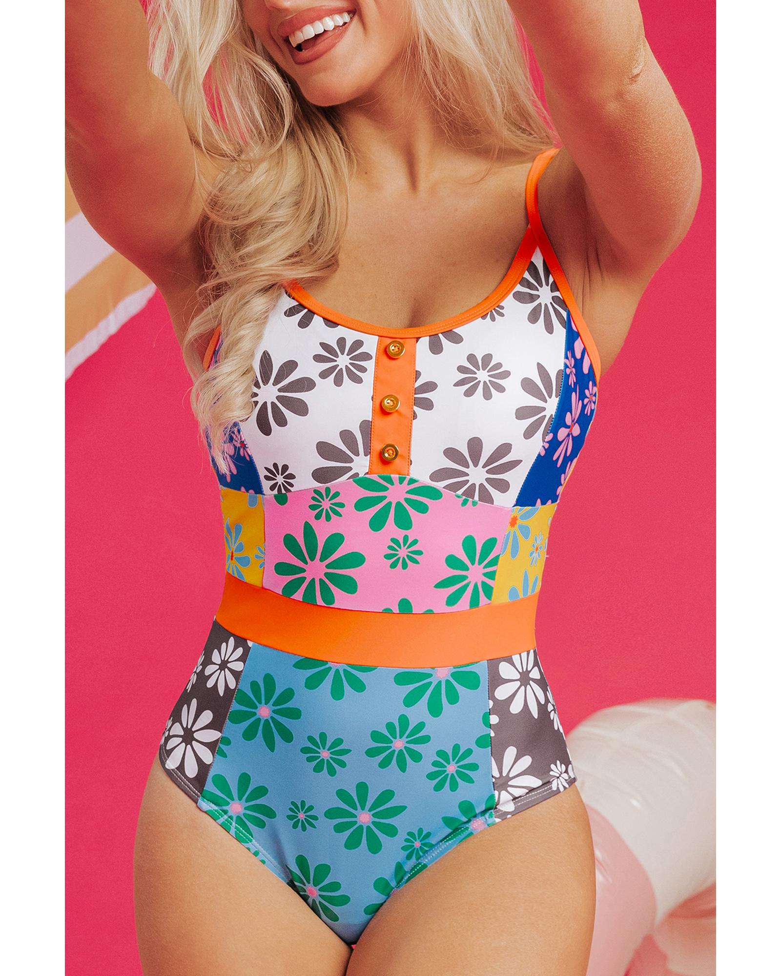 Orange Floral Colorblock Buttoned Decor Front Spaghetti Straps Teddy Swimsuit – M