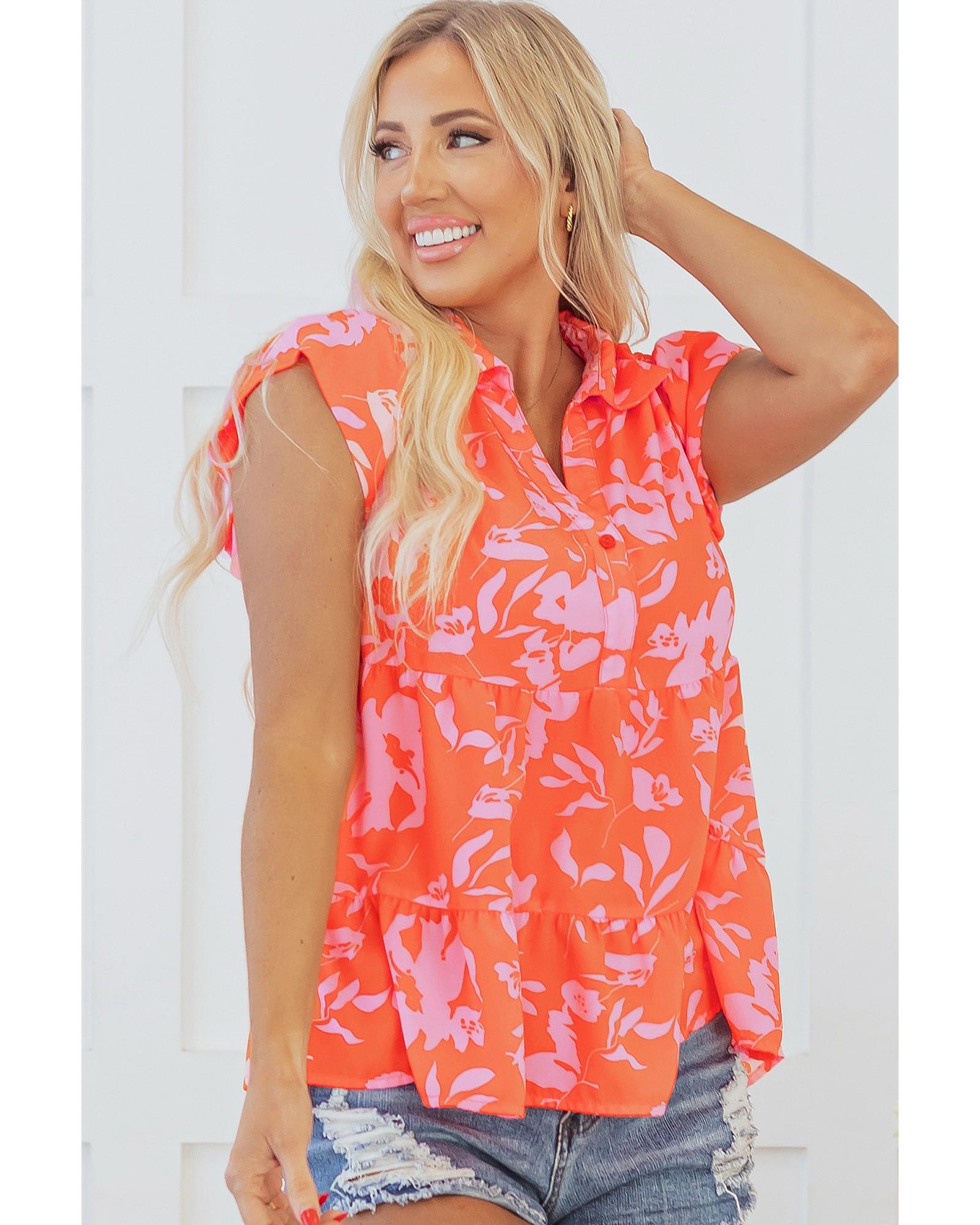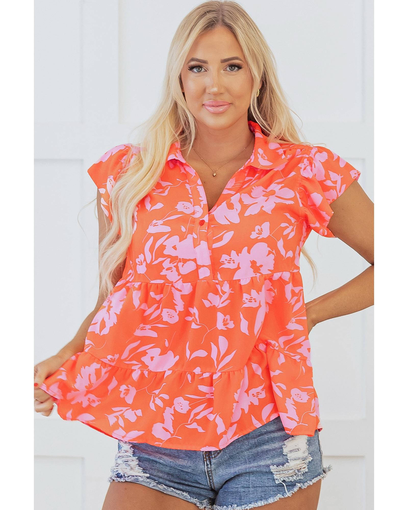 Orange Floral Print Collared Button Neckline Flutter Sleeve Blouse – M
