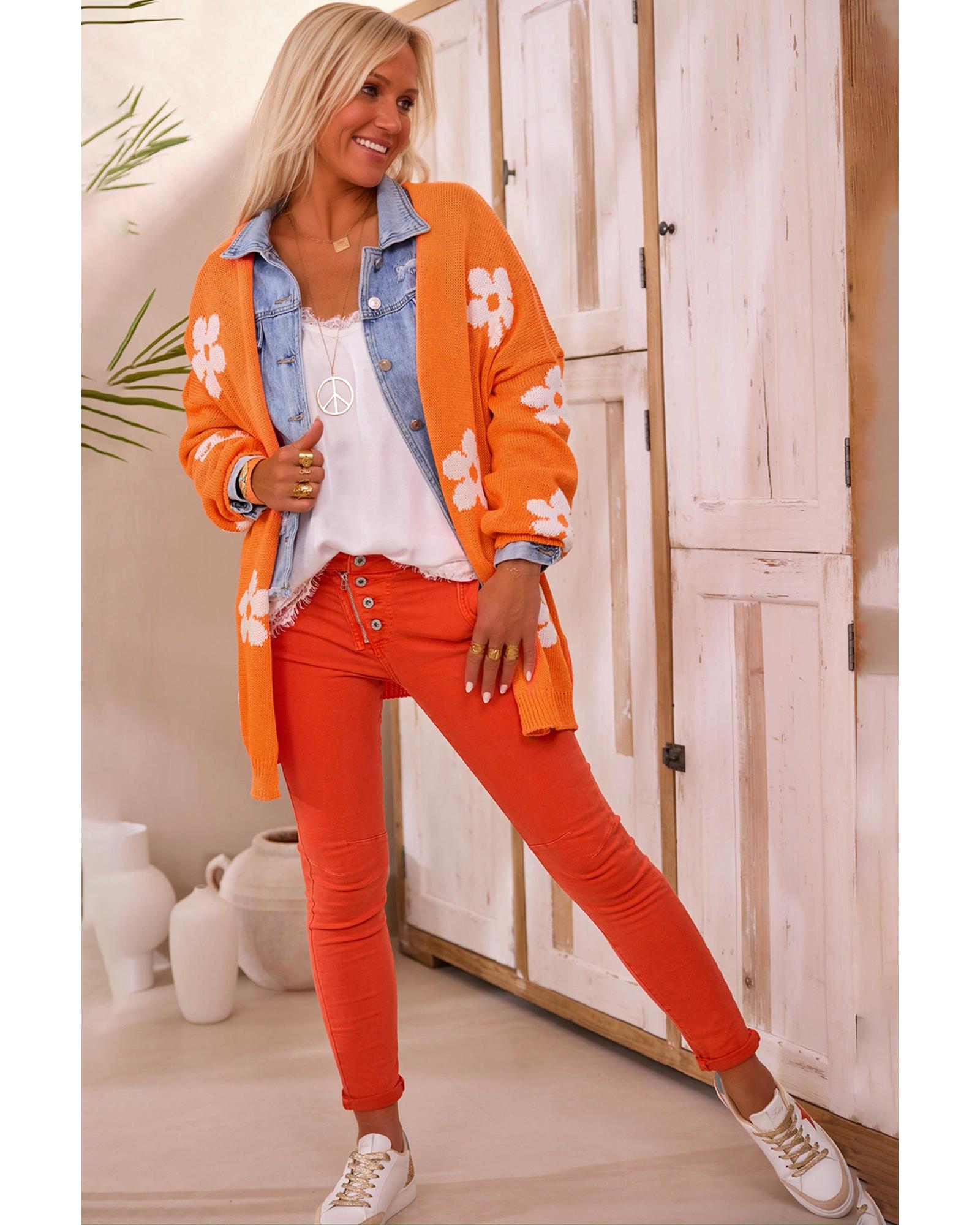 Orange Floral Print Knitted Open Front Loose Cardigan – S