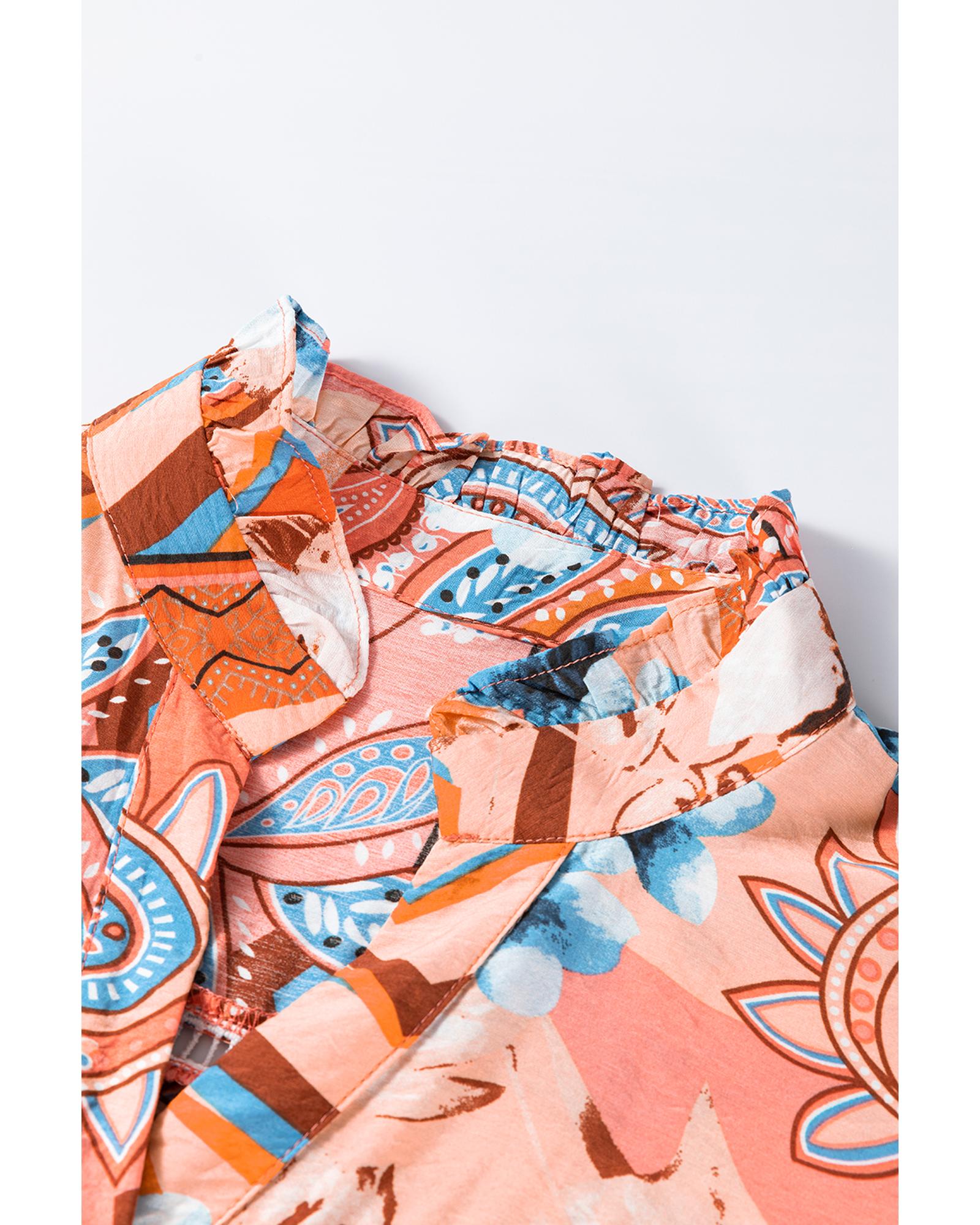 Orange Floral Print Shirred Cuff Buttoned Loose Shirt – L