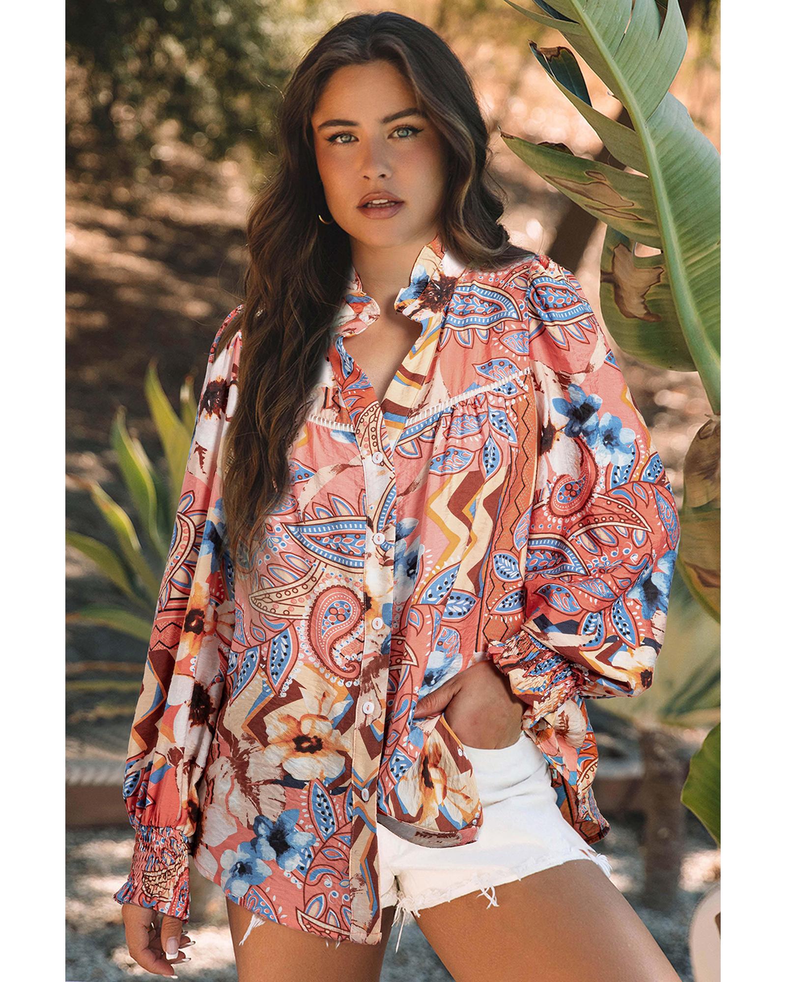 Orange Floral Print Shirred Cuff Buttoned Loose Shirt - S