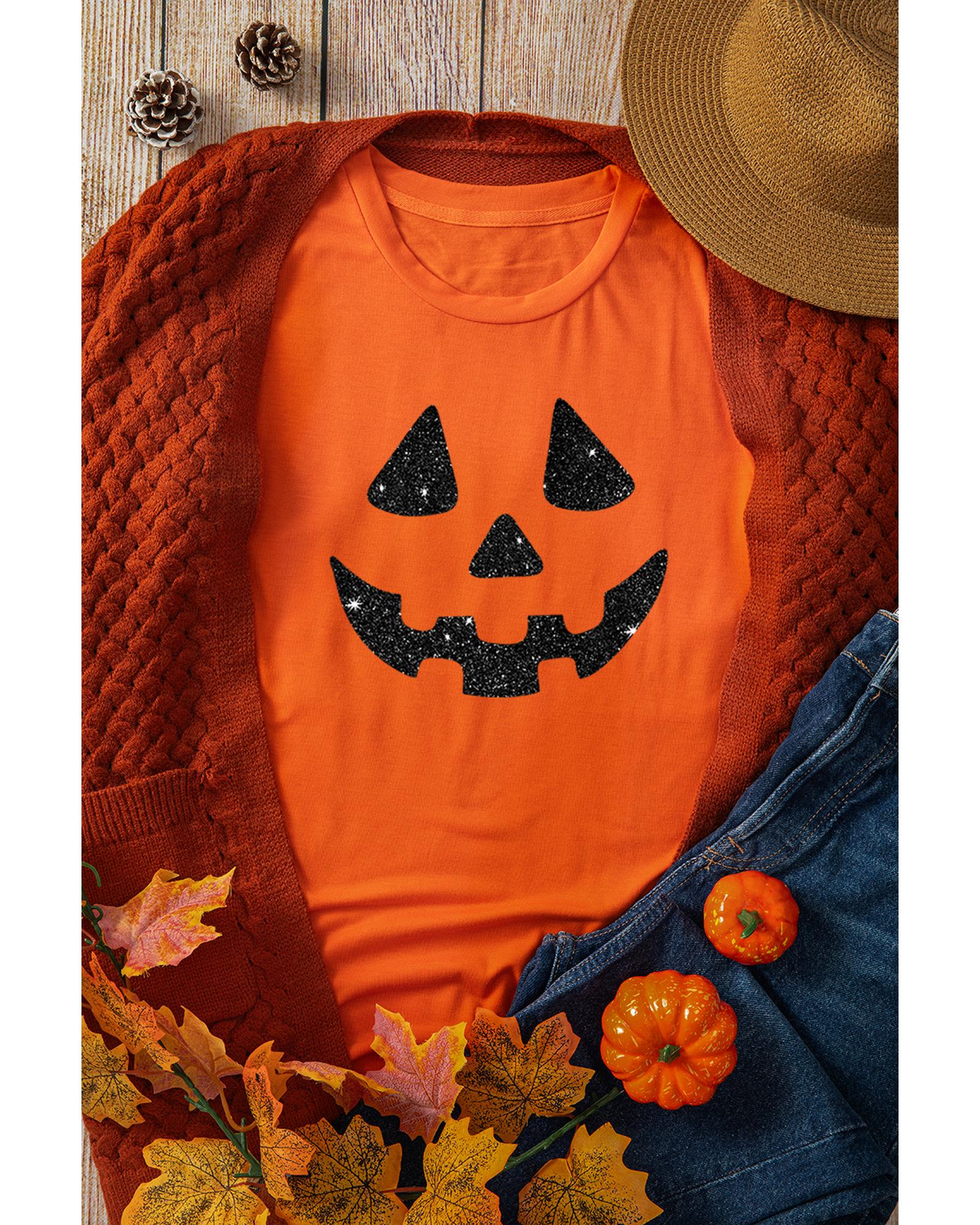 Orange Glittering Pumpkin Face Graphic Crewneck T Shirt – 3XL