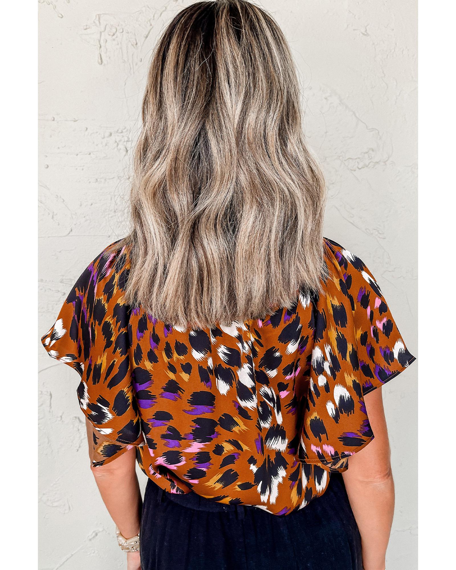 Orange Leopard Printed Draped Short Sleeve Slit V Neck Blouse – XL