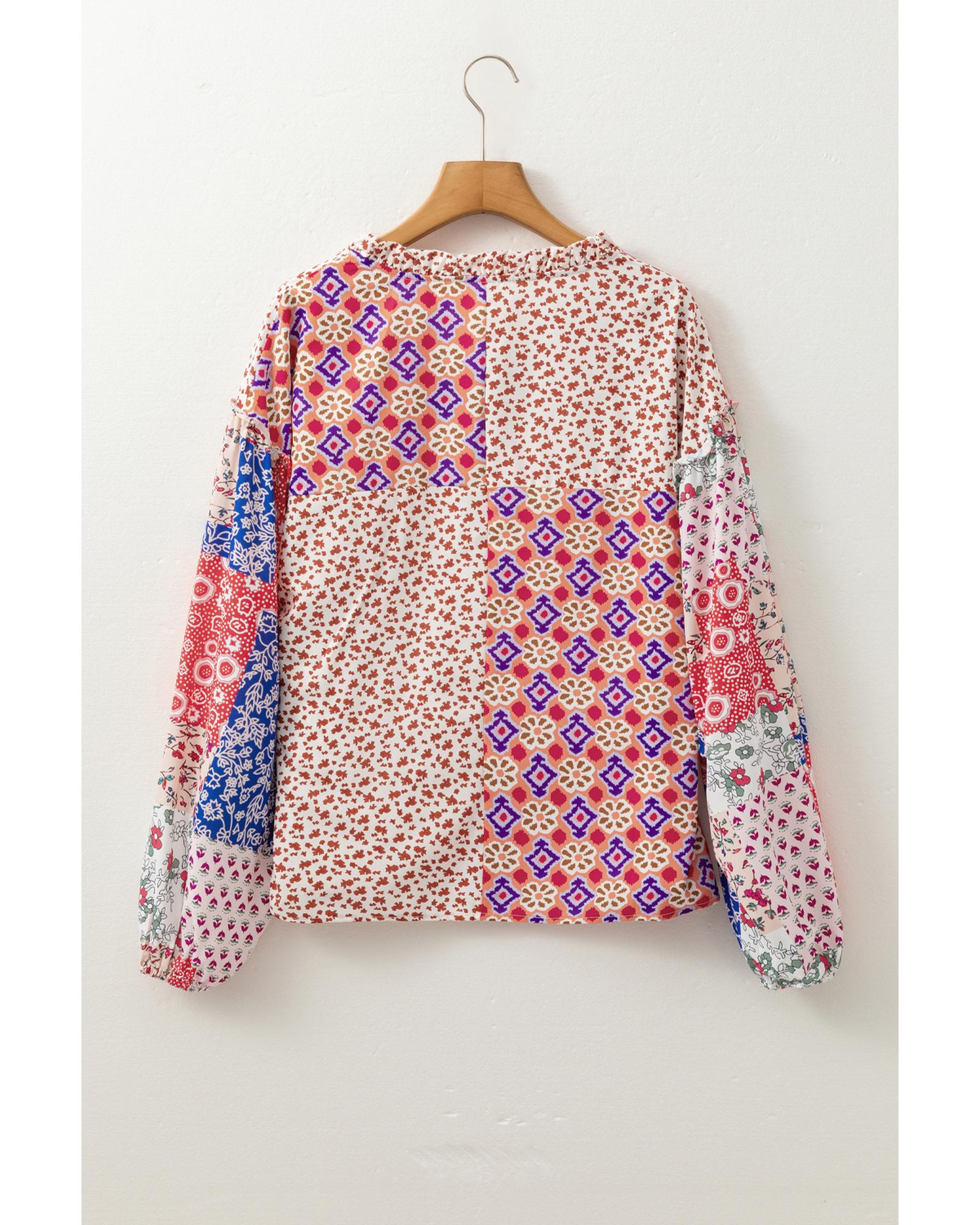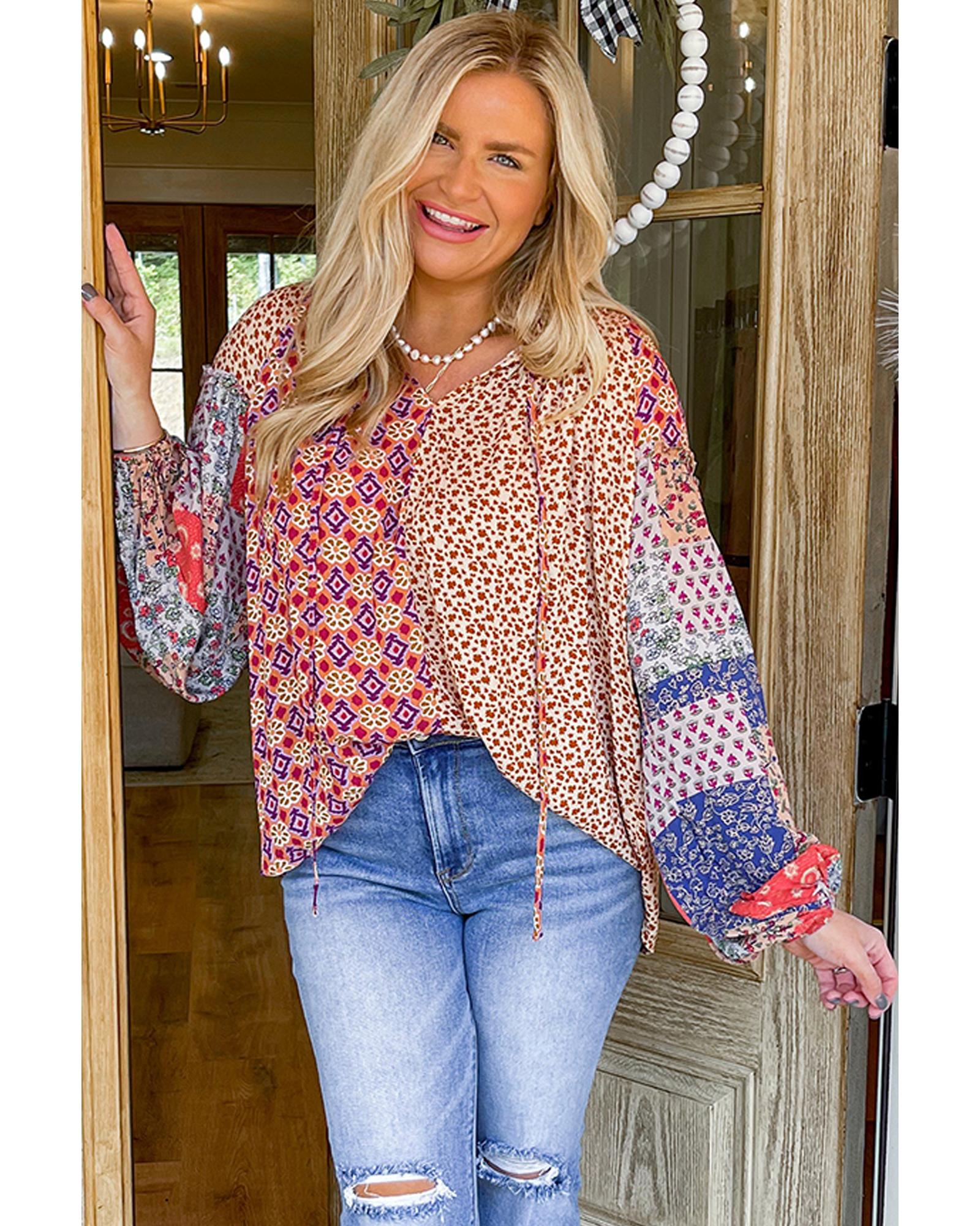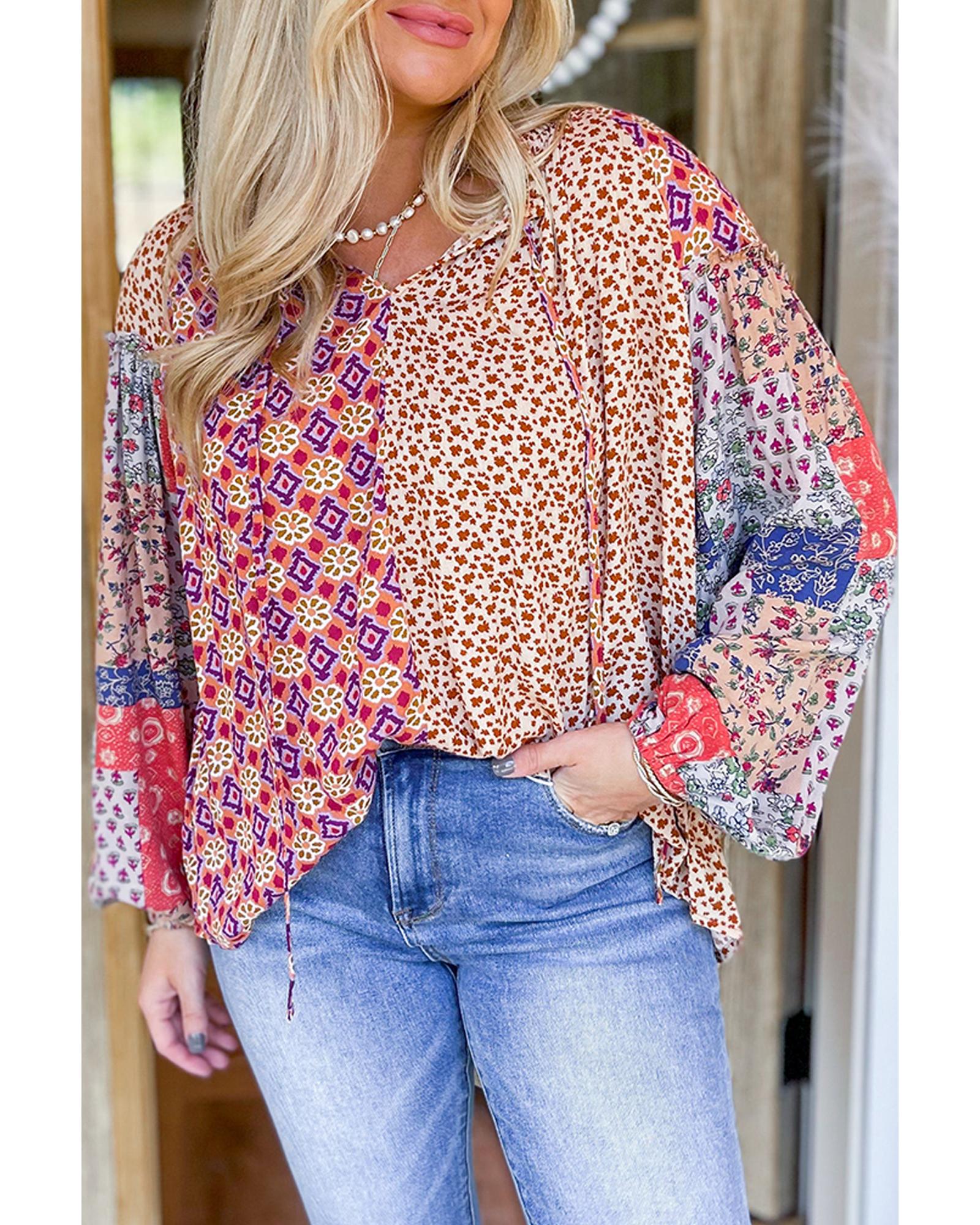 Orange Mixed Floral Printed Long Sleeve Tied V Neck Blouse – L