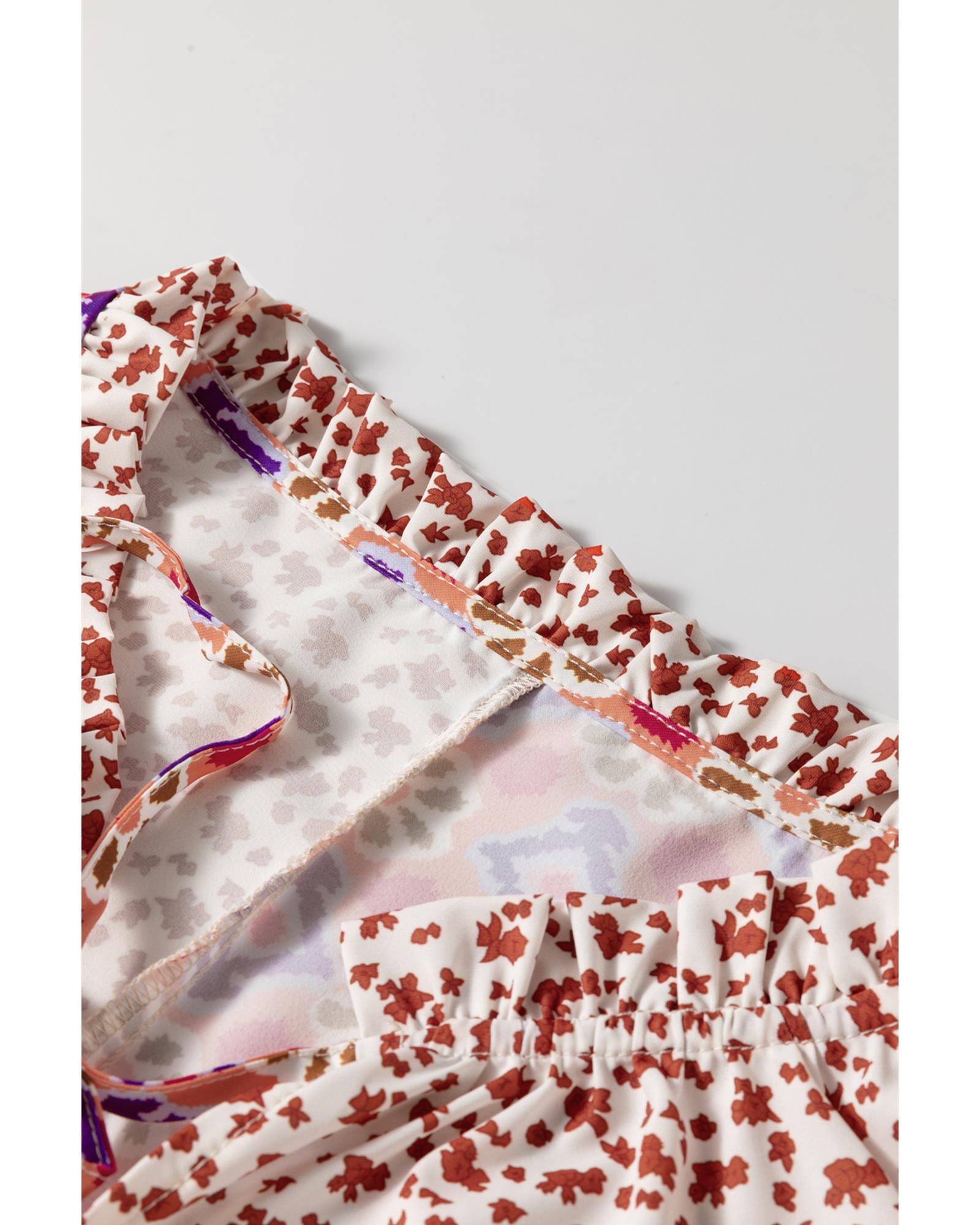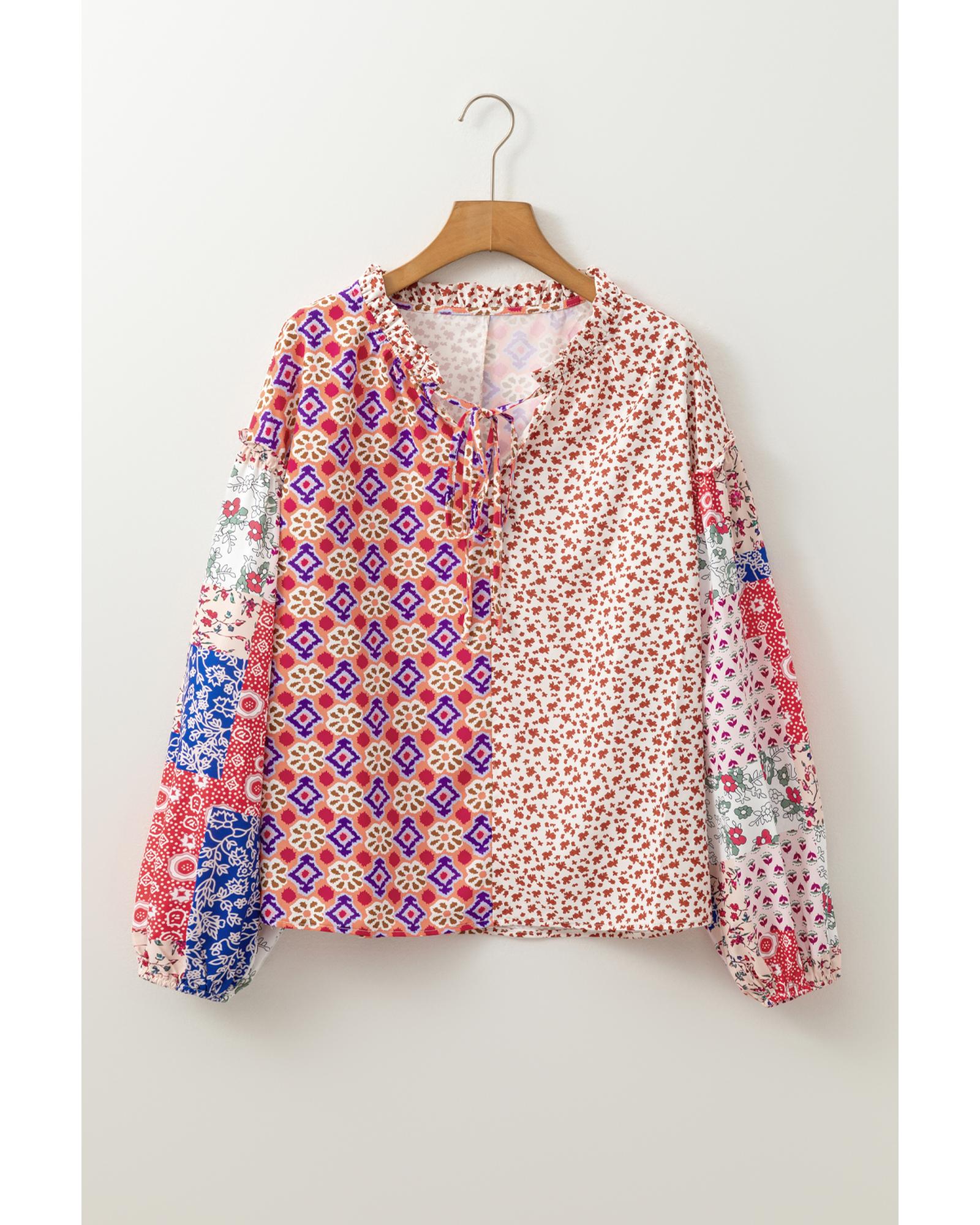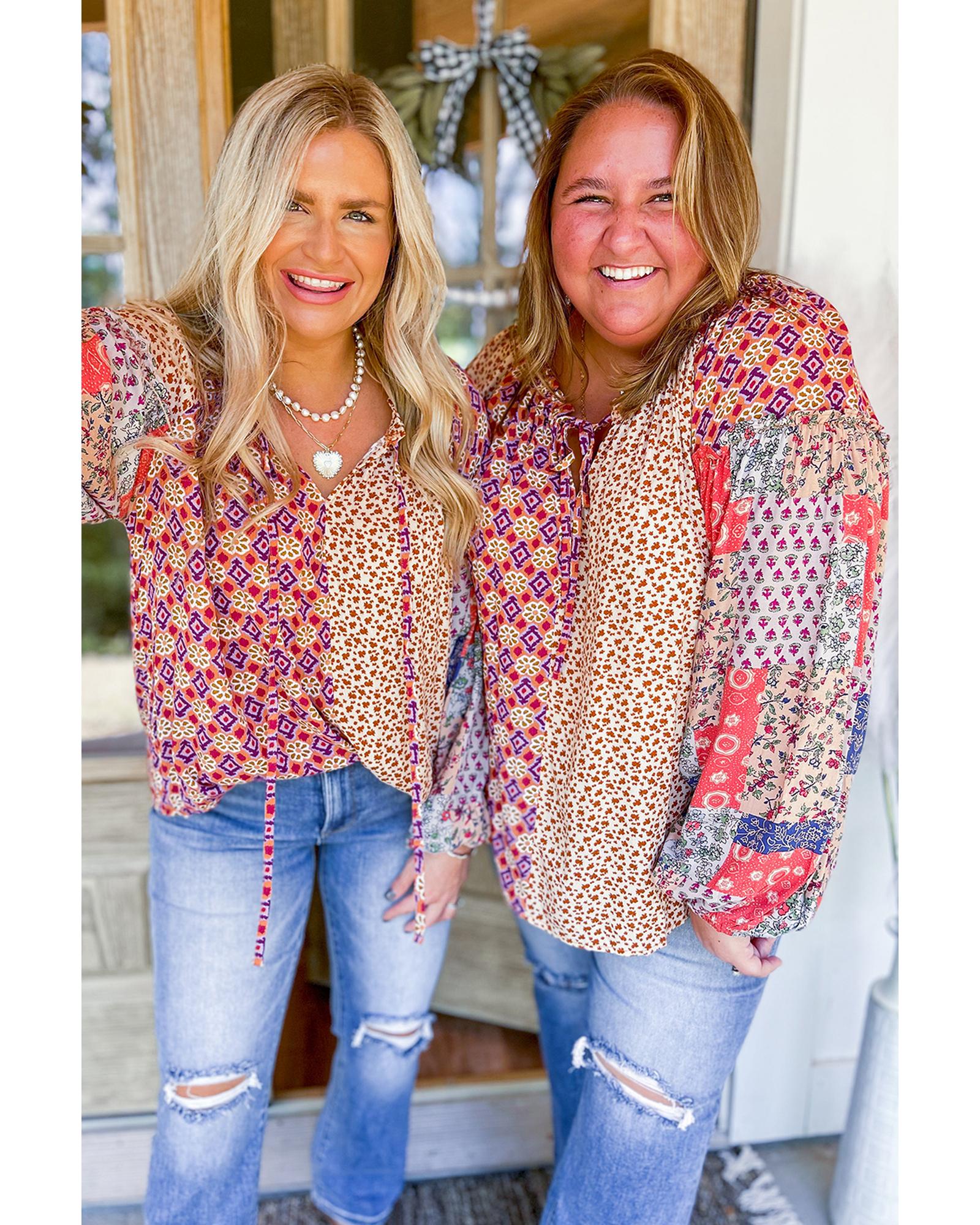 Orange Mixed Floral Printed Long Sleeve Tied V Neck Blouse – M
